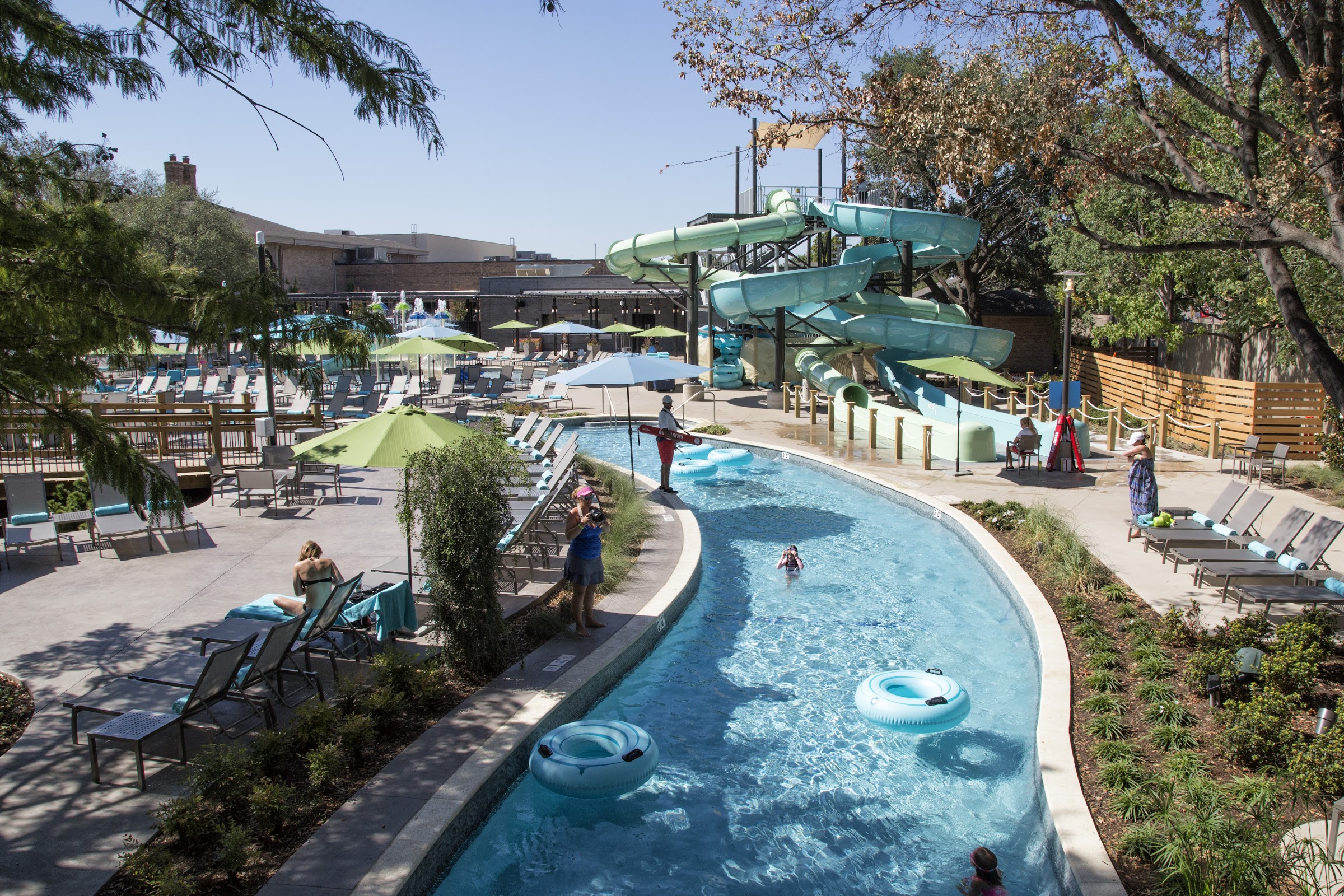 Pools and water park at a family-friendly hotel featuring slides and a lazy river.