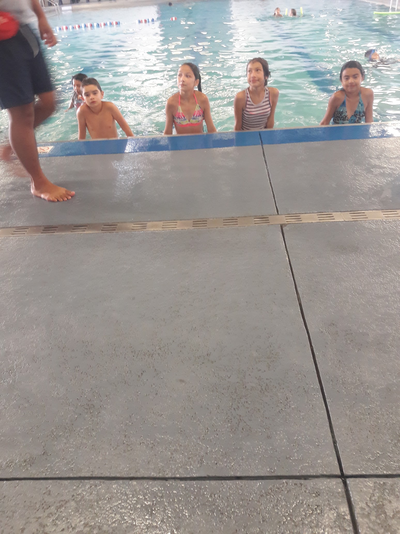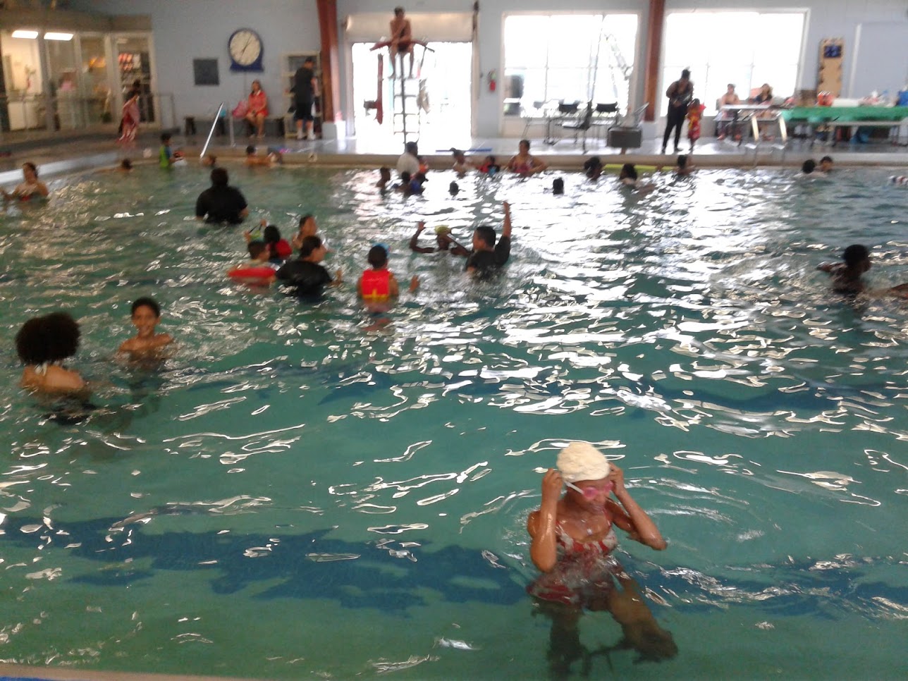 I came during lap swim. Not many people at all. Nice and clean. Water is checked every so often throughout the day. Always lifeguards on duty. They have life vests, paddle boards and floaties. Indoor heated pool that you can come to all year long.