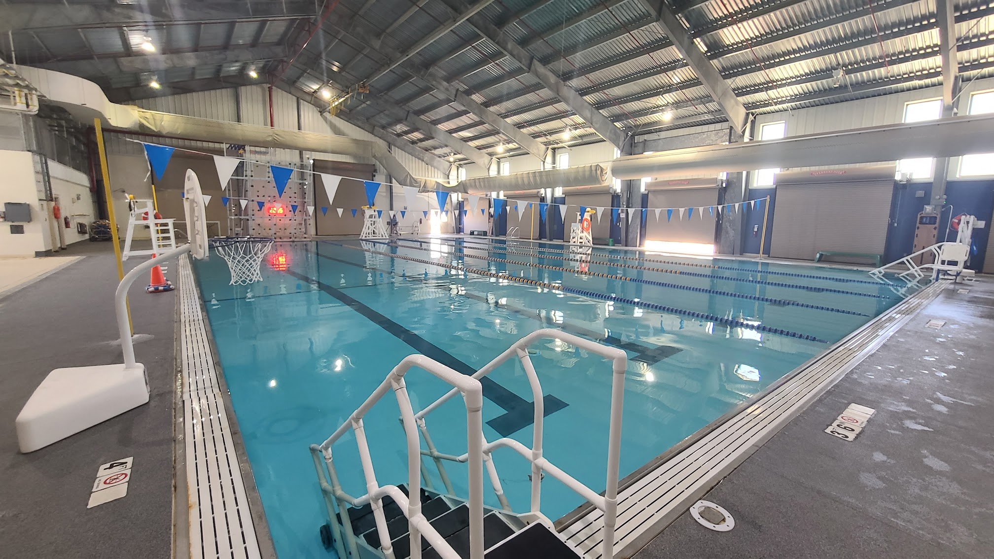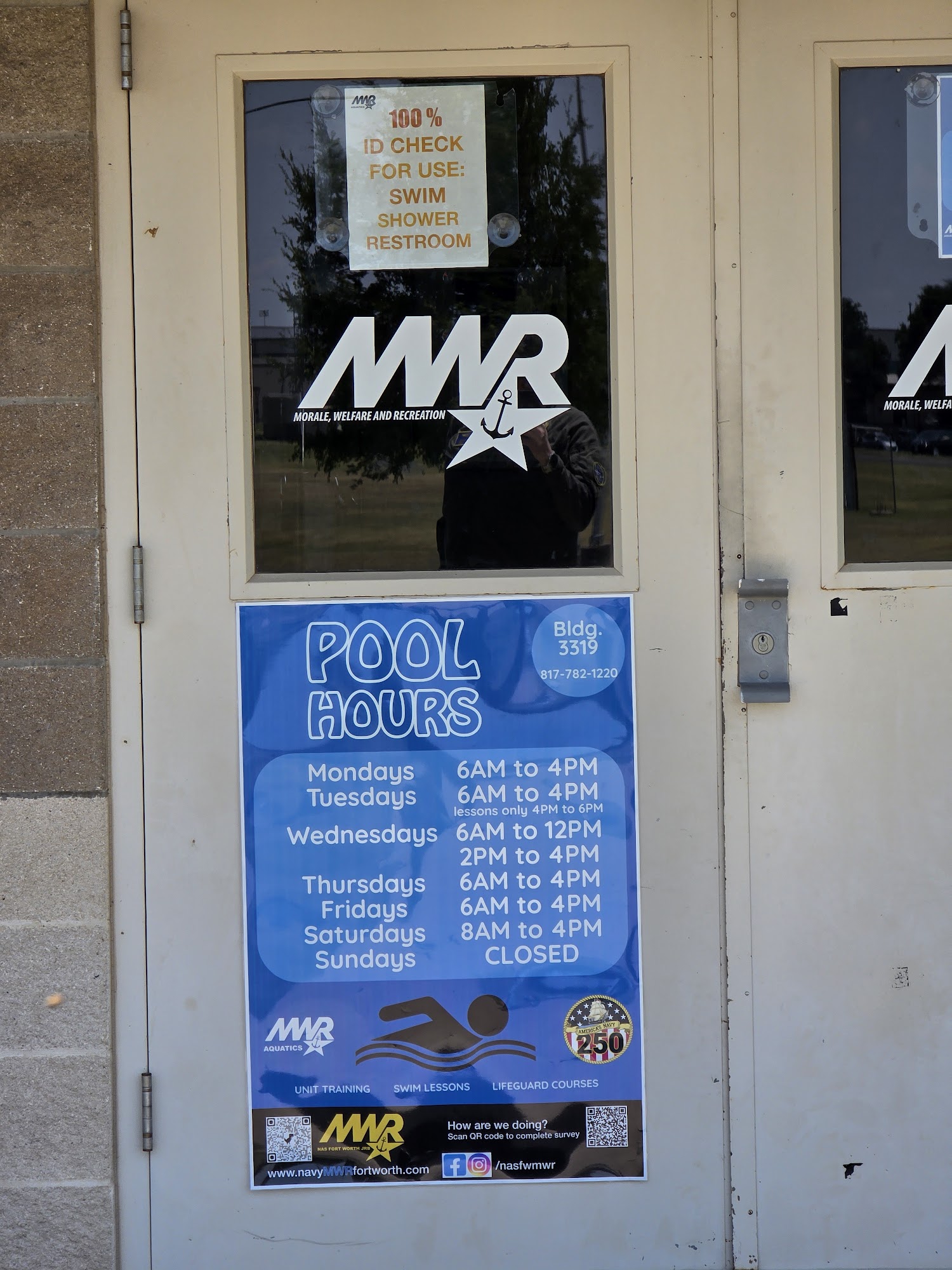 This pool is restricted use for those with military base access to the MWR facilities. It is a fantastic pool for swimming and fitness. The pool is always clean, the facility is always clean, and operated by professional people.