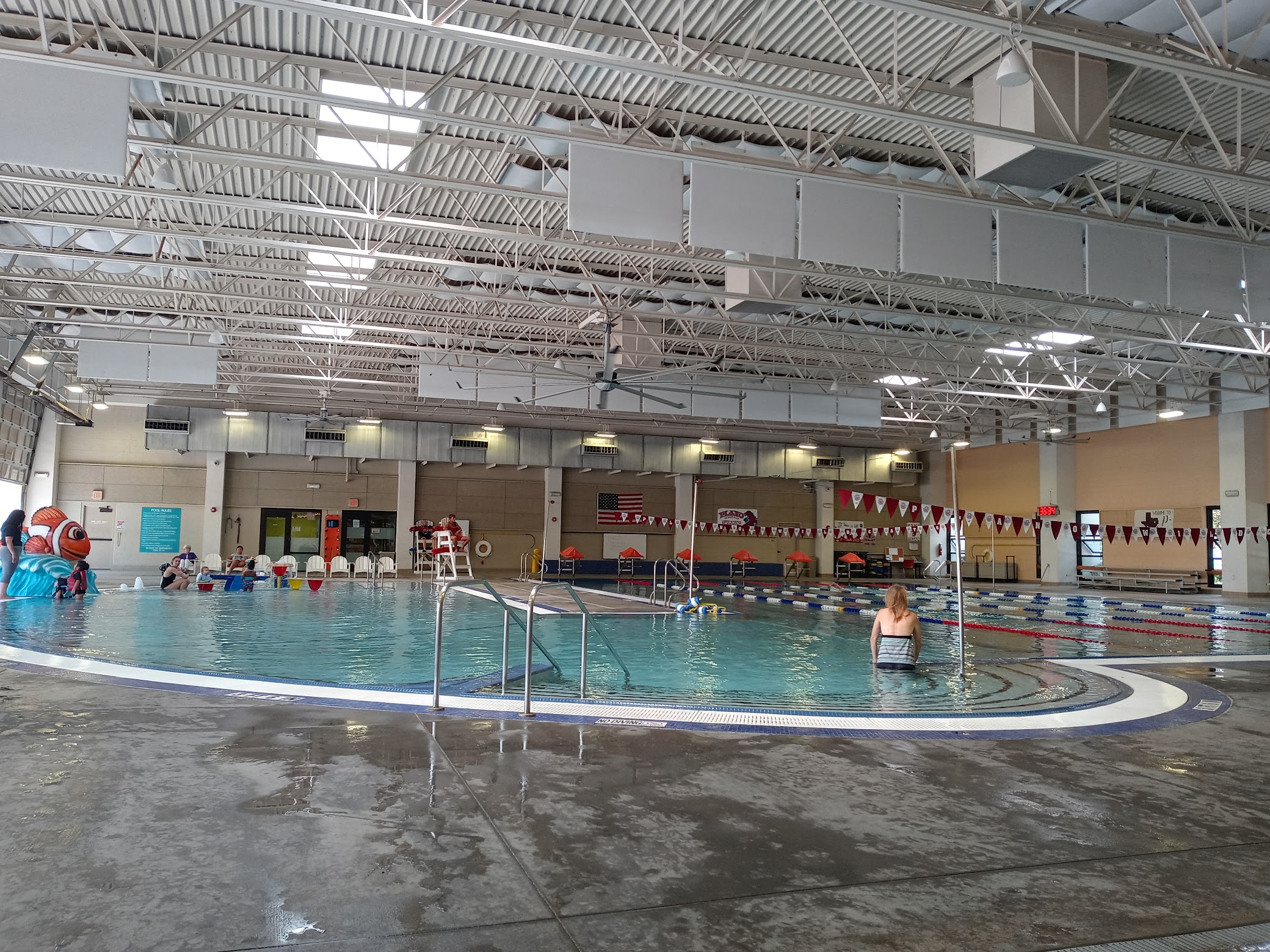 Family-friendly indoor and outdoor pool complex with a warm, saltwater-heated main pool, playground and splash pads, plus lap lanes.