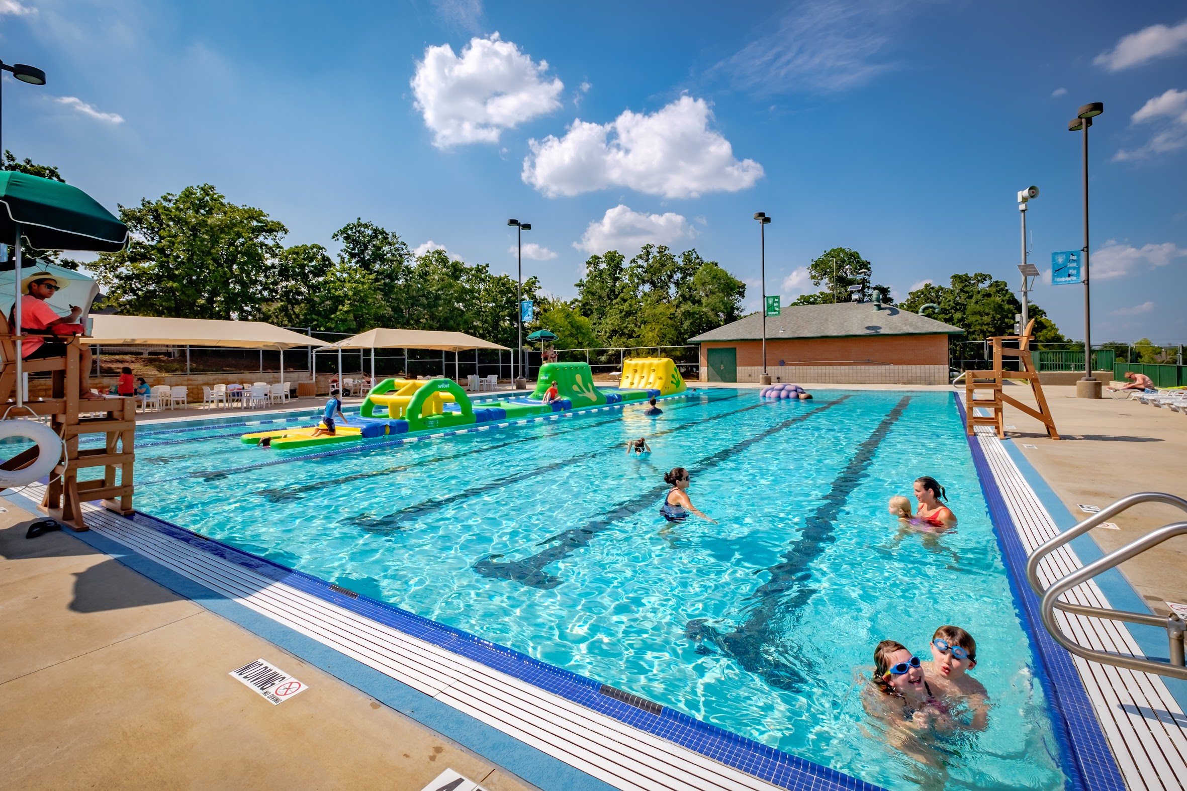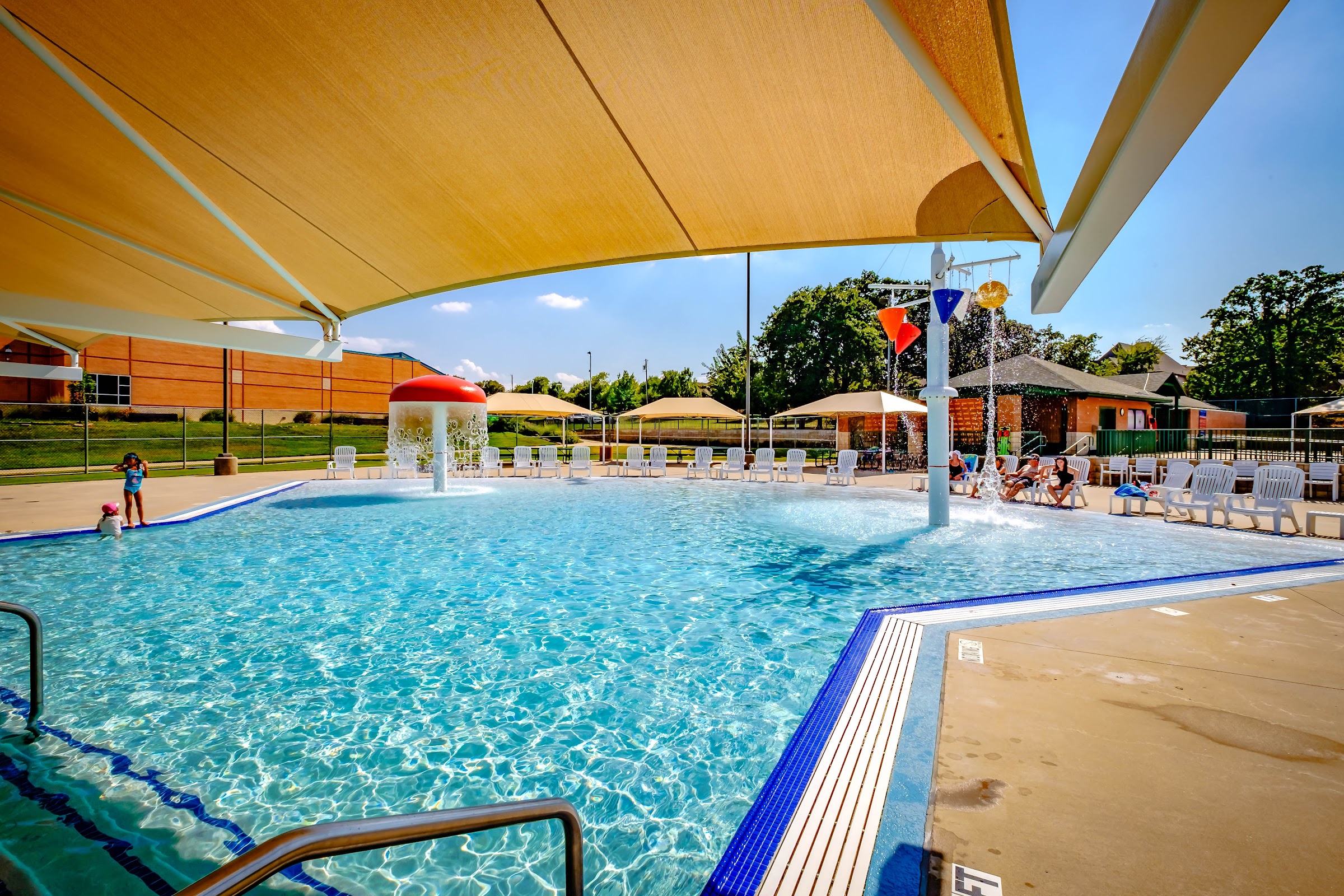 Shaded family-friendly facility featuring a lap area, an obstacle course and a splash area for the little ones.
