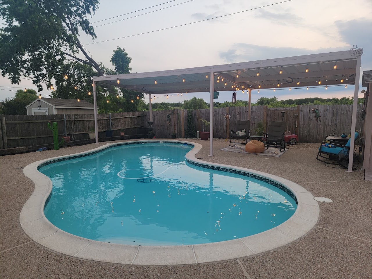 Swimply - The Spot Pool Rental, located at 1320 Gold Dust Ln, Saginaw, TX 76131, USA, offers a private backyard oasis available for hourly rental. This venue typically includes a range of amenities such as a heated main pool, a hot tub, a kiddie pool area, a diving board, a grill, a fire pit, Bluetooth speakers, and various shaded and sun loungers for a comfortable and private experience.
