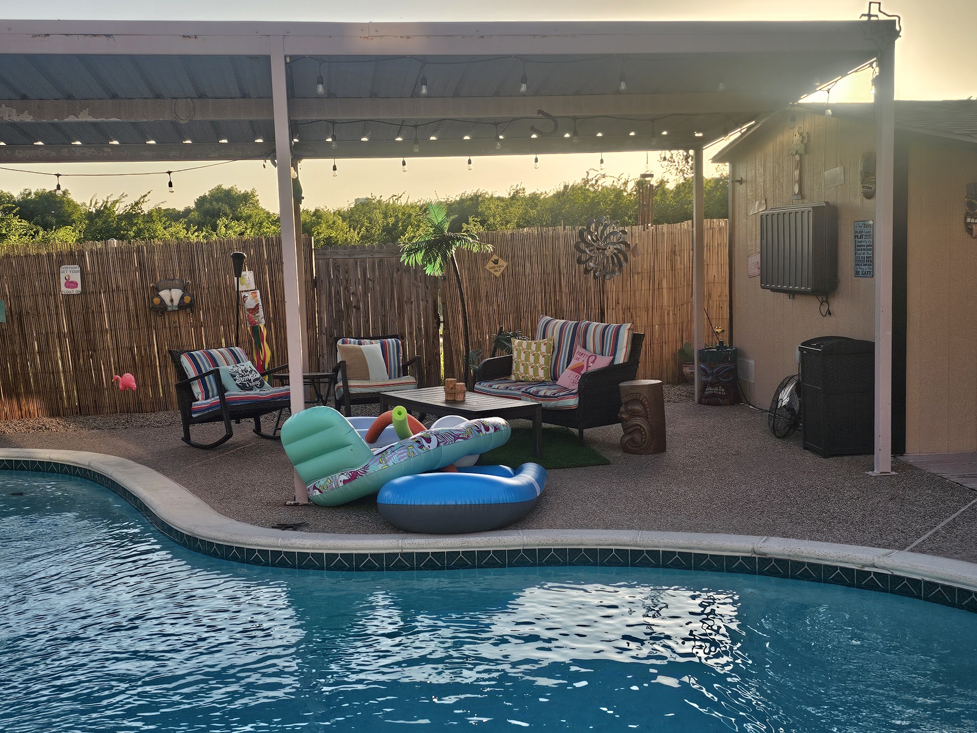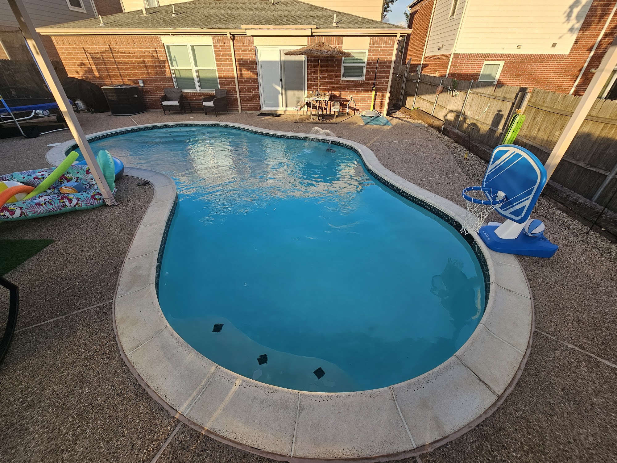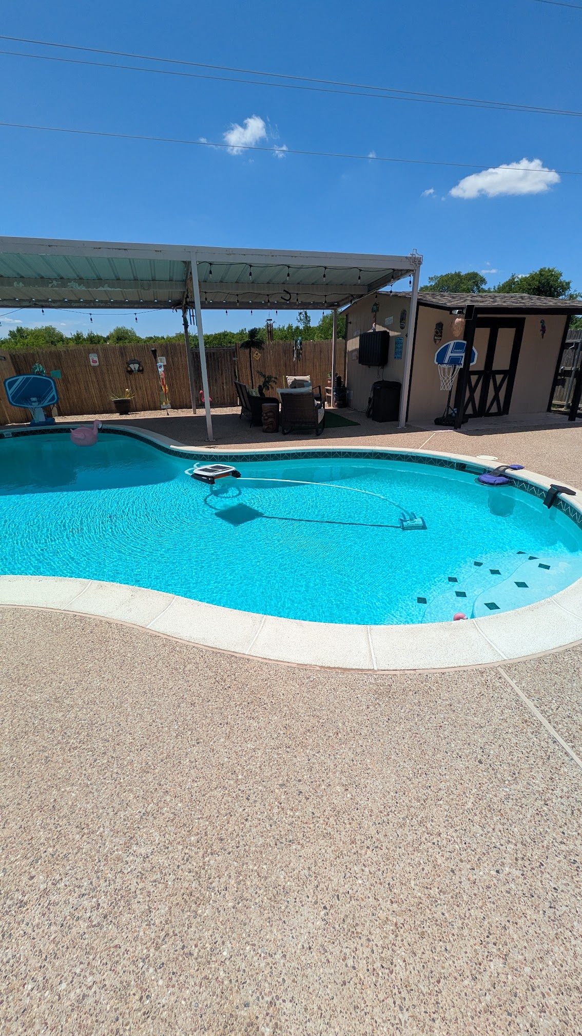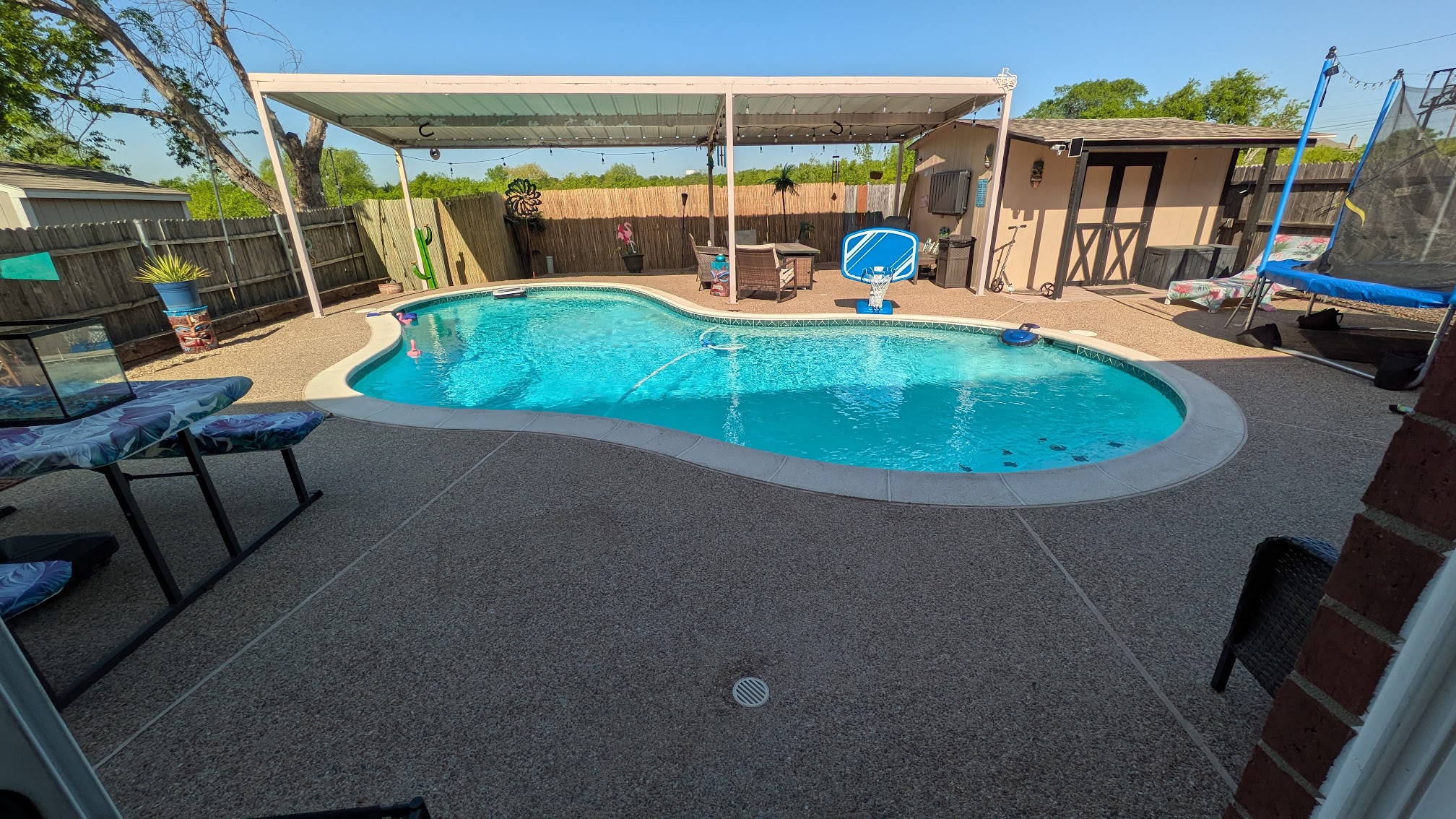 This particular pool is fabulous. The homeowners are wonderful. They provide towels and sunscreen. The pool is partially covered, so you can enjoy the water without being in the sun. Top-notch place and the only pool we rent now.