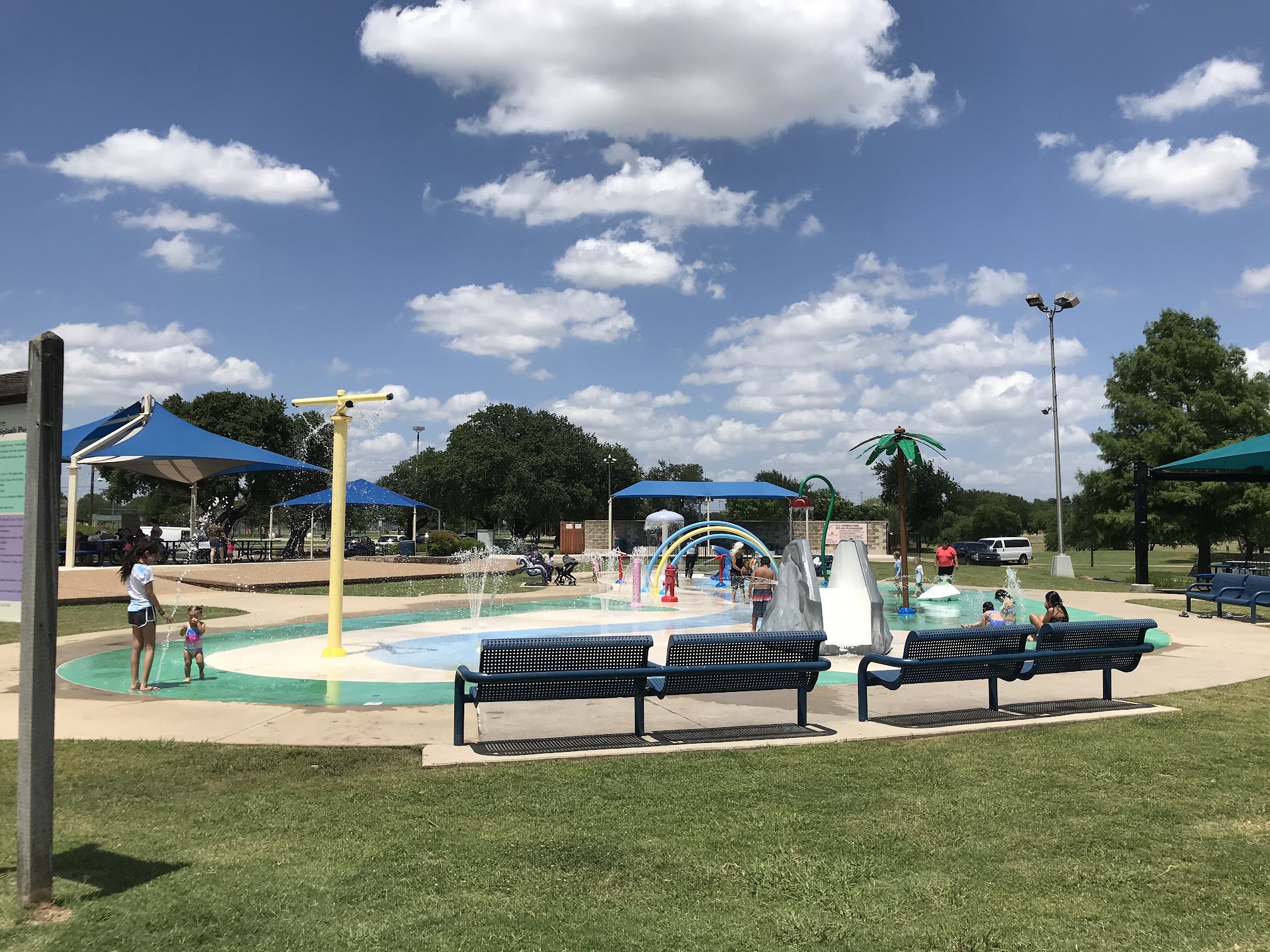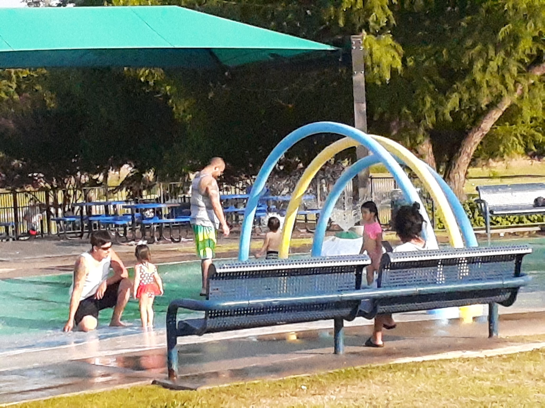 Fun splash pad that kept my littles entertained. There are lots of pic I tables and grills and some reserved doors for parties. Bathrooms were ok. There were kids there is all ages enjoying the splash pad. It was to hot to venture to the playground. We will definitely be back.