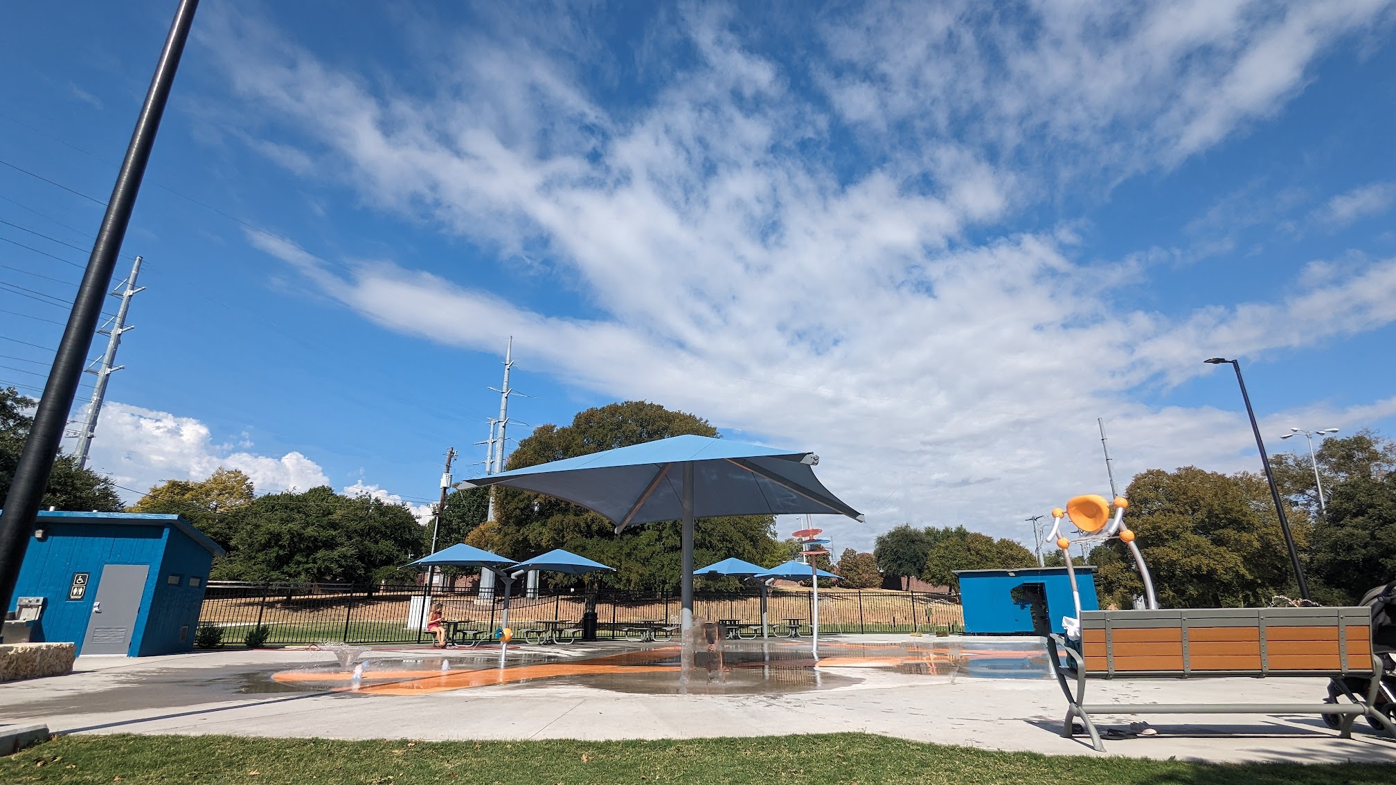 Cute little splash pad , more like for little baby's to toddlers. There's picnic tables w shade. Restroom as well. Lots of field to play and playground. Park is kept really clean, so let's keep it that way. Nice and beautiful. Free ,open to the public.