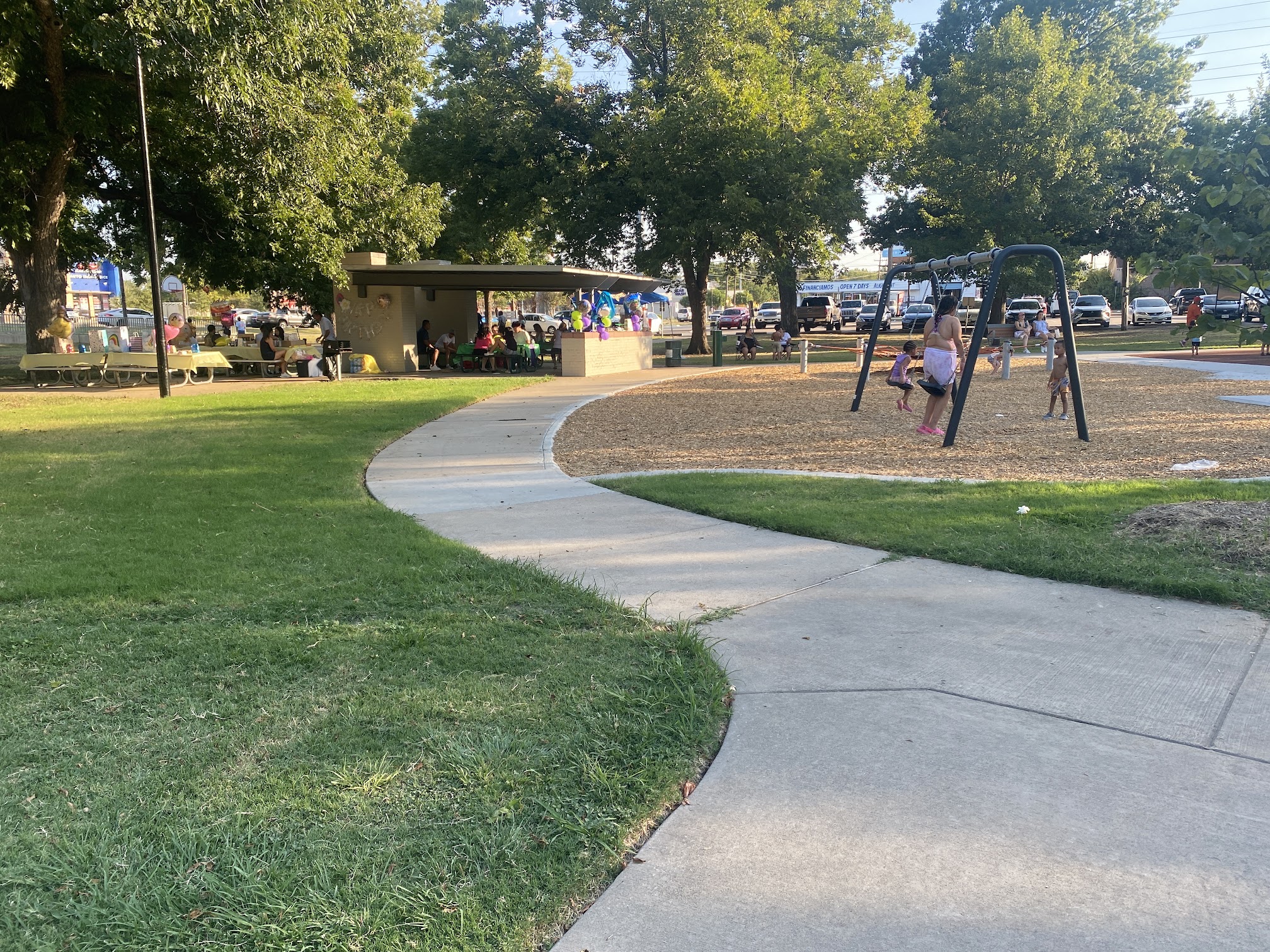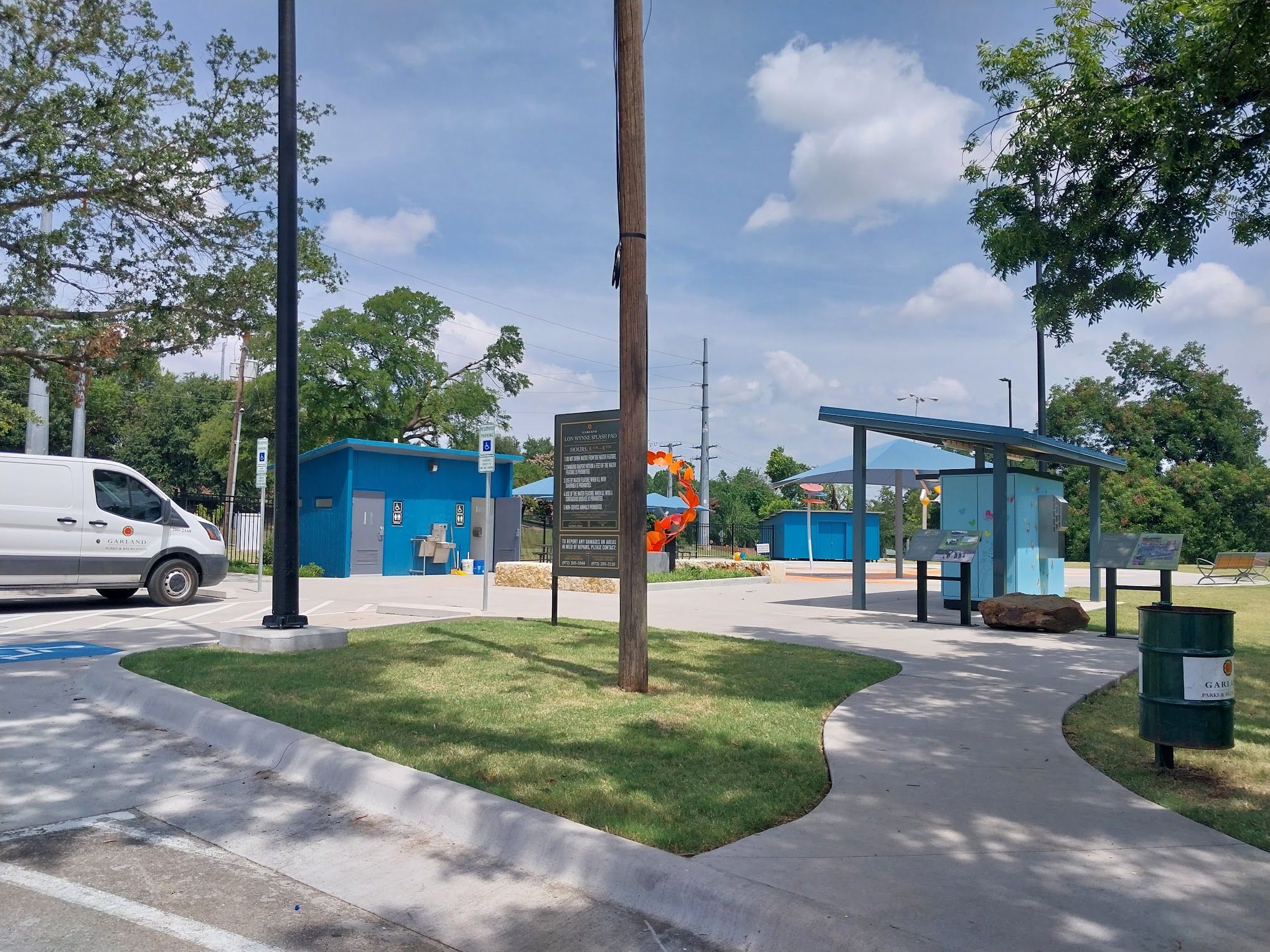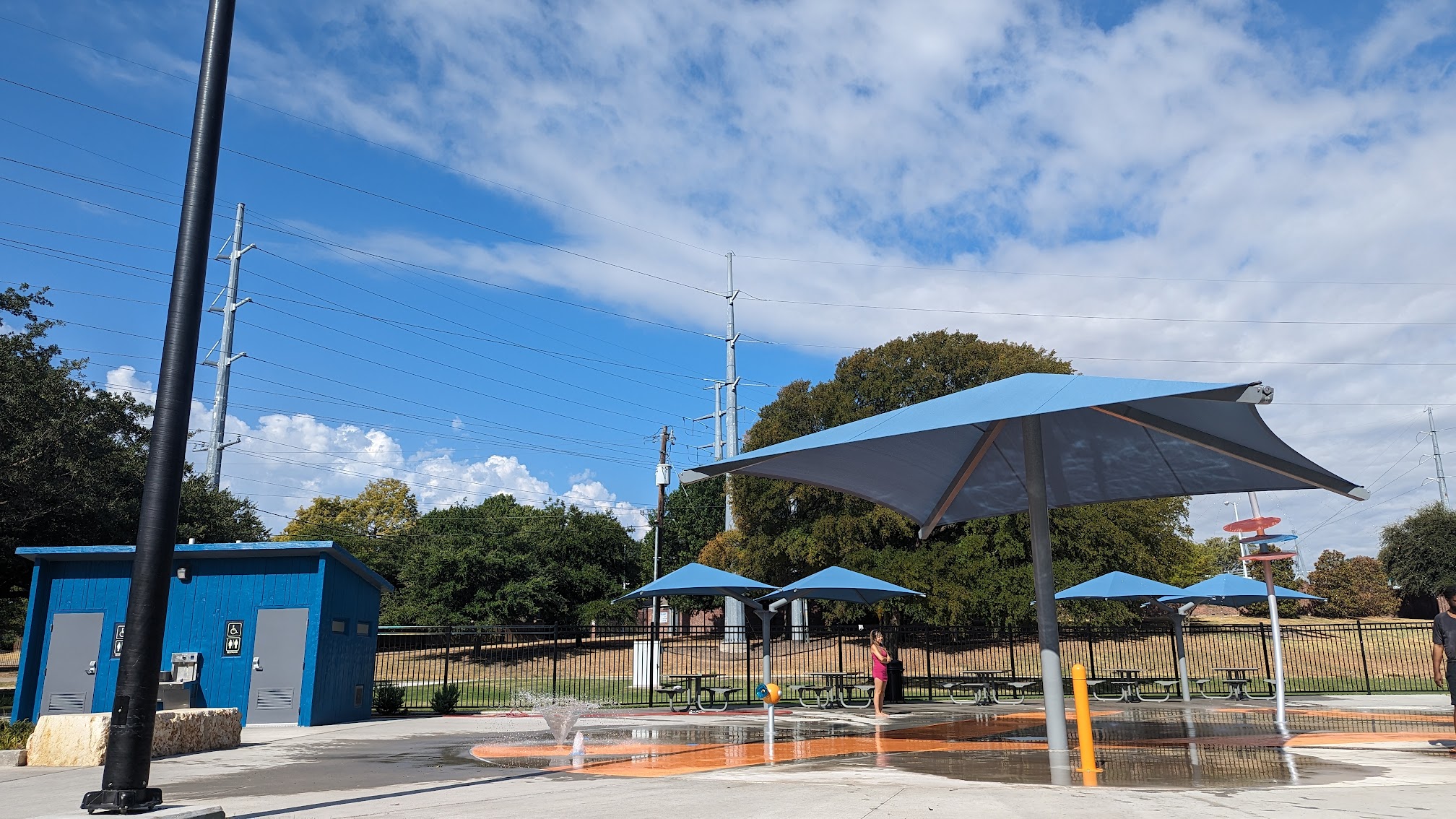 This is a pretty nice spot! The tables are new and nicely shaded. The big shade over the splash pad shades a large portion of the area. It was all very clean. There’s a nice playground and basketball court as well as lots of picnic tables around the trees.