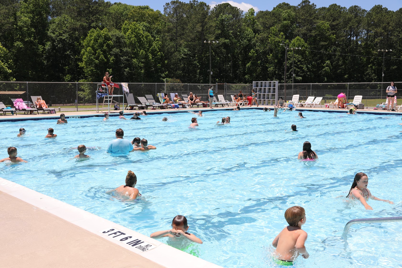 We went on father's day and it was not very crowded. They do not have a diving board but they do have a slide a water slide. The close the slide down every 15-20 minutes so that there can be free swimming in the deep end