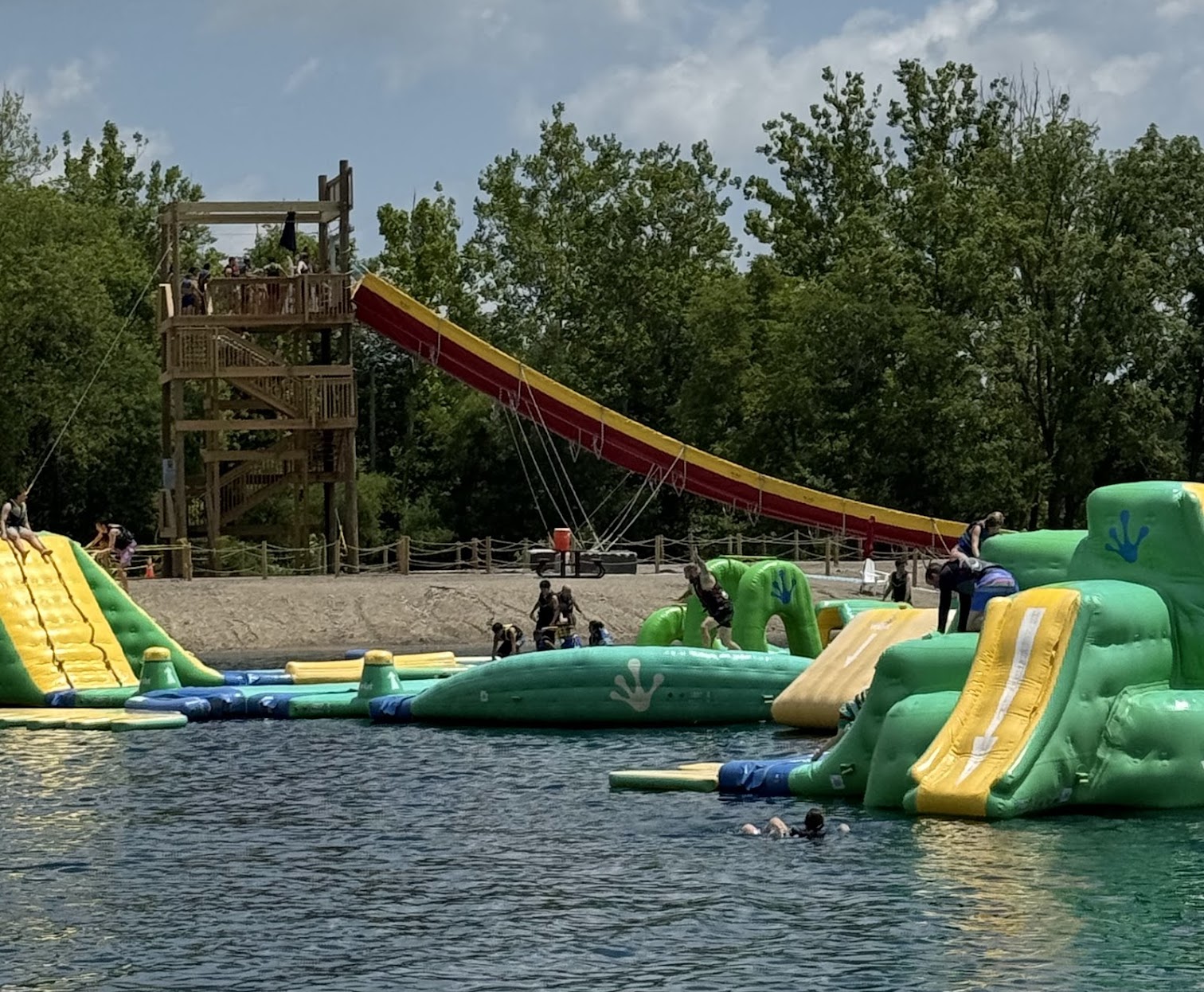 Overall this place was a fun experience. My niece selected this place to celebrate her birthday. The obstacle course is fun and challenging. They provid you with a life vest. It MUST be worn anytime you are in the water this includes standing on the edge. This is strictly enforced. For the most part the staff is friendly. The warm was warm. It is filtered and died blue. They have plenty of lounge chairs to sit in. They also offer cabanas you can rent out. You can rent kayaks. There is a little kiddies section for the little kiddos. I like the different photo opps they had set up to take photos. Plenty of picnic tables to eat at. We went on Sunday. When we arrived it at 11 when it opened it wasn't crowded at all. As the day went on, more people came. Overall it wasn't overly crowded and you were still able to enjoy yourself without huge crowds. ✨️A few things to note: Parking is extra No outside food or drinks are allowed in. They do check your bags. They do sell food. In my opinion it is a bit overpriced. I got the pretzel bites and it was $9 for 8 little bites. The cheese was extra. If food is not allowed to be brought it, the cost of the food could be a little bit more reasonable in price. If you plan to be there all day and eat just be prepared to drop a good chunk of change. The "sand" was extremely hot, I suggest having flip flops or water shoes. You are charged a service fee of $5. In my opinion the cost of a ticket doesn't meet the value of what is offered. Compared to other water parks at the same price point.