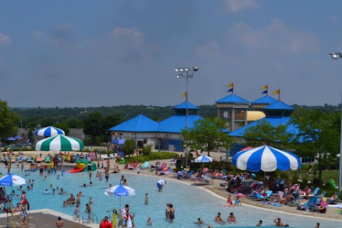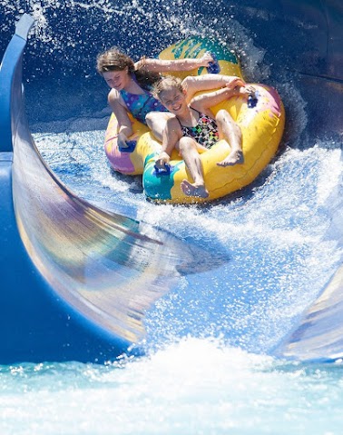 Clean water park offering multiple types of slides, as well as a climbing wall, a diving board and volleyball.