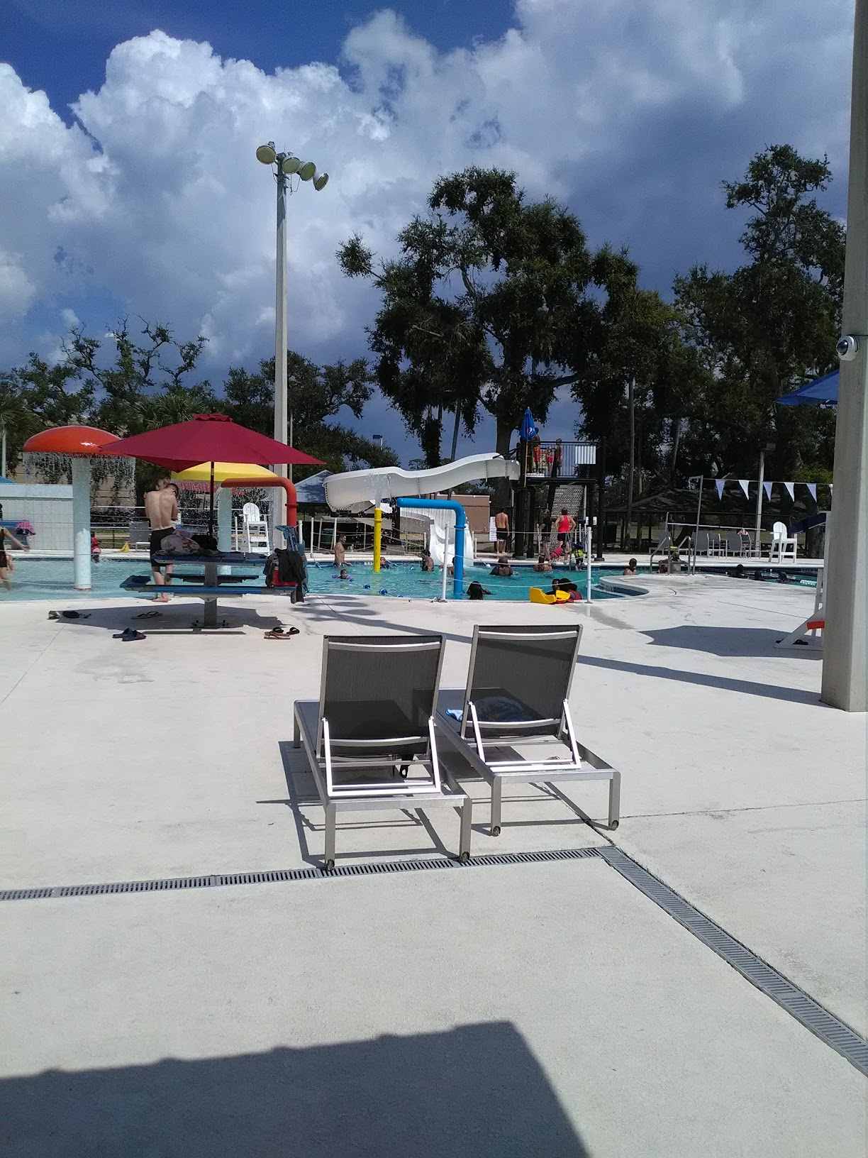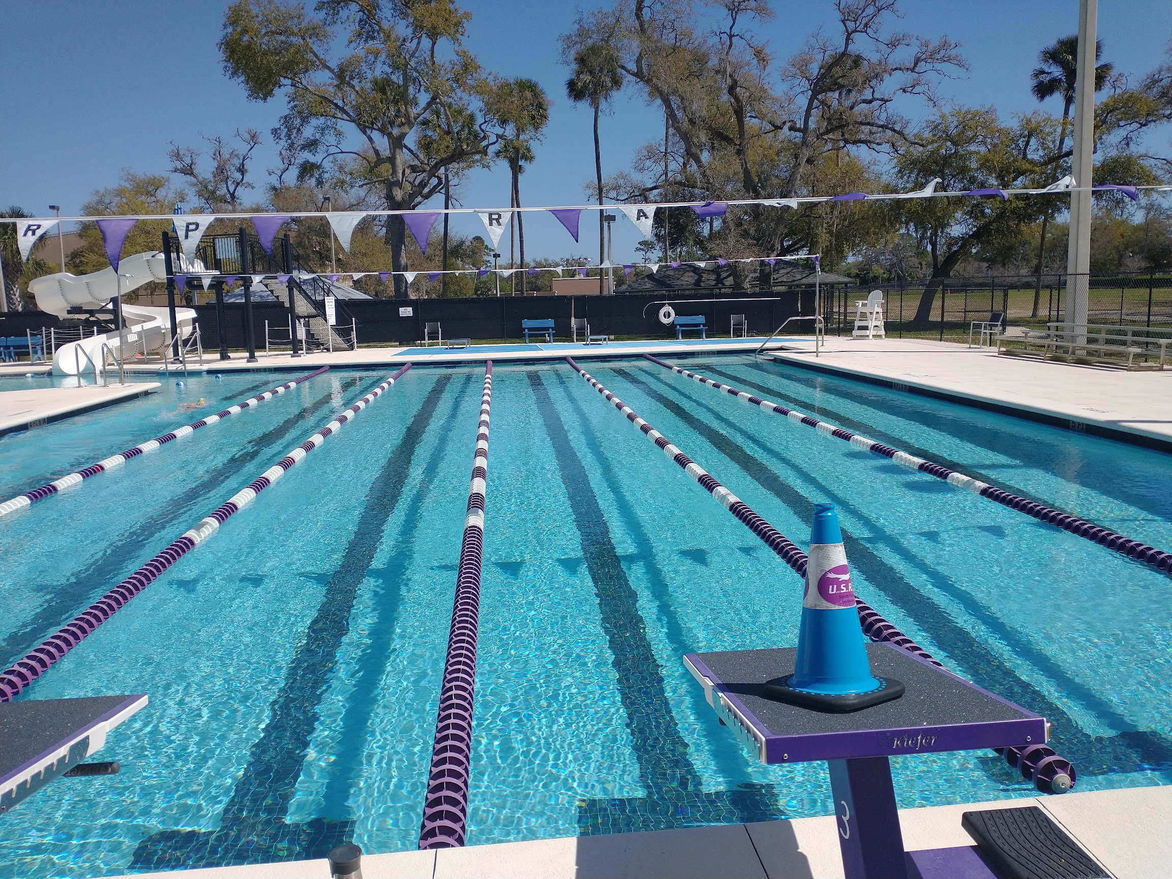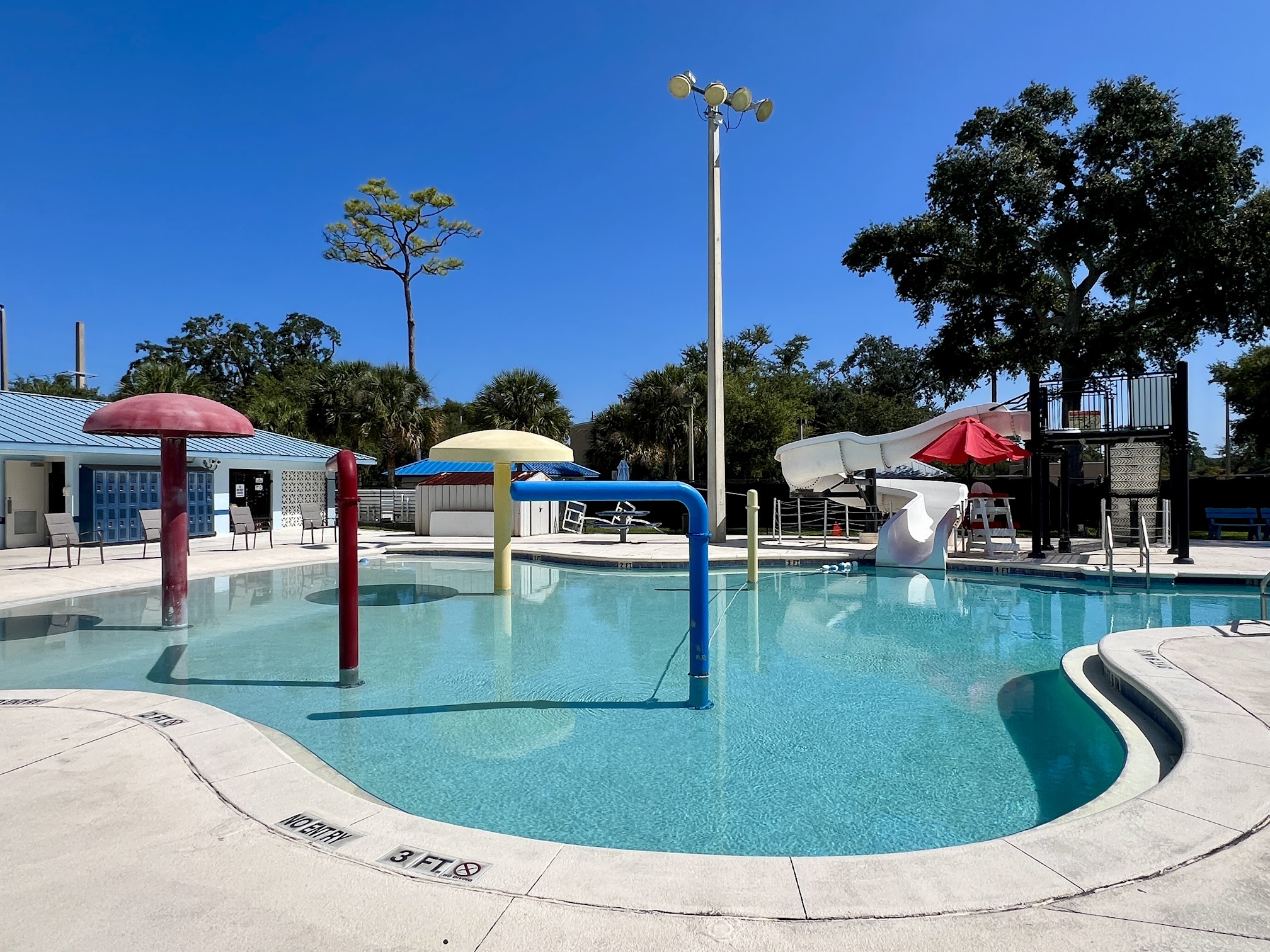 I went to the Cypress Aquatic Center here in Daytona Beach to swim my laps today. I had been looking for a new outdoor pool to do my swimming training in, without having to sign up for a typical restrictive membership and all the blah blah blah that goes with it, at the other ‘commercial’ facilities. I was surprised to find this great facility, and also the other Daytona Beach municipal pool, which is called the Campbell Aquatic Center, which also looked good, but has limited days that it’s open. This Cypress pool turned out to be just perfect for me, it’s super clean, I was the only one there at 10AM when they open, and the manager and lifeguards were incredibly helpful and friendly. I immediately felt right at home, and that felt great. As you can see from the photos, they also have a super kids splash / swimming area, and they can turn on the waterslide whenever kids (or us retirees, when we want to act like kids again 😀), want to take a spin down it. (Maybe a great place for a kids party?) On the side of the pool, they have two nice larger covered seating areas with picnic tables that make it very comfortable to relax out of the sun, before or after your swim, if you choose to do that. The male & female change rooms don’t have showers, but there are two outdoor showers for use before or after your swim, plus one single private ‘family’ change room which does have a single shower in it, complete with seating bench. There’s also a baby changing table in there. Swim teams do use the pool between 2PM & around 5PM as I understand, but they still leave two lap lanes open for public use even then. If you’re looking for a nice outdoor pool to swim in, I would encourage you to check out the Cyprus Aquatic Center. I’m not sure how busy it is in the afternoons or on the weekends, but between 10AM and noon weekdays, it appears very under-utilized, and so offers tons of opportunity for swimmers or floaters to spend time there enjoying the pools. Oh, and just in case you were wondering - yes, it’s even heated for winter swimming, how cool is that?!
