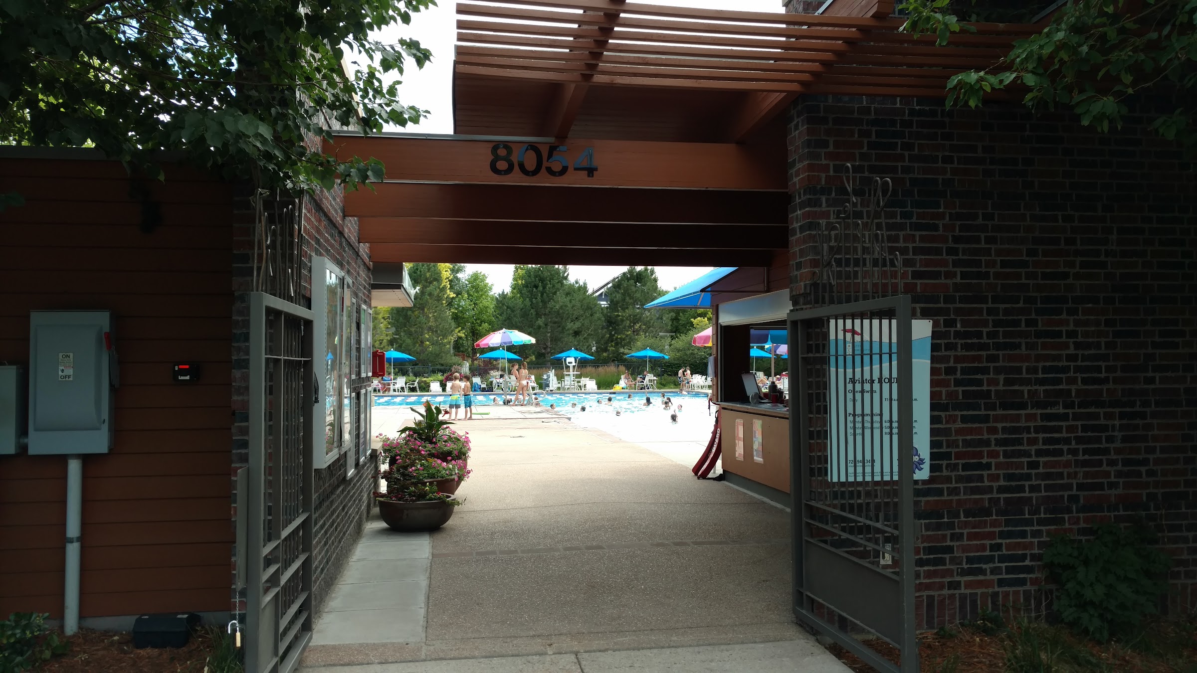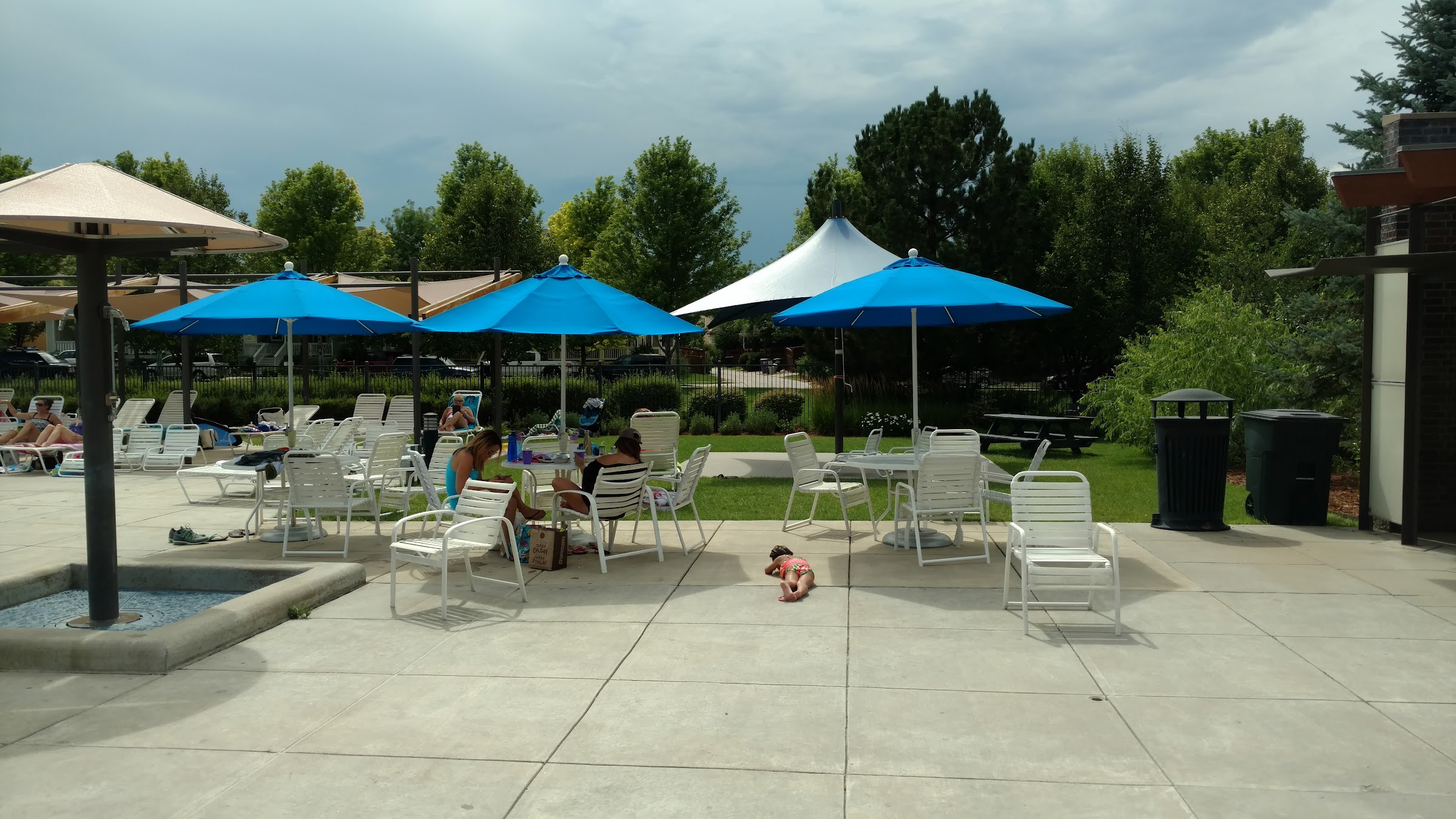The busiest pool in Stapleton, and the oldest. A lot of seating, but it gets busy. Has a 12 ft. area, two lap lanes, and a gradual entry. Concessions during adult swim, 45 to 00 each hour.