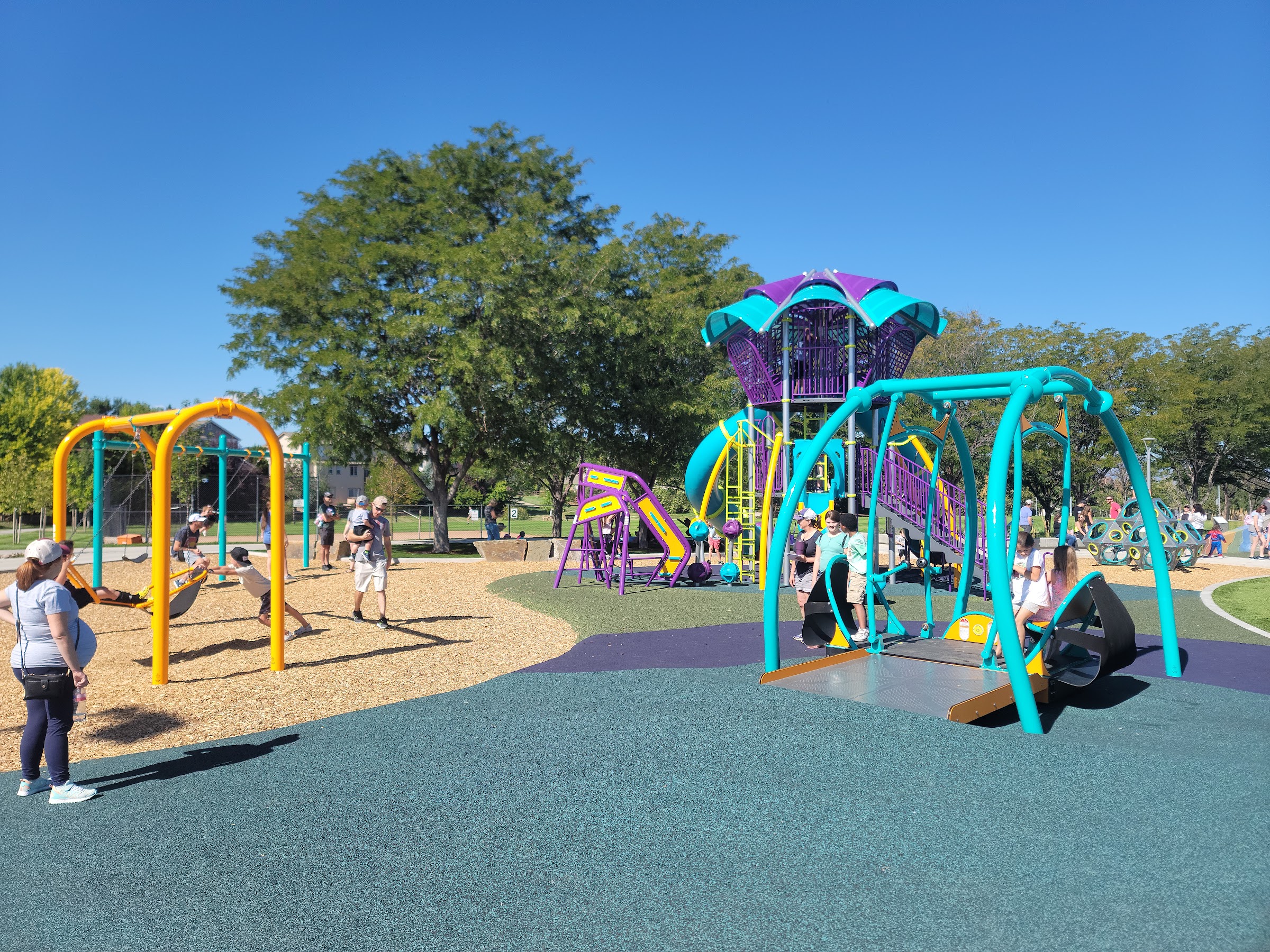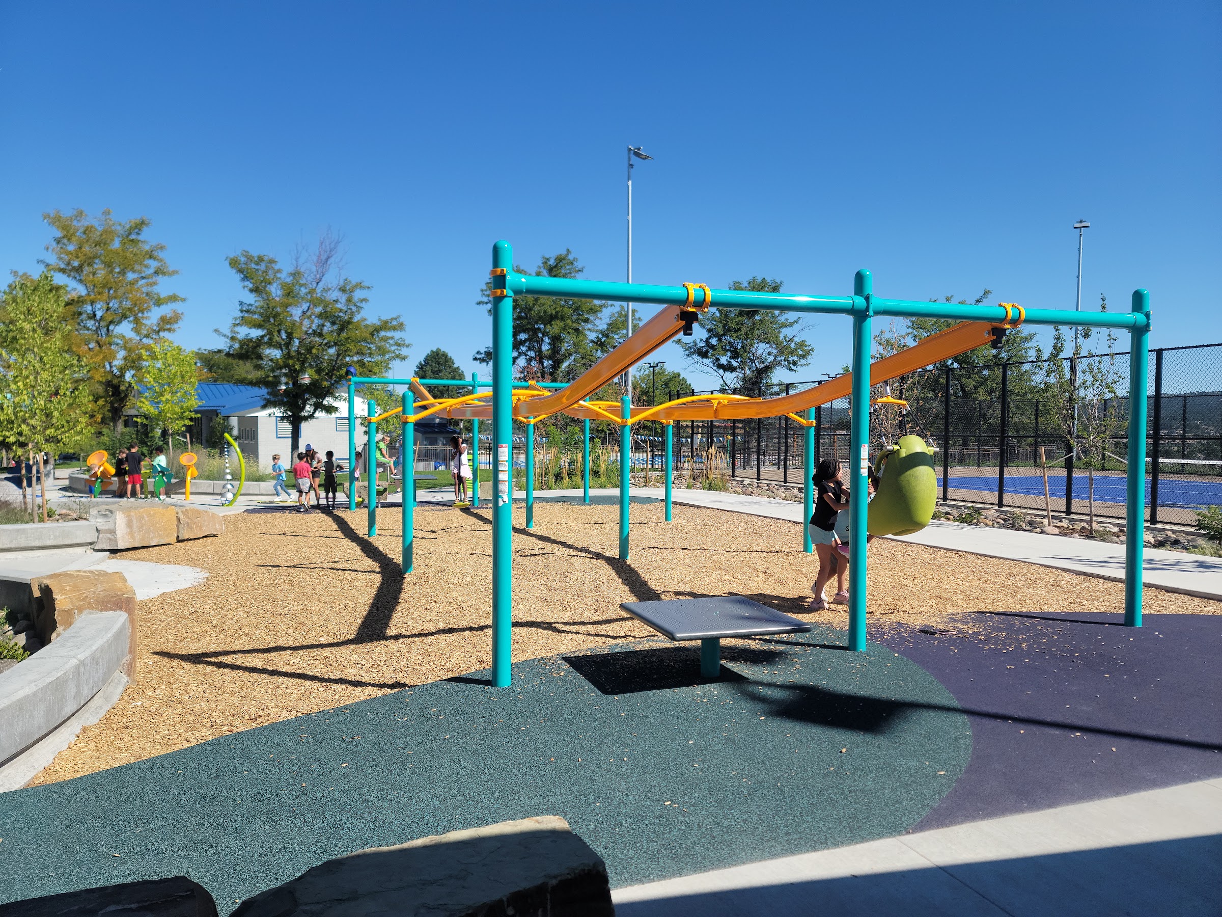 What are people saying (AI review summary)? This park underwent a significant re-vamp in 2023, transforming it into a highly acclaimed and inclusive community space. It features extensive open areas with little league fields, a large football field, a softball field, a full-size basketball court, tennis courts, and six new pickleball courts. The aquatic facilities include a public swimming pool, a kids pool, and a splash pad. A major highlight is the ADA accessible and sensory playground, praised for accommodating children of all abilities (physical, visual, and sensory impairments), including wheelchair-accessible workout equipment. The playground also boasts unique features like a sensor game, a rock park, a climbing wall, a high-speed slide, a musical area, and a zipline style slide. The park offers numerous covered picnic tables and shaded areas, along with a dedicated area for DJs and performers. Reviewers consistently describe it as 'awesome,' 'so cool,' and 'made with love and care,' with one calling it the 'best new park south of Denver' due to its comprehensive and thoughtfully designed amenities.