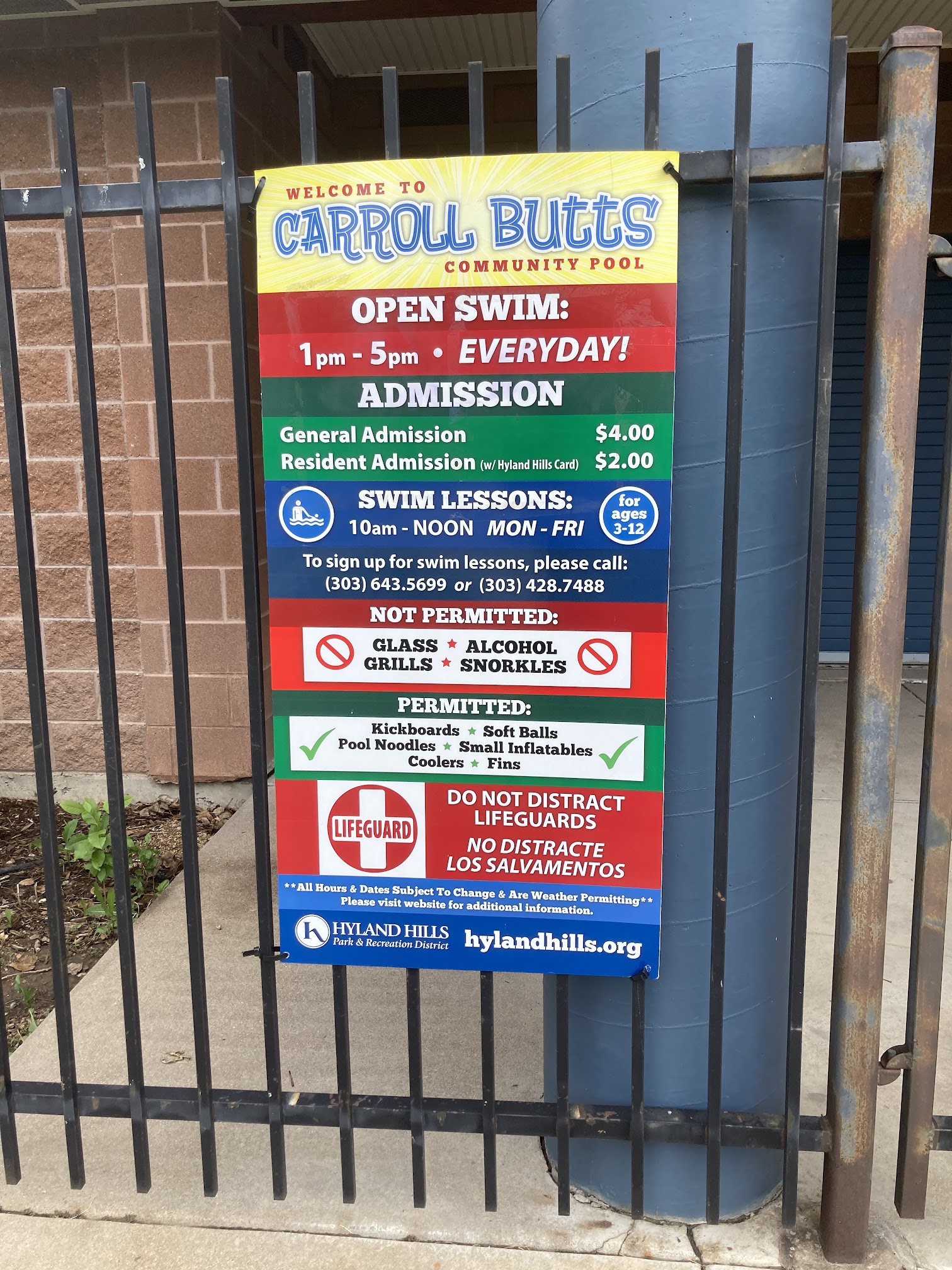 This is a great little pool at a great little price (and you'll need cash to pay the entrance fee). Water is 3.5 to 4 feet deep. The kids love both the pool and the adjacent playground. You just have to check ahead of time to see if it's open the day you want to go. The open pools for each week are posted on the Hyland Hills website, or you can call the main number and they will tell you.