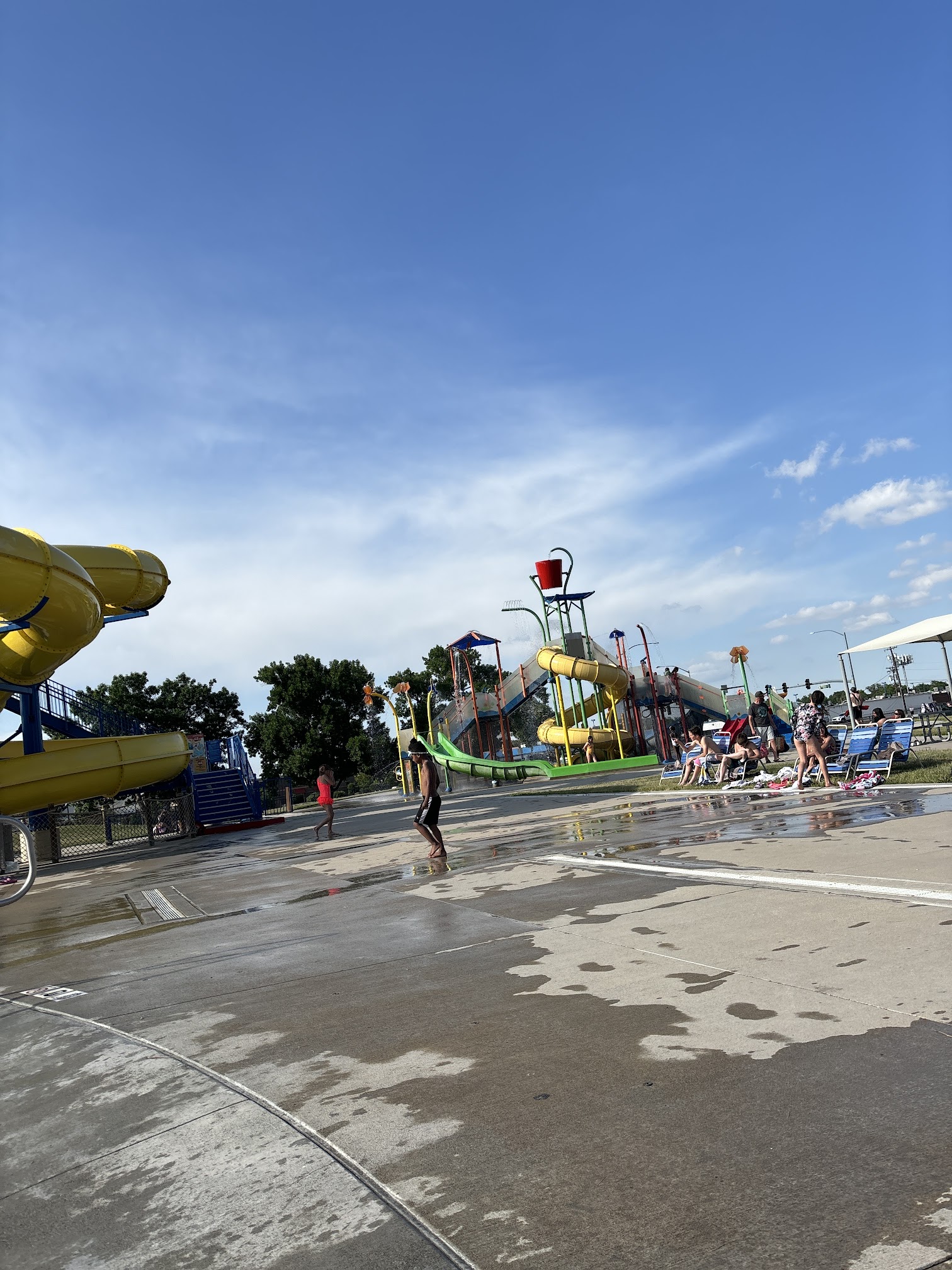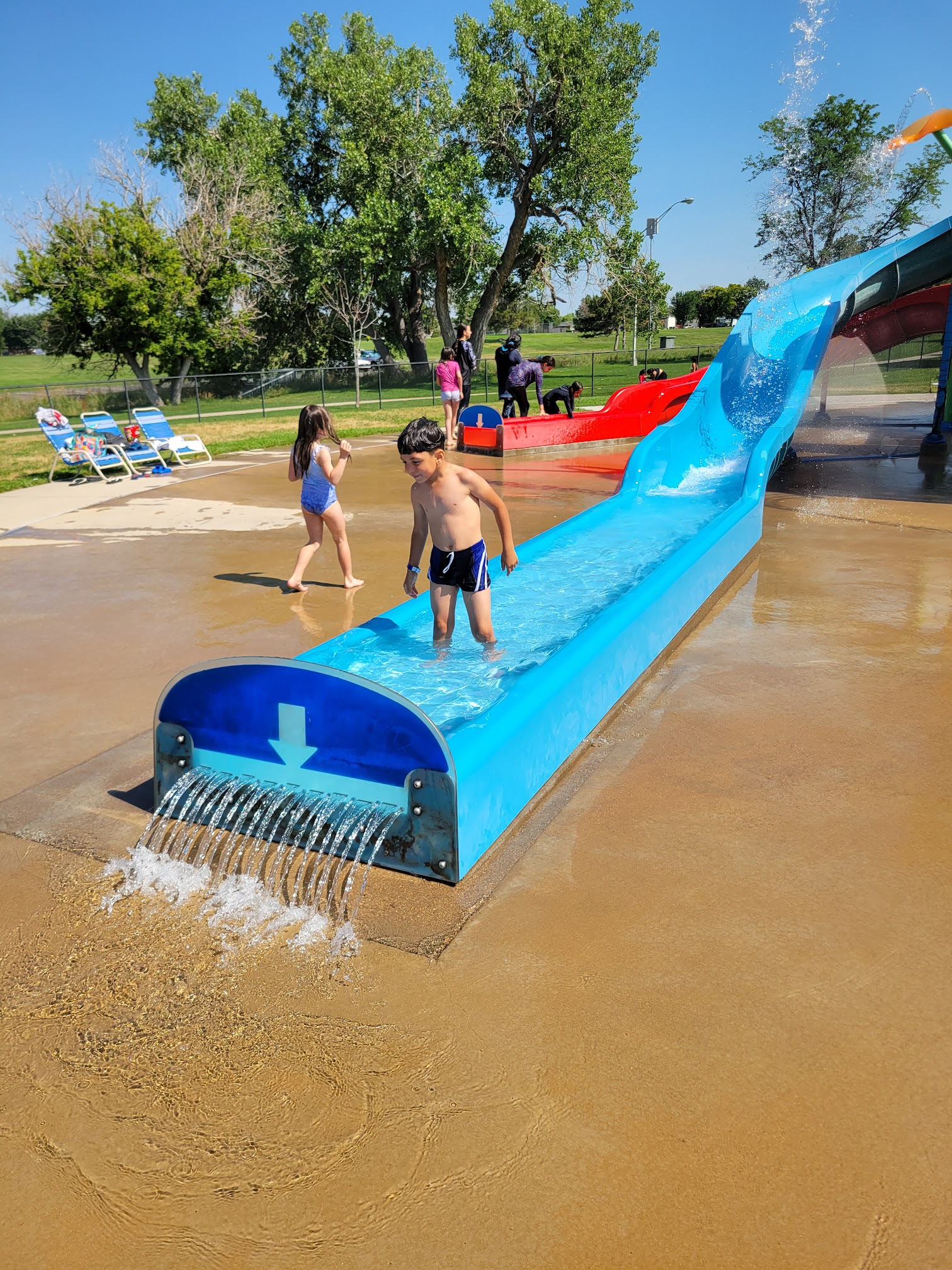 Fun water adventures for the kids!. Friendly staff, easy entrance. Fair pricing and pool are kept pretty clean. Big and spacious. First come, first serve chairs / tables. They have small area for smaller children and deeper area on the other side. They have 2 water slides, which need to be 48' inch to ride all. They also have a small area with a smaller slide, with water coming out everywhere! The big red bucket that fills with water tips over, the kids love it!! Lifeguards are on duty on each side. Great place to go enjoy the sun and water. Definitely recommend checking this place out.