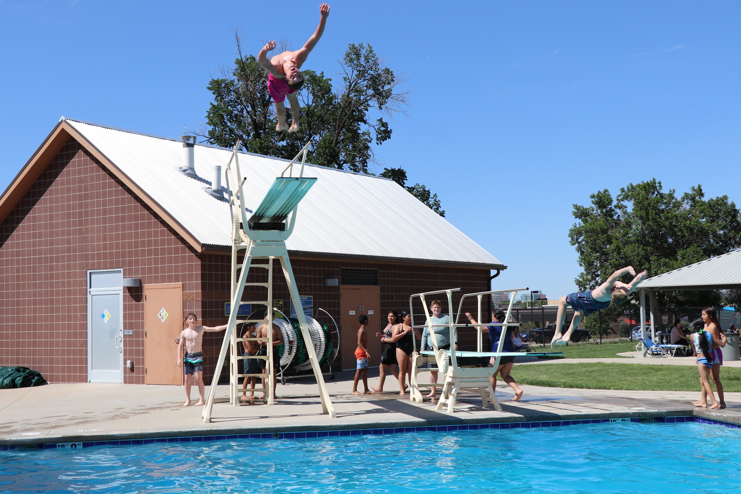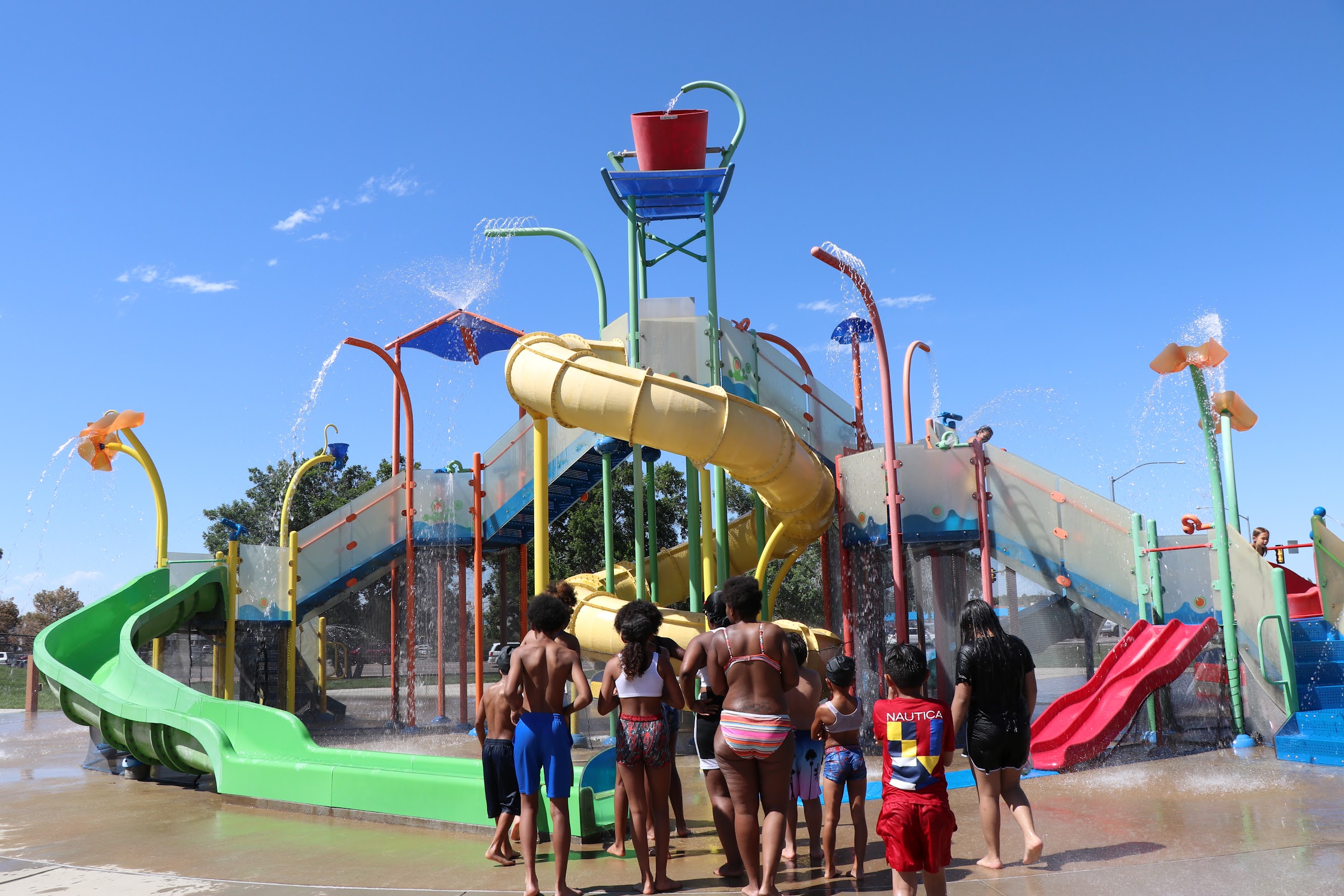 Outdoor pool with 2 water slides, a splash pad, and a tipping bucket for kids.