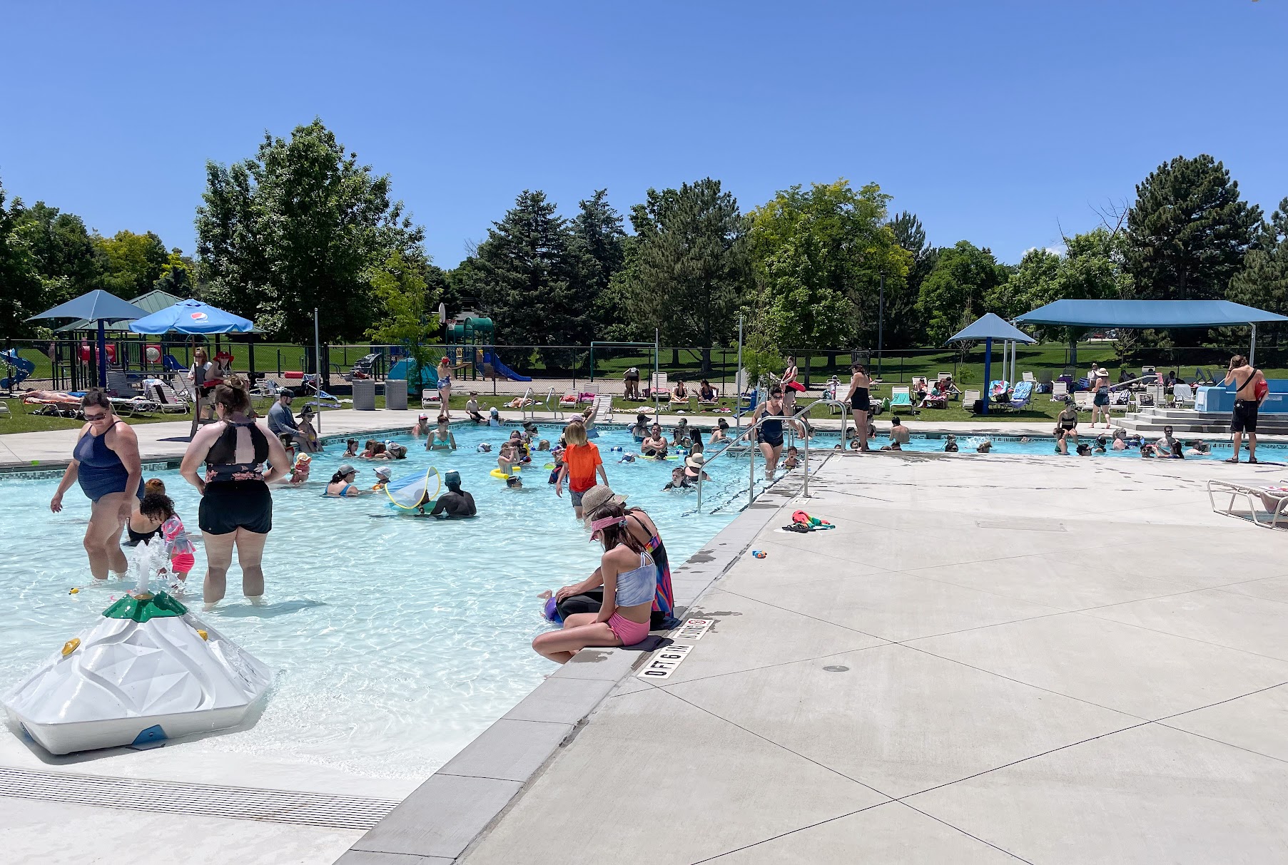 Awesome pool for young kids. The zero entry area has a splash pad and is great for toddlers. The other side of the zero entry is only 3 feet deep so you can easily watch multiple kids. The slide is very mild but dark! It's very clean and not usually busy.