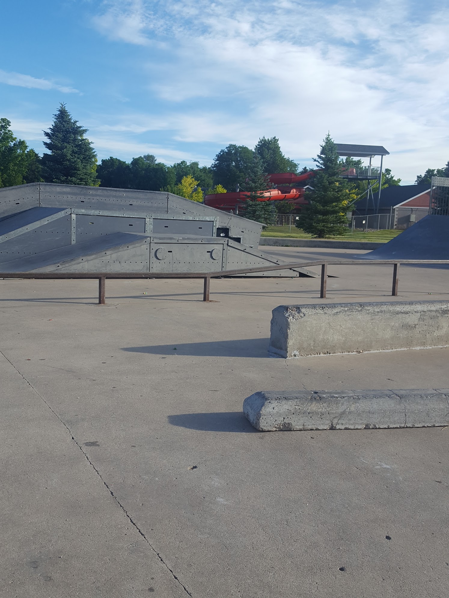 What are people saying (AI review summary)? Reviews present a mixed bag of experiences. Some users had excellent private pool events, praising brilliant lifeguards and great facilities. The pool is also noted as nice for little ones, featuring zero-entry and splash pad areas. However, significant recurring issues include the main 'big kids' slide being out of order for an extended period (since last summer), with no clear timeline for repair, causing major disappointment. Other common complaints involve weekend overcrowding, lifeguards' ineffective management of slide lines and intertube distribution, and confusing new rules like a mandatory 10-minute pool evacuation. Additionally, a small park was criticized for having metal ramps that become dangerously hot in warm weather.