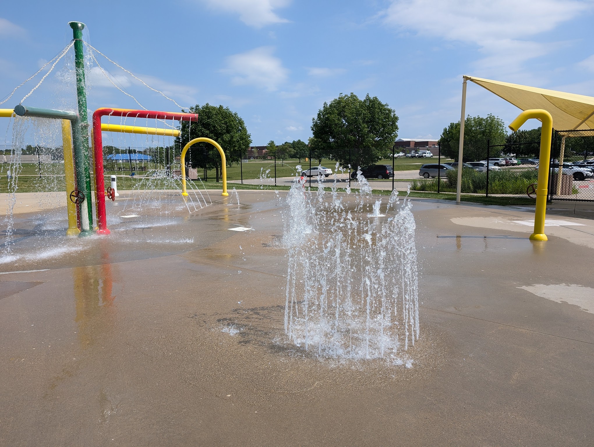 Family-friendly aquatic center with a pool and an attached splash pad.