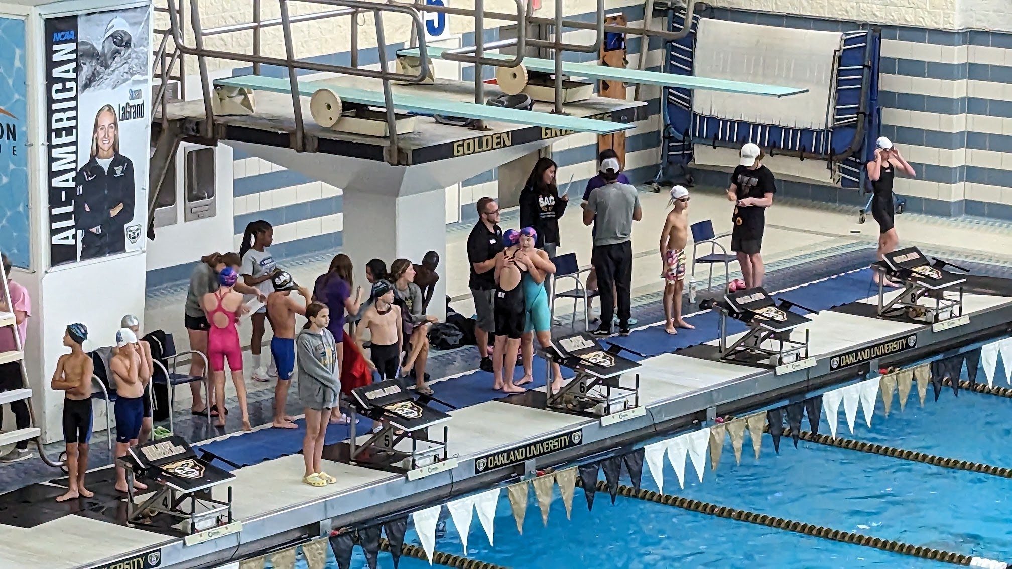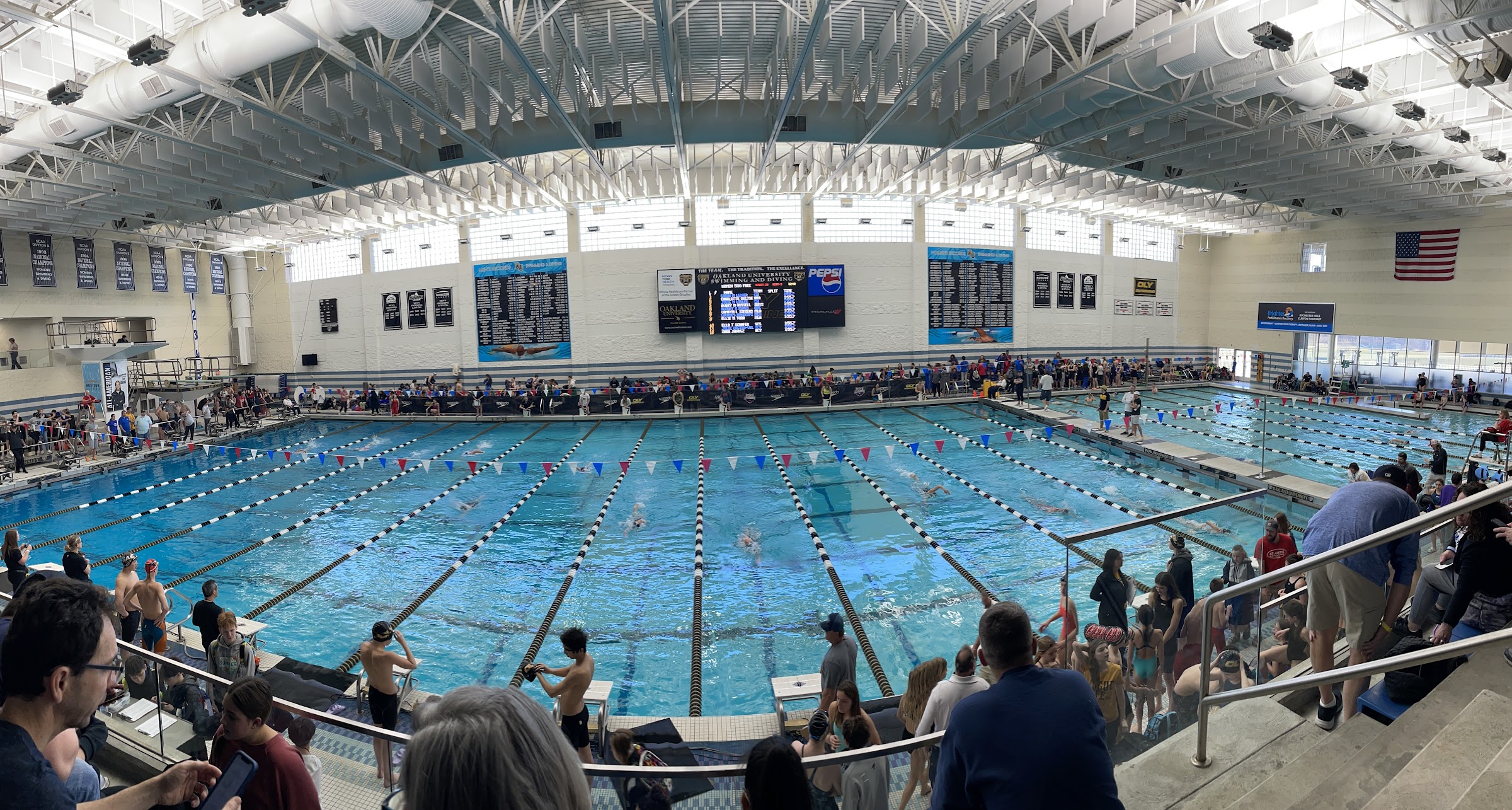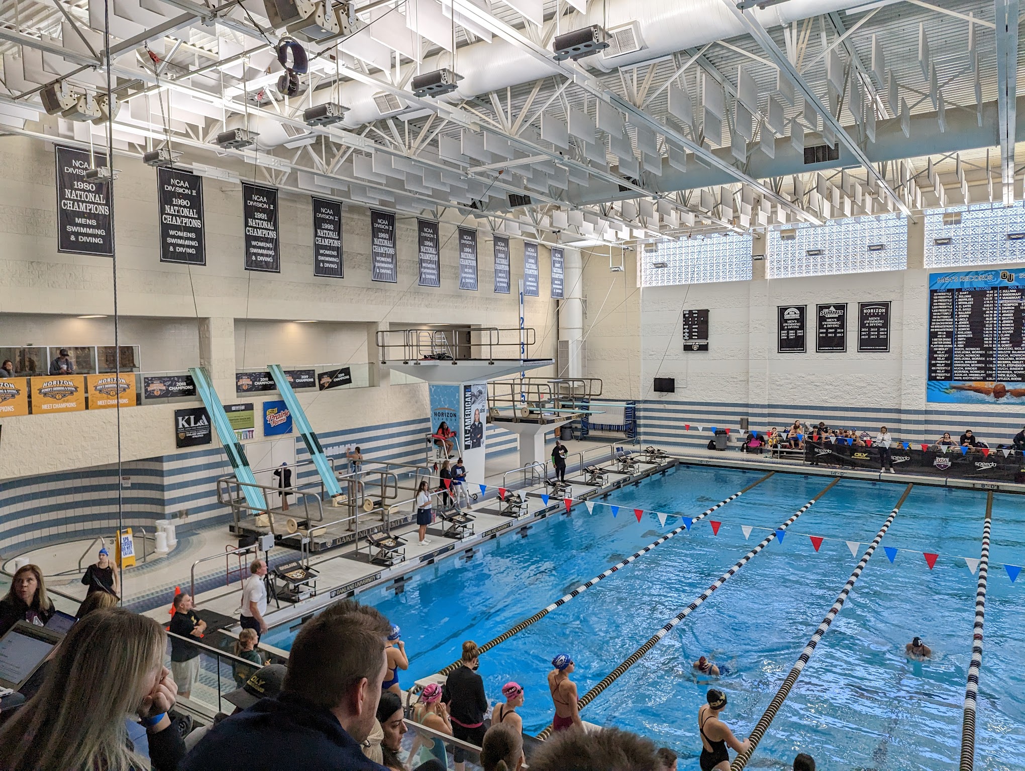 Great pool, water temperature was unfortunately a little cold. There was very little walking space with all the bleachers. Lockeroomsbwere nice, pool deck was kinda slippery at times. The scoreboard is also somewhat misfortunely placed. Hard for everyone to see it.