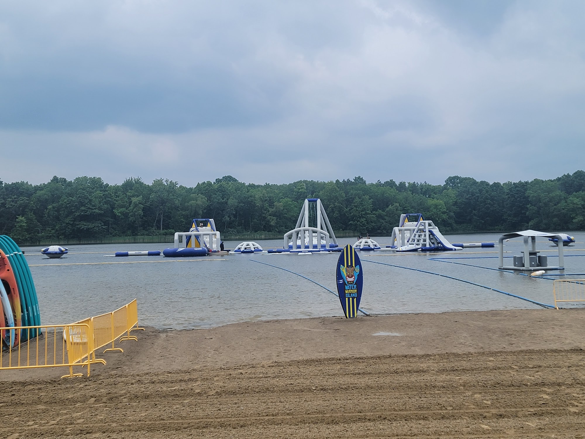 Water Warrior Island utilizes the natural water of the lake it is located on for its attractions. Consequently, there are no artificially heated or regulated pool temperatures; the water temperature reflects the natural conditions of the lake.
