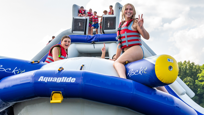 Family-friendly water park with inflatable slides, runways, and jumping pillows.