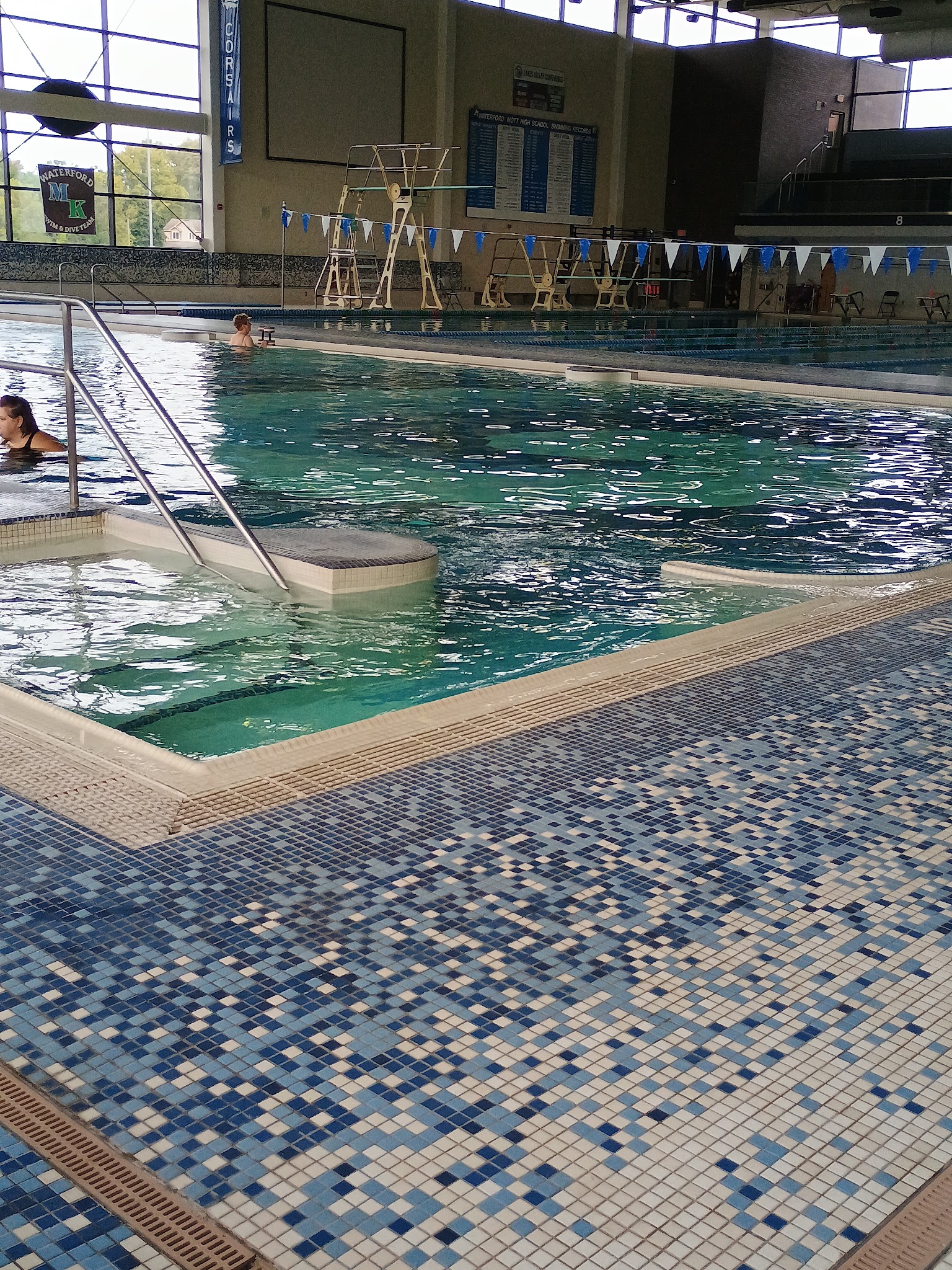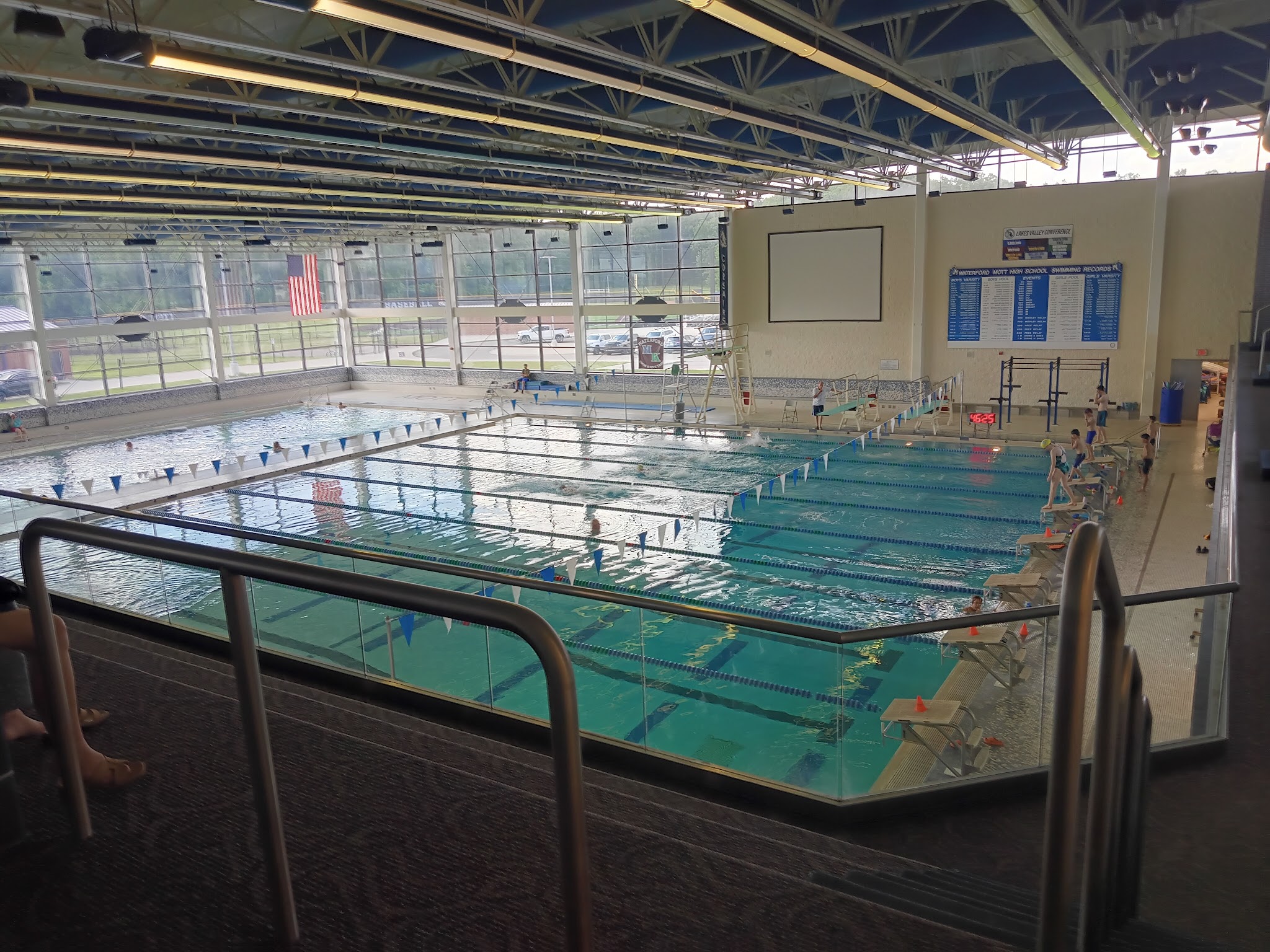 Large pool and event pool. Lockerrooms are available. Gym upstairs isn't huge. It's located inside Waterford Mott high school closer to the football and baseball fields.