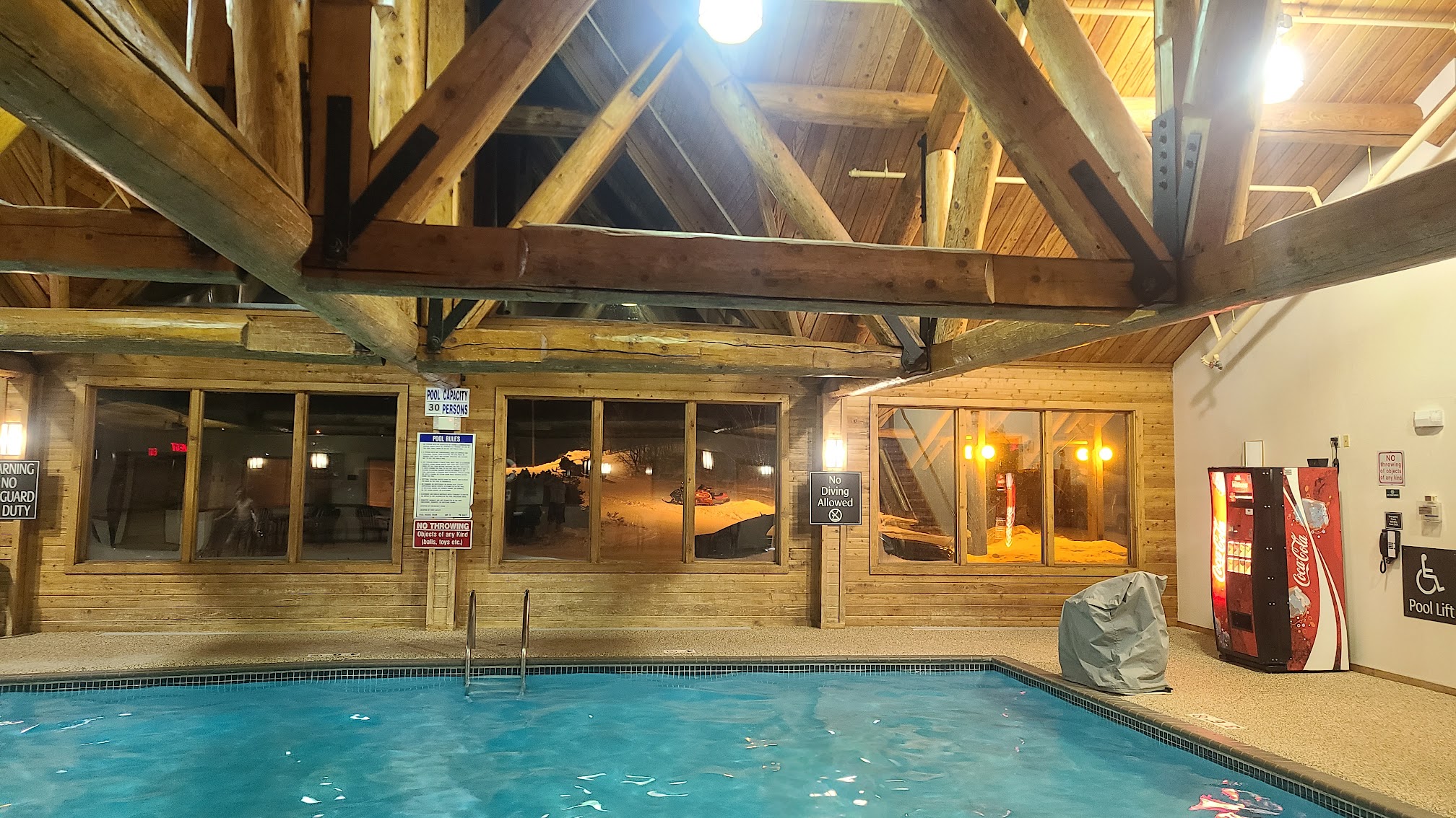 The indoor swimming pool at Grand Ely Lodge is generally maintained at a comfortable, warm temperature, often reported to be around 86-88°F (30-31°C).