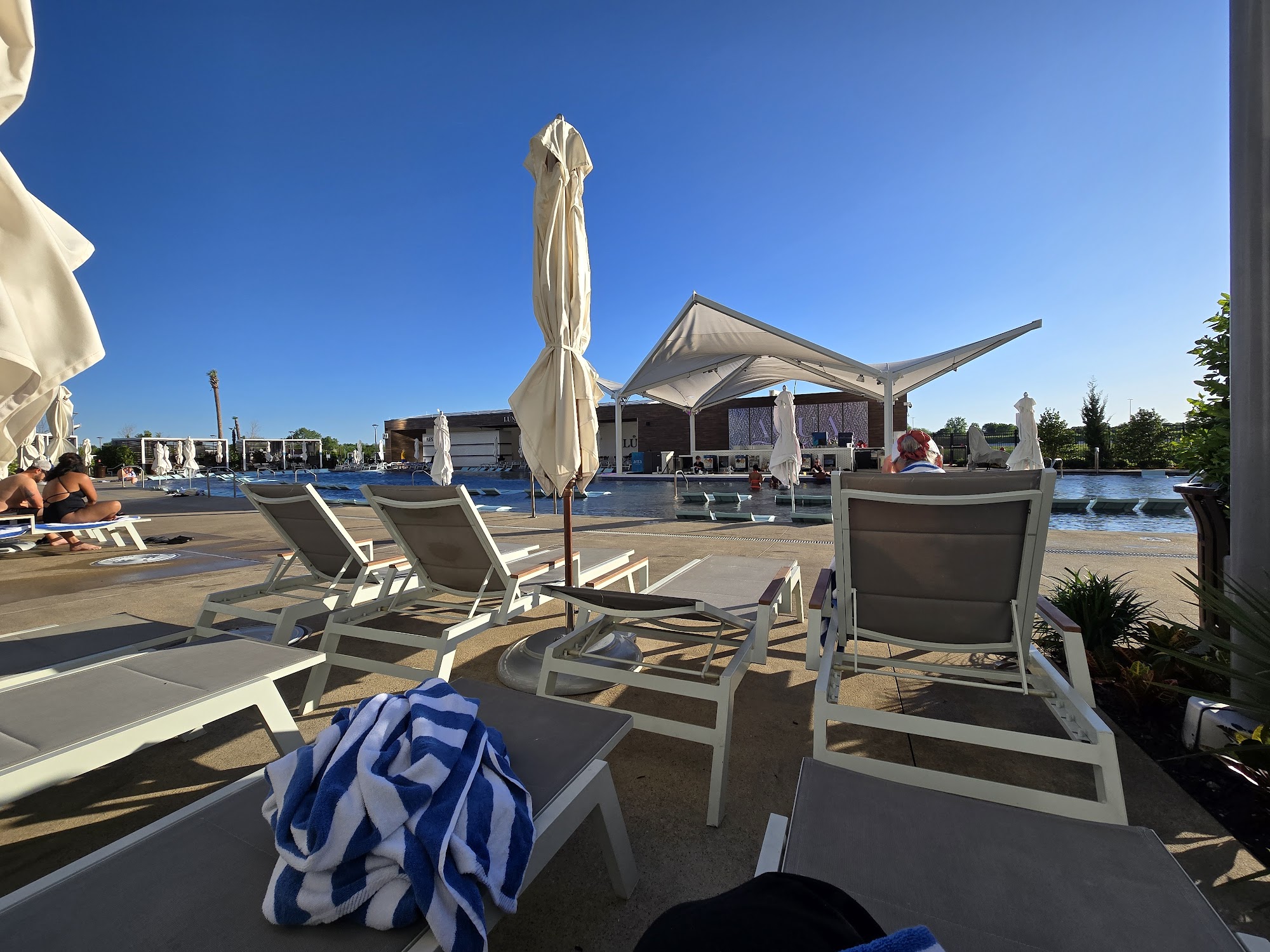 A lot of road noise from the highway you can see from the adult pool, docking one star and I'd bring headphones next time. Otherwise good - lots of in water loungers, nice swim up bar, and great food options. The day I was there in April the adult pool water looked more gray than blue (kind of natural while still clear, vs the very blue water you see in most pools), so I don't know if that is due to color choices on the pool flooring? It js not quite as aesthetic as the bright Caribbean blue, but was fine. You need to be a hotel guest to go to the pools. A lot of the area around pools is taken up with cabanas, so I can imagine the loungers that are on the decks filling up on days the resort is busy. Good service.