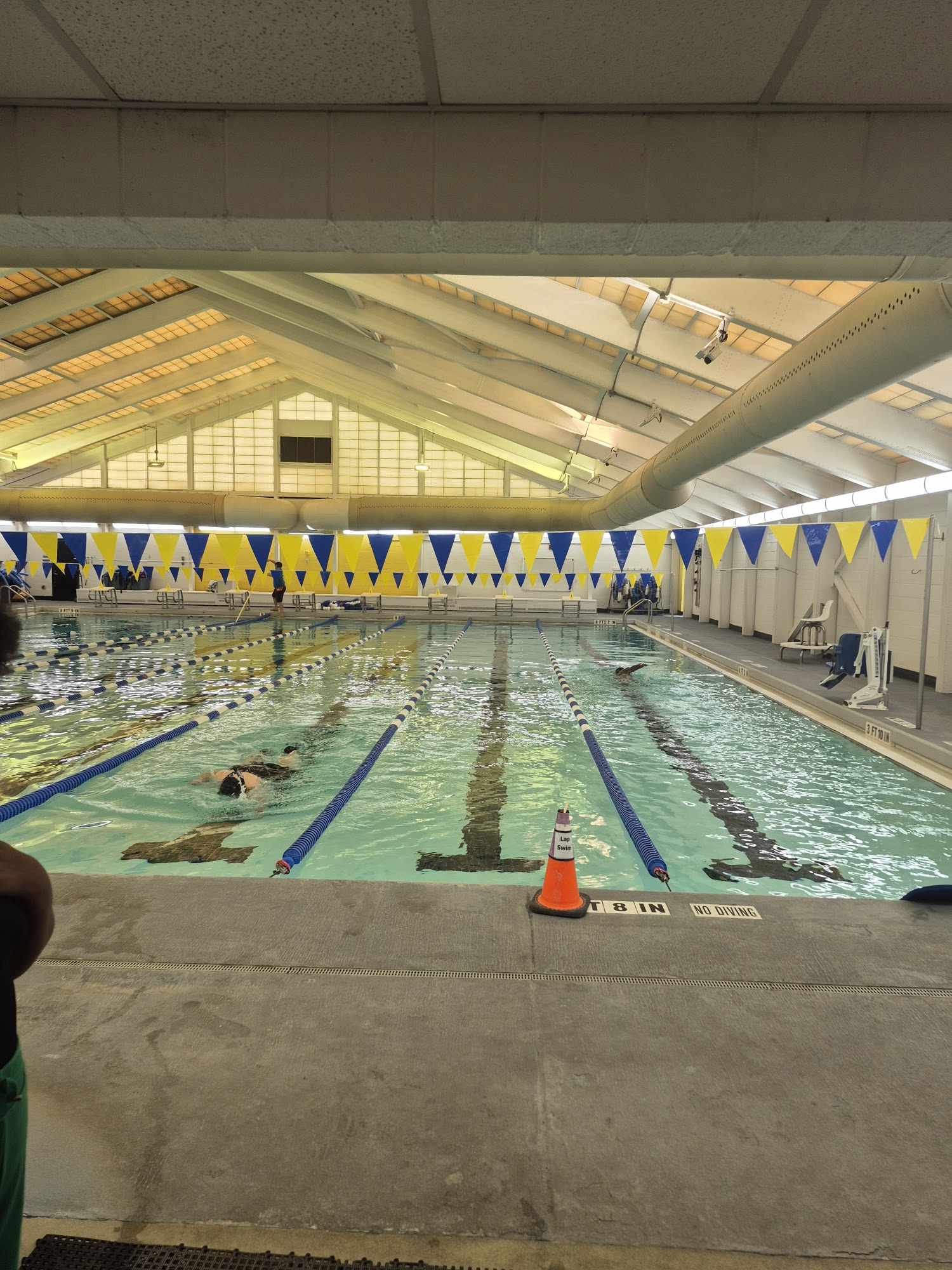 It's a pretty nice pool. Eight lanes, 25 yards. 3.5 feet at the shallow end and 9ish at the deep end. There's a nice ramp which is great for toddlers or anyone who has trouble getting in and out. The water is warm-ish (83 or 84) so I wouldn't recommend it for any serious long-distance, short-rest-interval swimming unless you like to overheat. For relaxing swims or longer interval stuff it's great. It's only chilly if you're used to something around 90 degrees like Goldfish - but my son had a blast once he got over it. The showers are nice and hot and they and the locker room are reasonably clean and well-maintained. There is no suit dryer which apparently freaks some people out. The water-bottle-filling station is right in the lobby next to the vending machine - I didn't notice it until my ninth visit. Bonus, it hasn't been too busy any time I've been there. Please don't come and take up all the lane space ;)