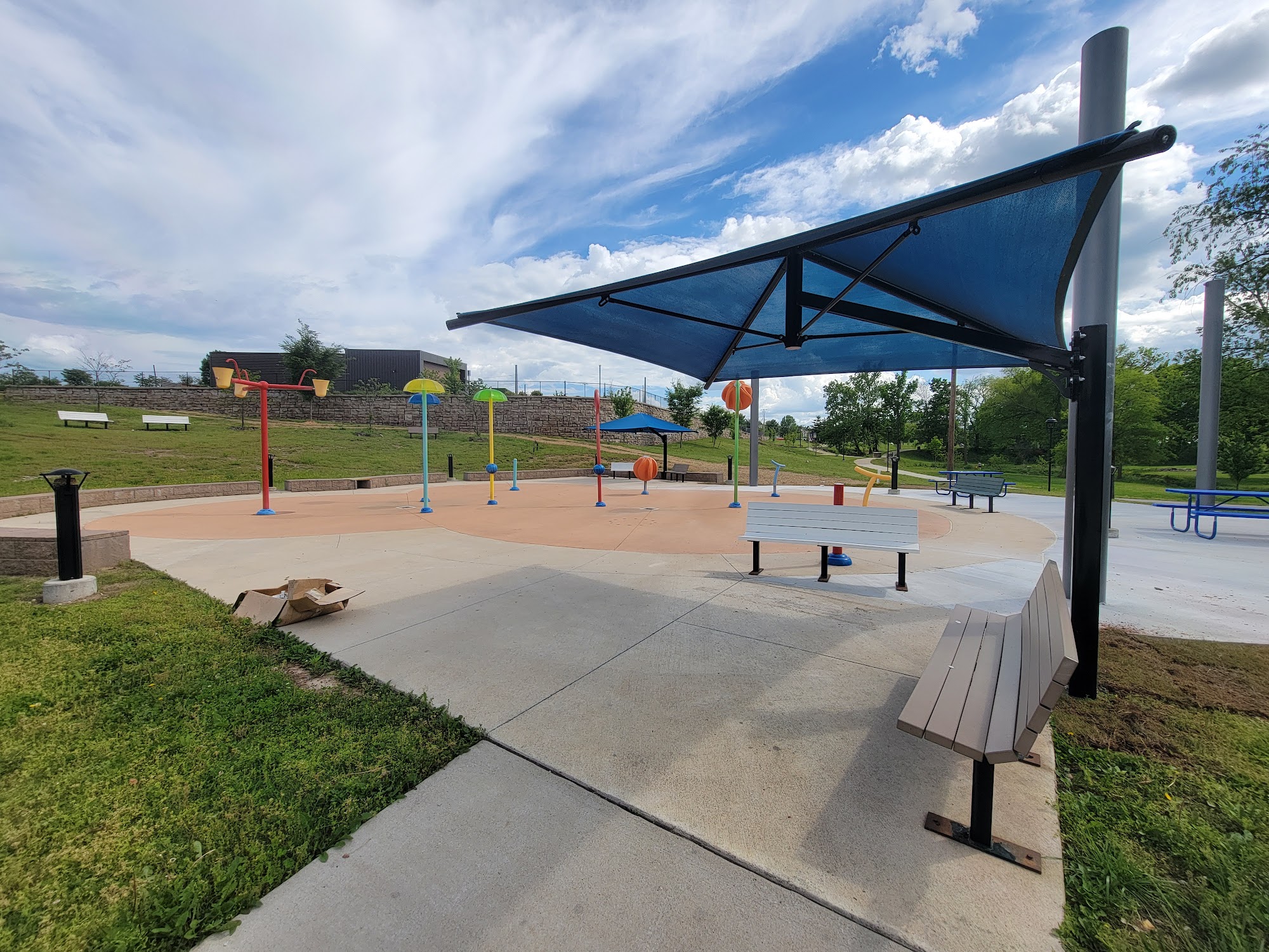 We've been waiting for this splash pad to open for 2 years! It's in a great location. There are 2 family restrooms onsite. There are places within walking distance to get food like Wendy's, TCBY, Sonic, and a diner style place. It has lots of benches for the parents and the park pavilion and playground are all right next to it. The splash pad is smaller but there still seemed to be plenty of room for my toddler to run around and play. Be aware parking it very limited for the playground. It may be possible or better to park at the shopping center and use the stairs that lead down to the paved trail. I don't believe there is a handicapped entrance that way. So you'll want to plan accordingly for busier times. Overall great little place to hang out for the afternoon.