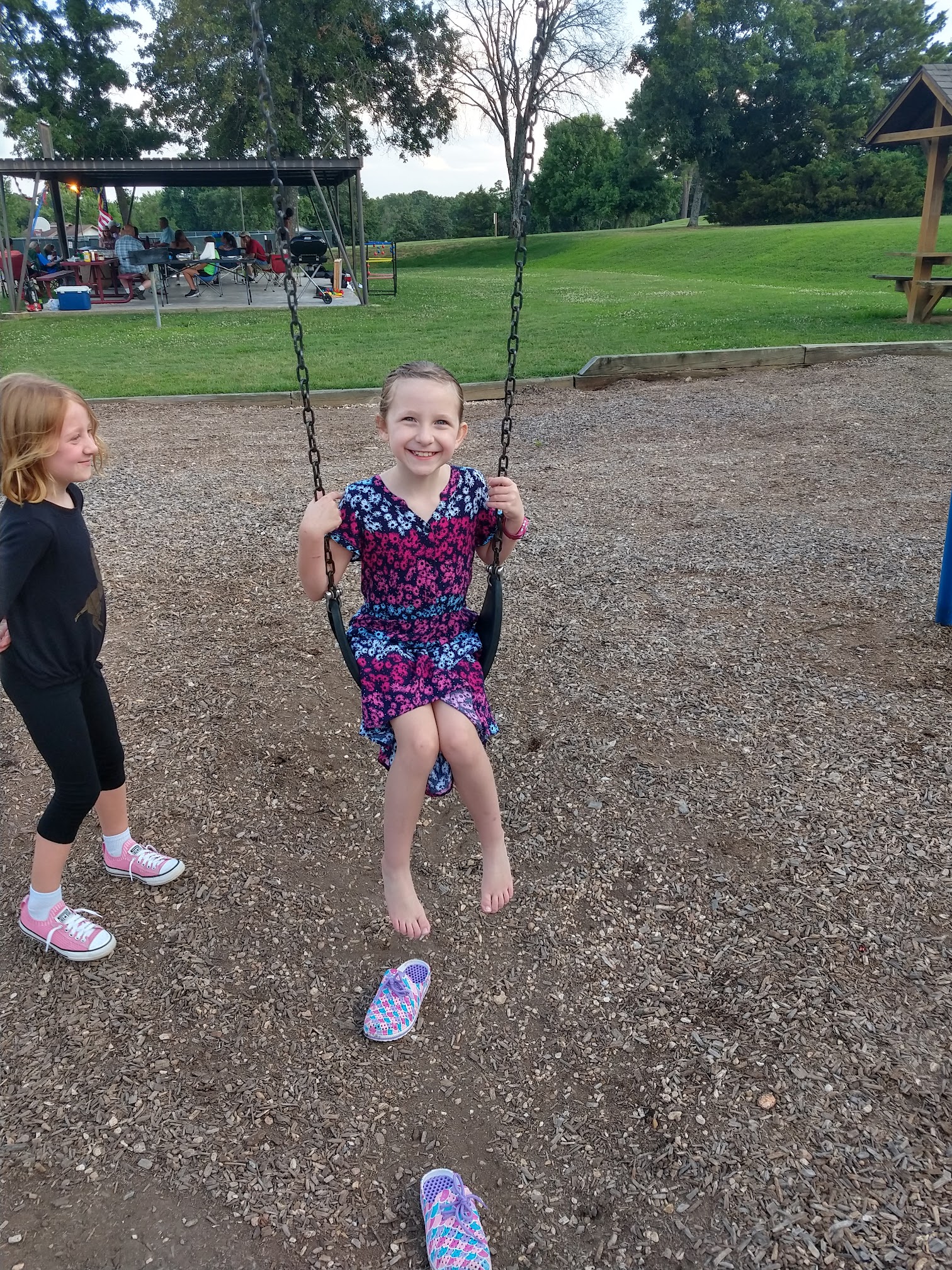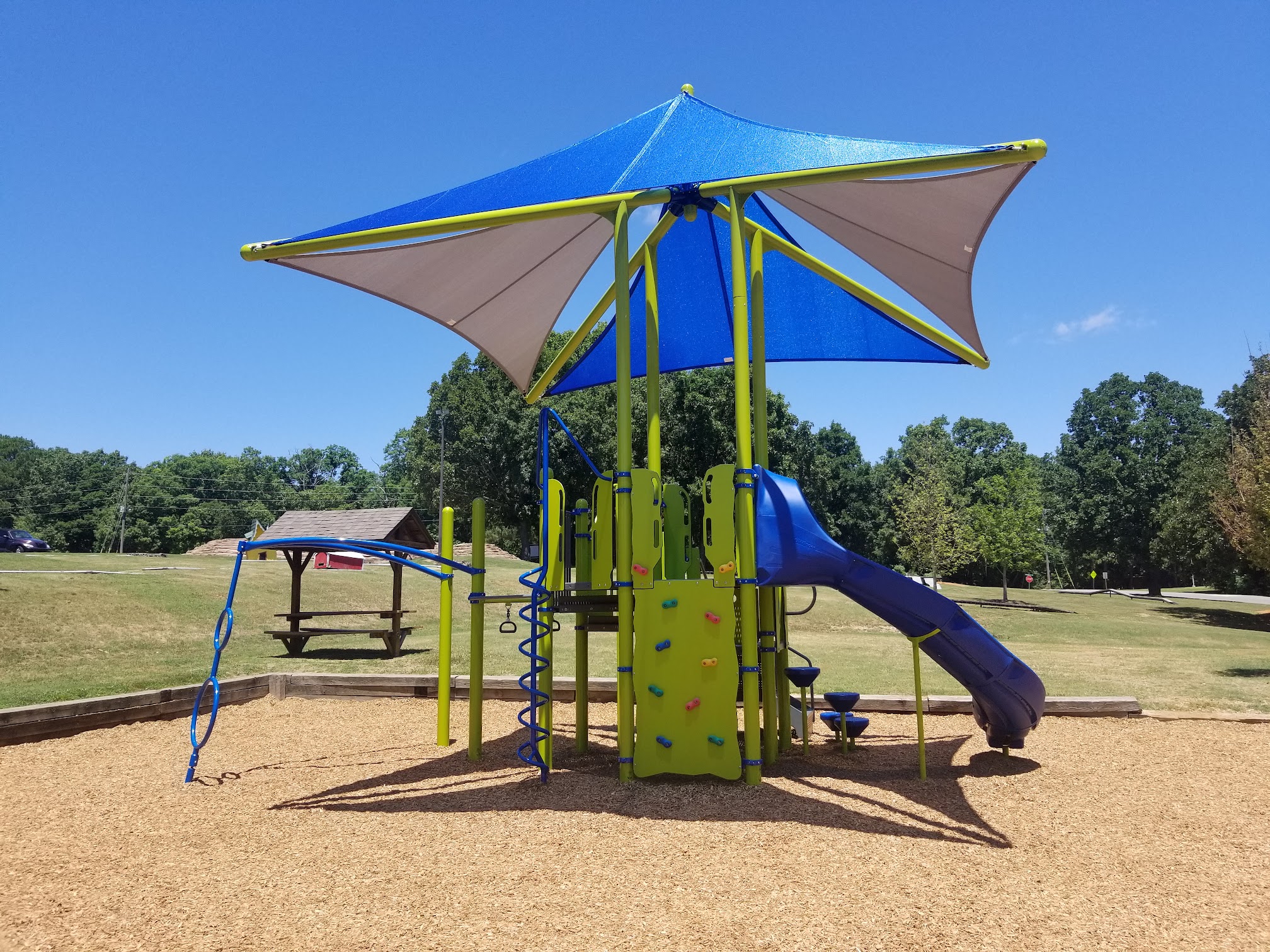 Well-kept public pools (including a kiddie pool) and a park with a playground.