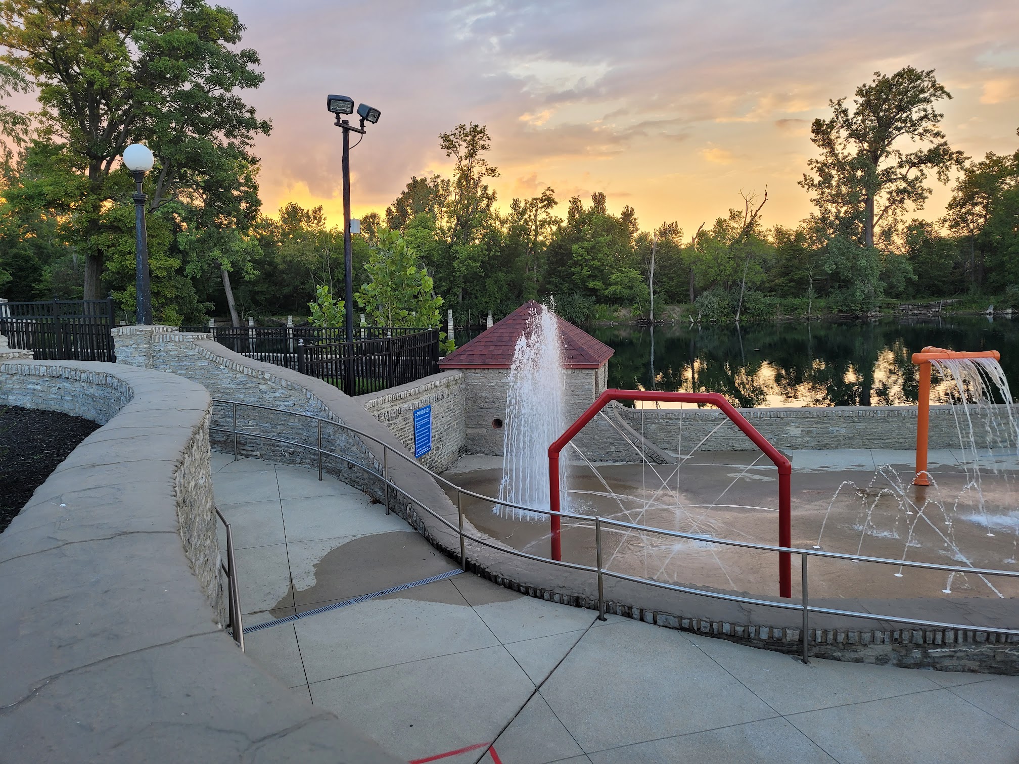Family-friendly public pool featuring a playground, slides and splash pads.