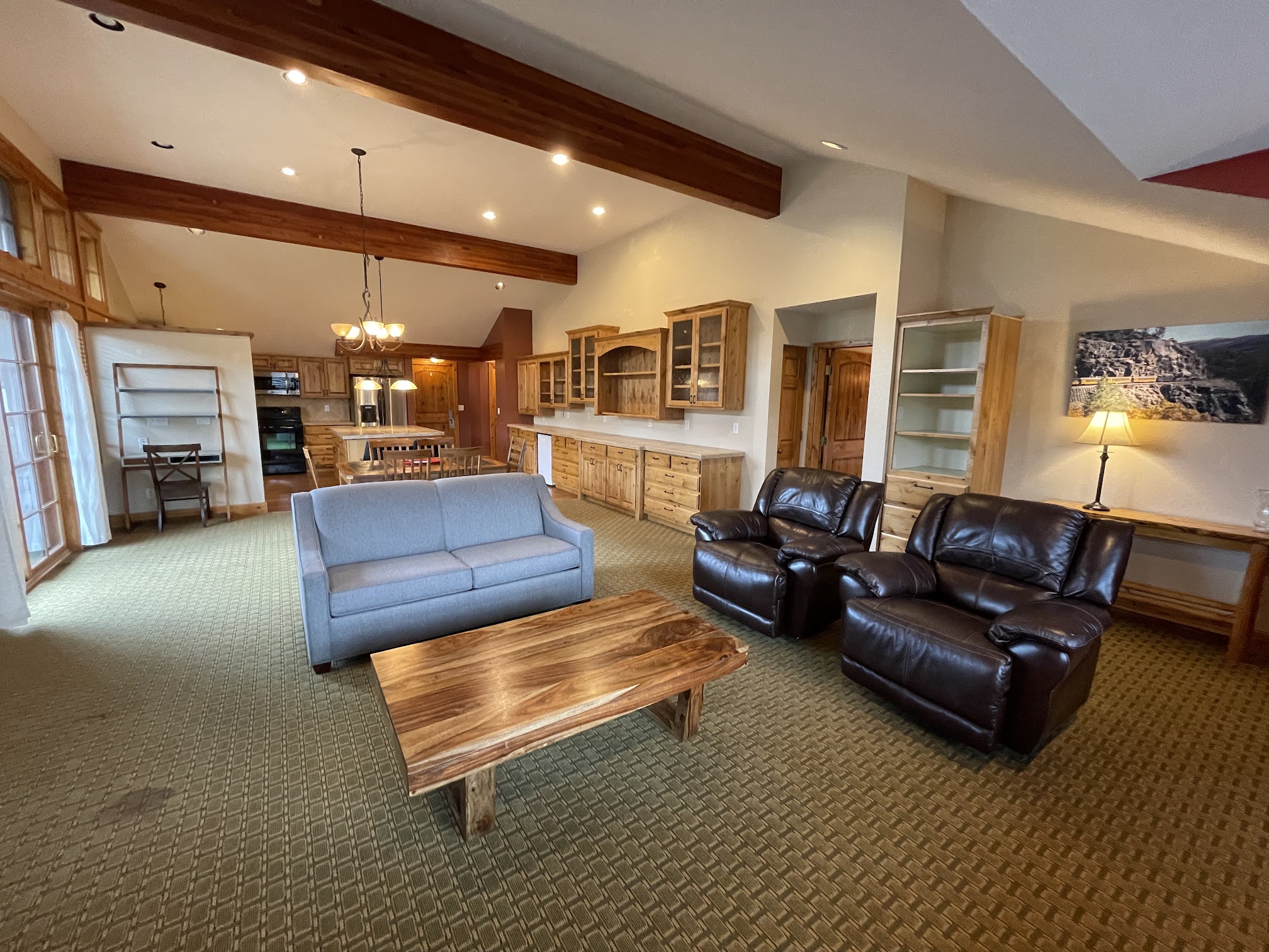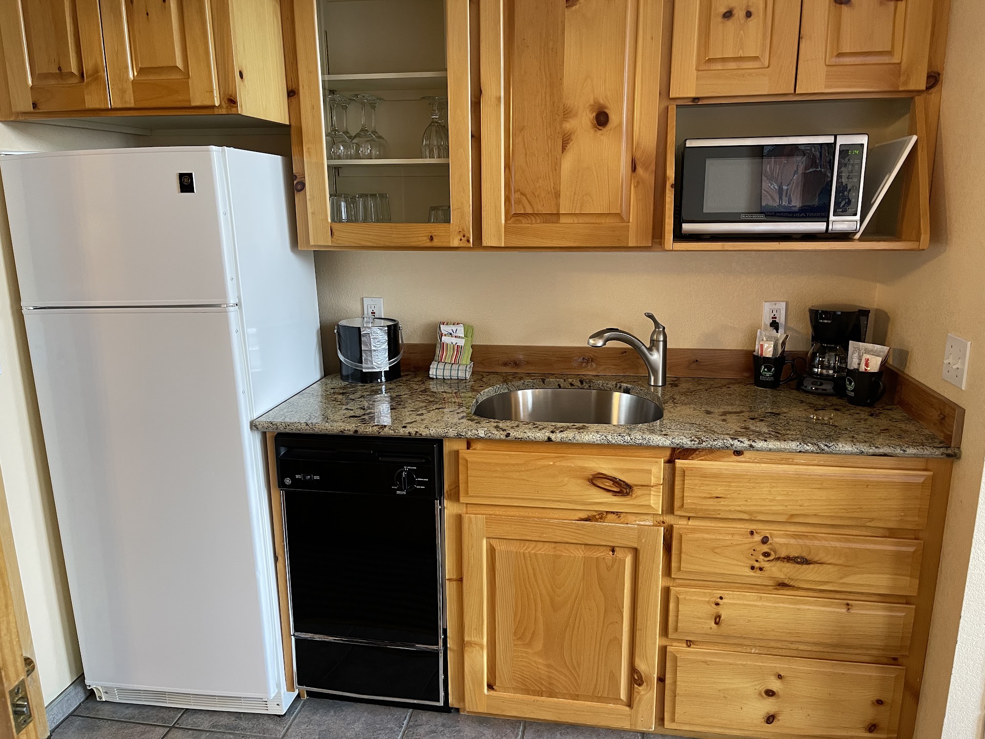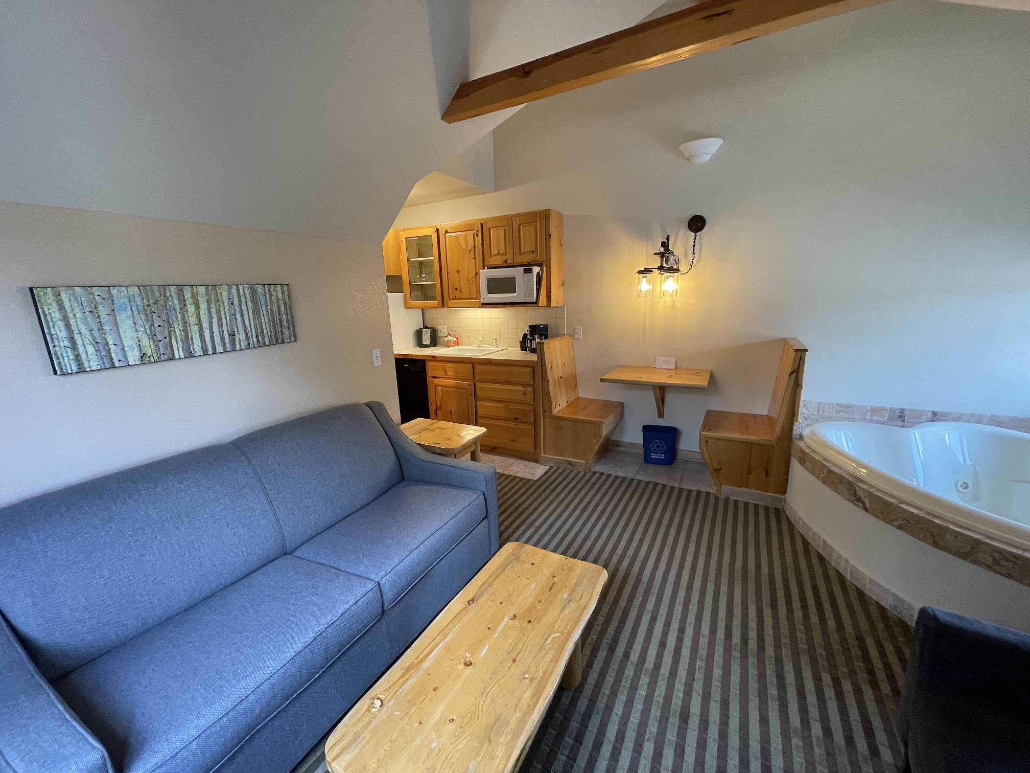 We loved this place. Great location, and service. We came earlier than the check-in time and our room was ready. Rustic feel with the fireplace and the furniture. Love that it had a full kitchen with plates, utensils, toaster, blender, full sized fridge, and a microwave. And most importantly AC , a little loud but no big deal. I’d recommend this place!