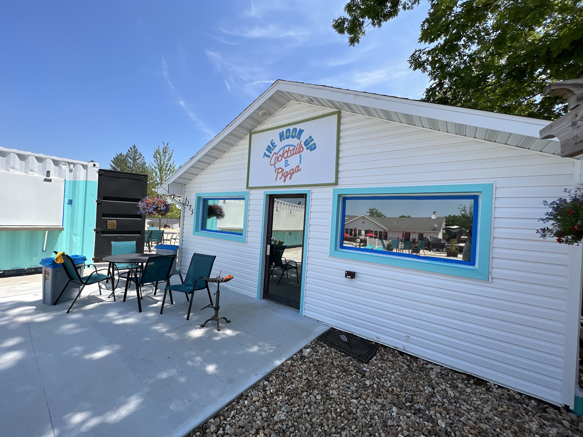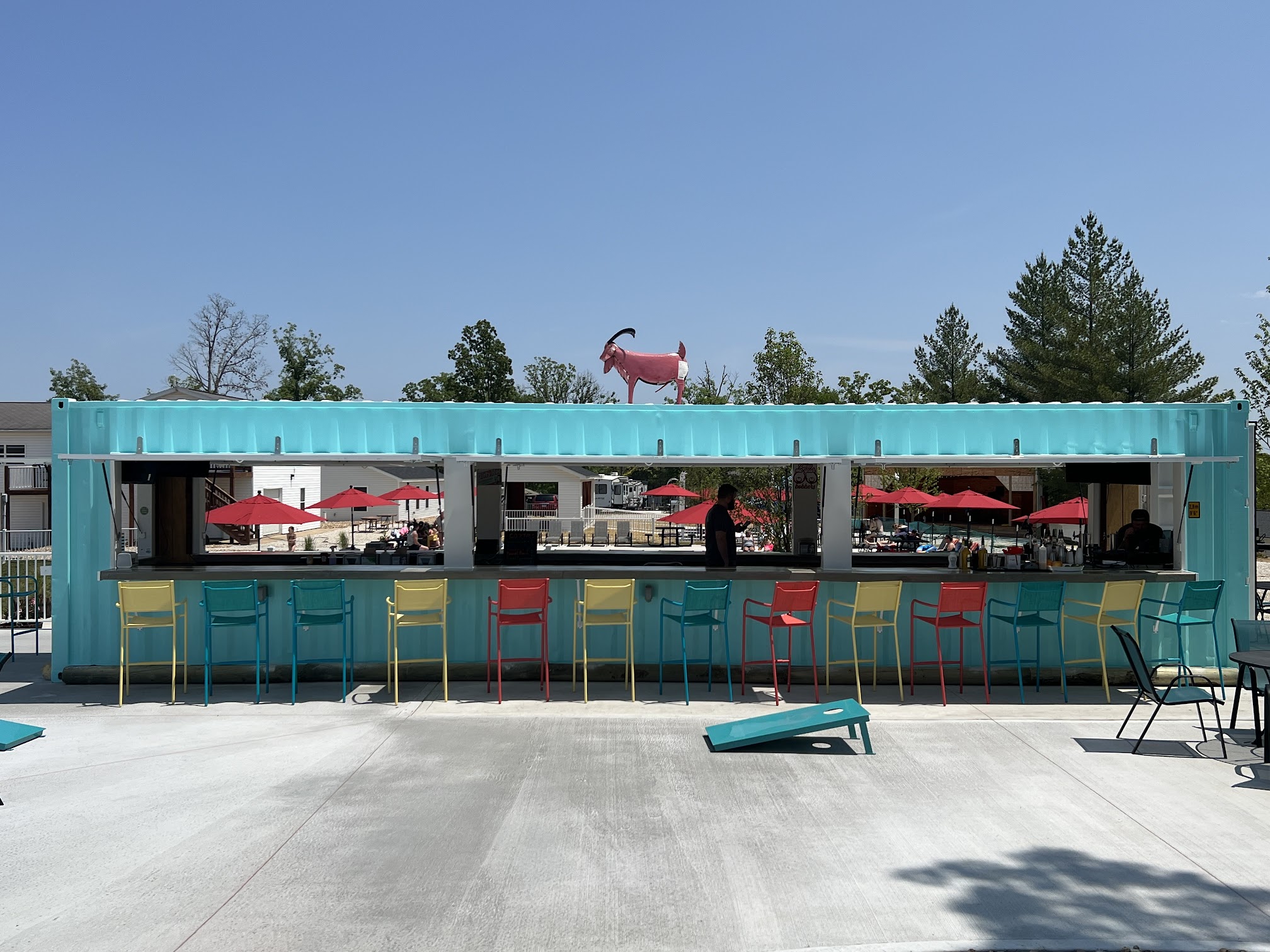 Excellent Frozen Drinks. Excellent staff. Great food. Great views and atmosphere. Fun outdoor games. Outside seating at the bar, high tables or umbrella tables. The location is centrally located on the resort property next to the pools with white fences, past the RV park area.