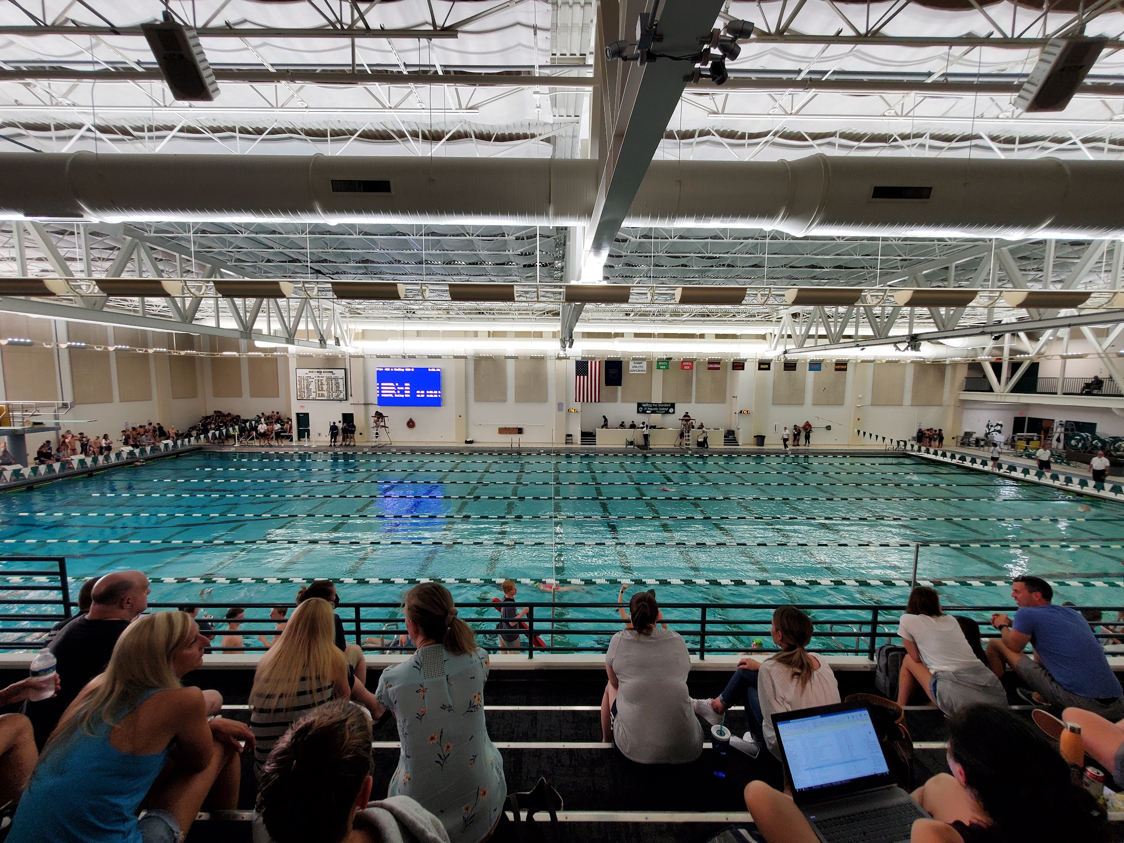 This is a nice aquatic center. Only downside is it is very warm for spectators. But this place could support like 3 8 lane 25 yard pools and still have warmup and cool down lanes. It has a lot of seating. Lot of parking. Plenty of deck space for the swimmers.