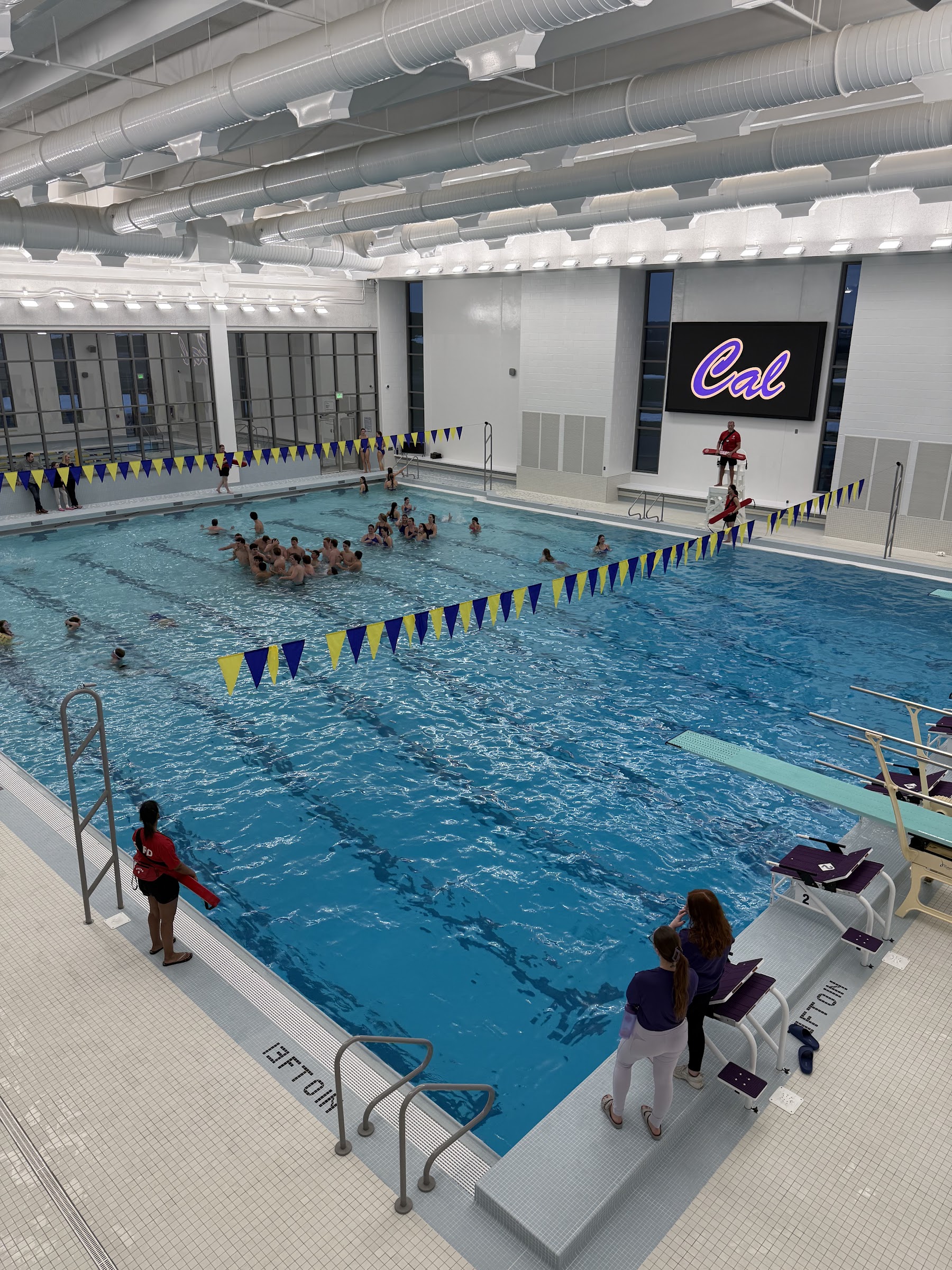 The aquatic center at the Cal Community Center features distinct pool temperatures for different uses: the 25-yard lap pool is maintained at a refreshing 79°F, the leisure pool (which includes zero-depth entry and water features) is kept at a warmer 85°F, and the hot tub provides a relaxing 102°F.