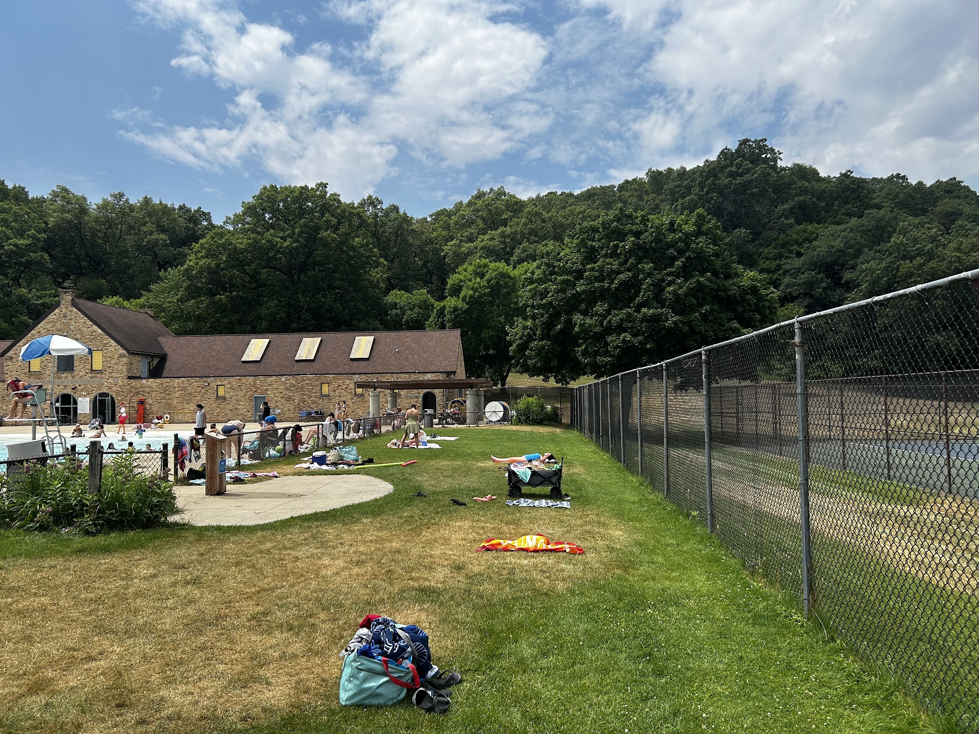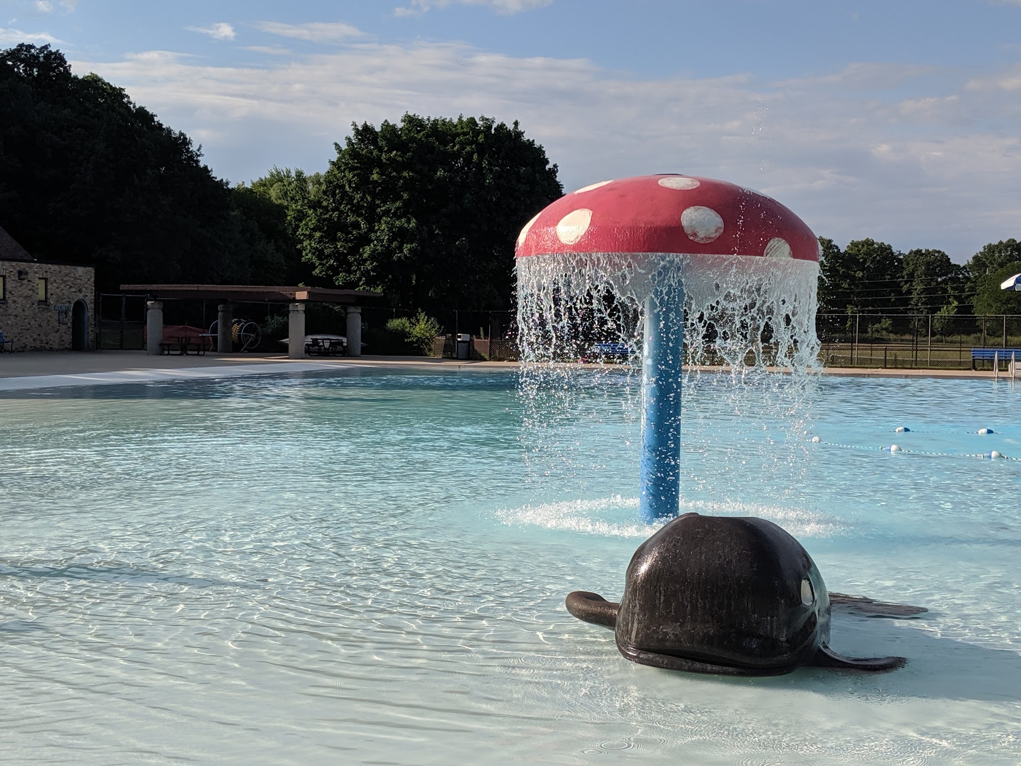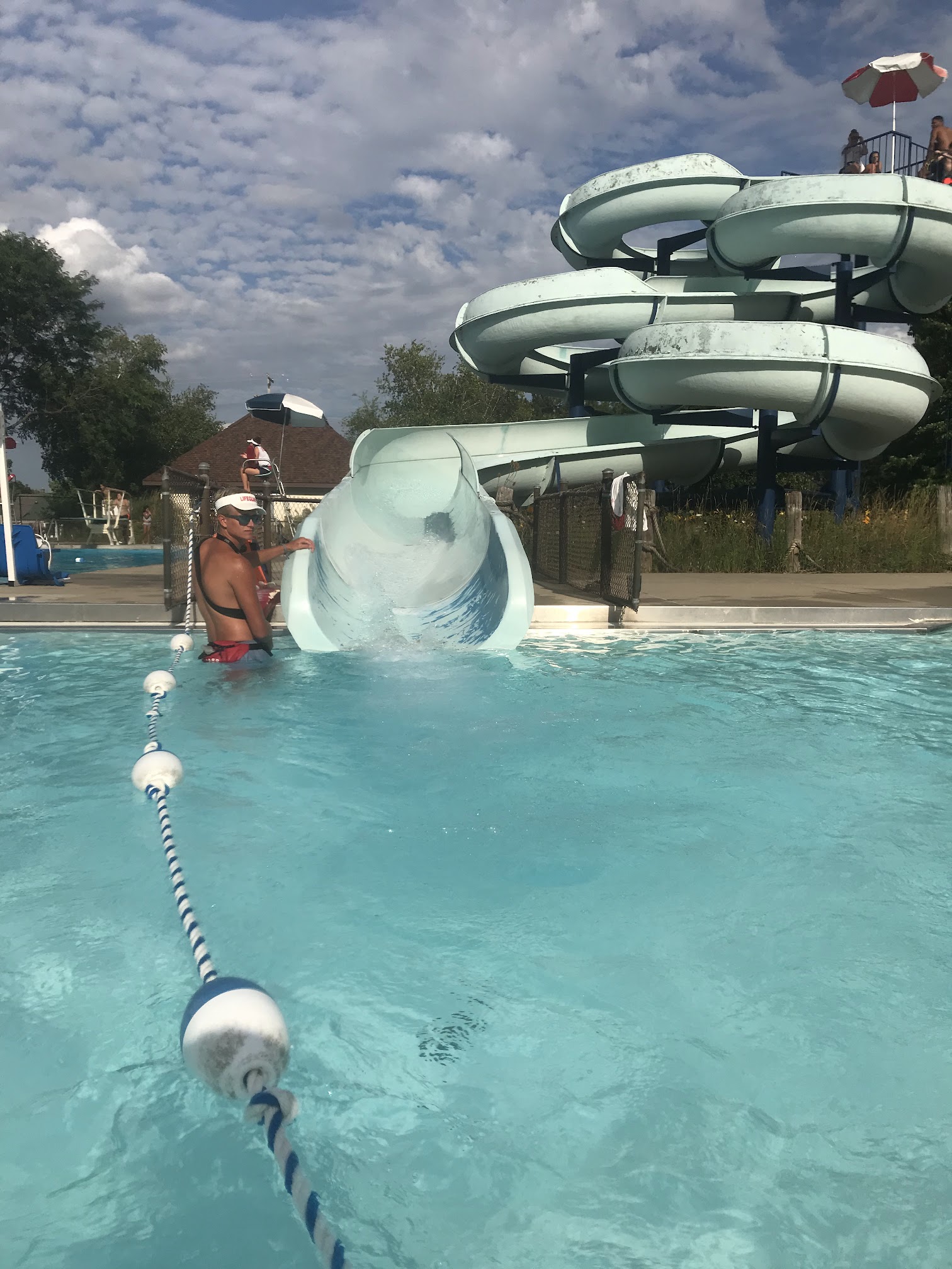 My favorite pool to swim at in the summer diving boards a section of roped off for deep water swimming and a beach entrance a water slide kids area off to the side with a mushroom fountain and a whale that squirts water and this year they got a new pump so hopfully we get a lot of summers with this pump installed