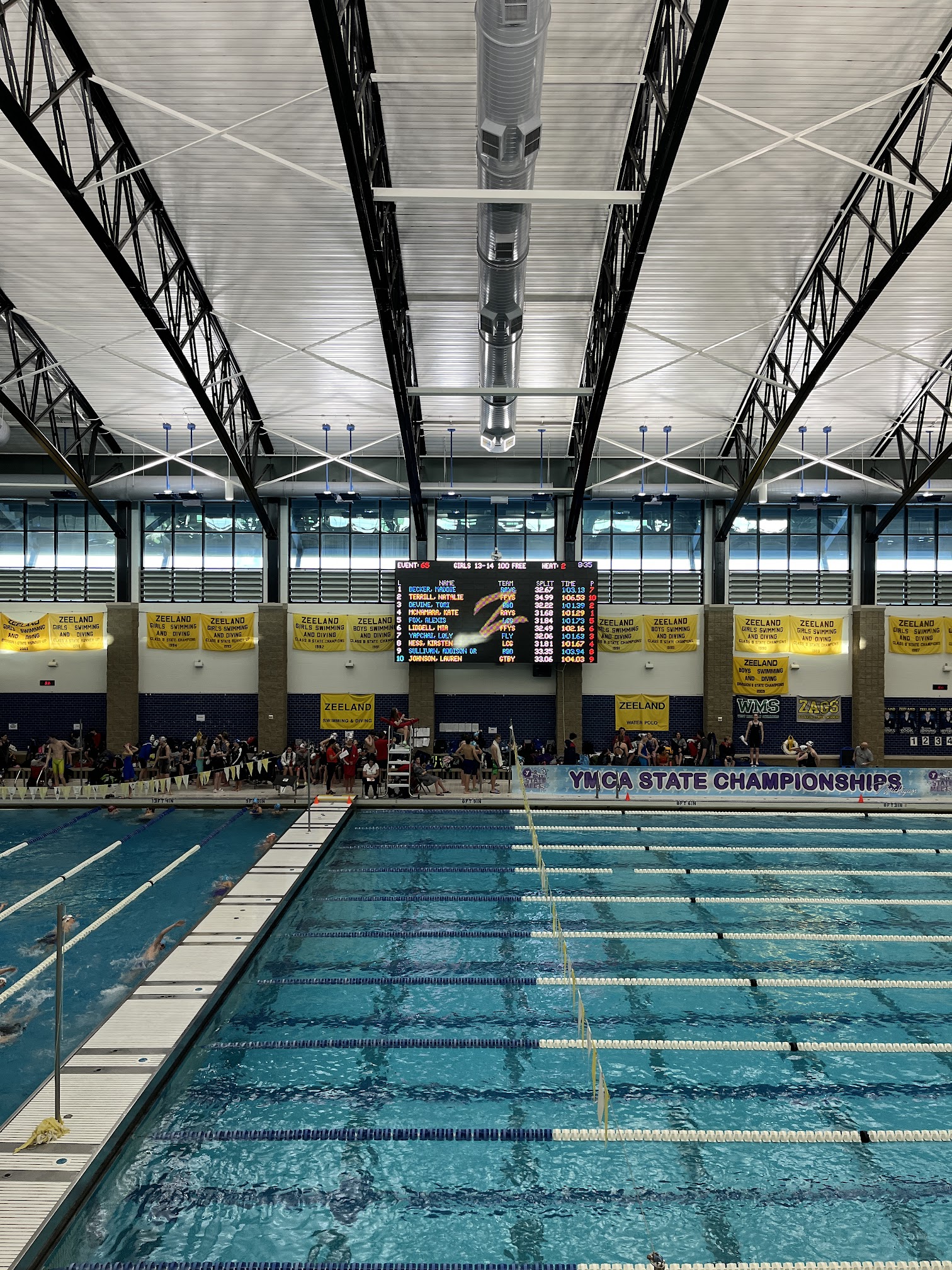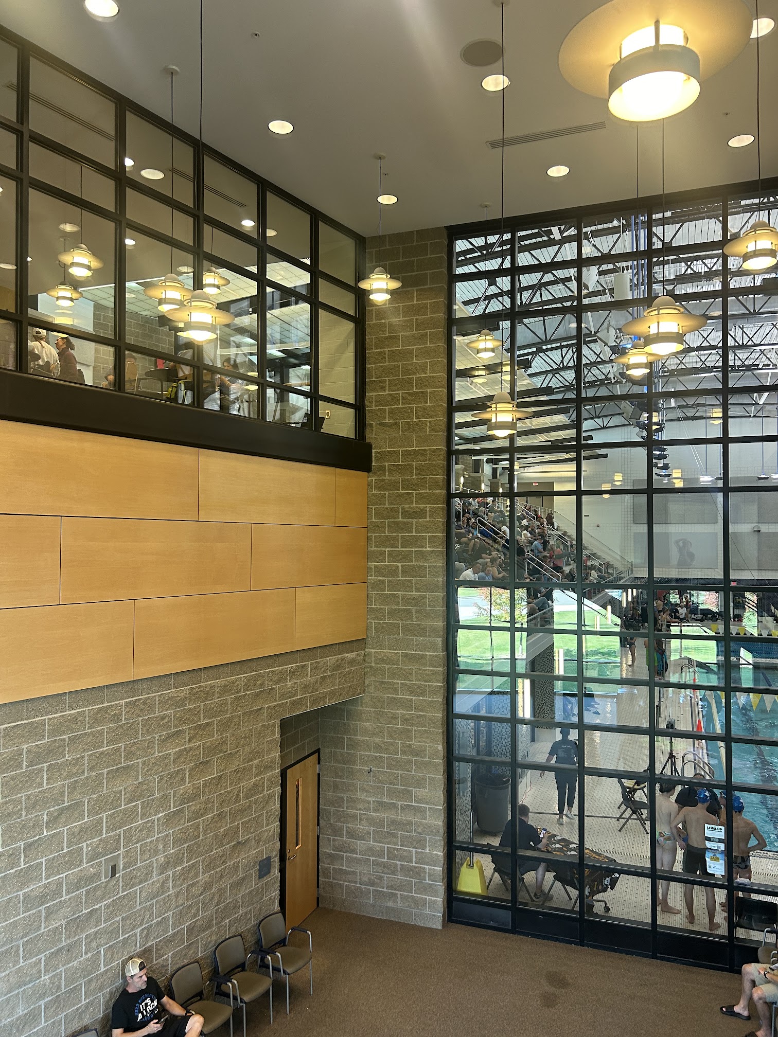 Having a daughter on the high school swim team and a daughter on the middle school swim team has me sitting in natatoriums all around west michigan. This is probably the best pool to be a spectator at. The bleacher seats are not very uncomfortable and there is a bit of a back rest. The new sound system and scoreboard is awesome.