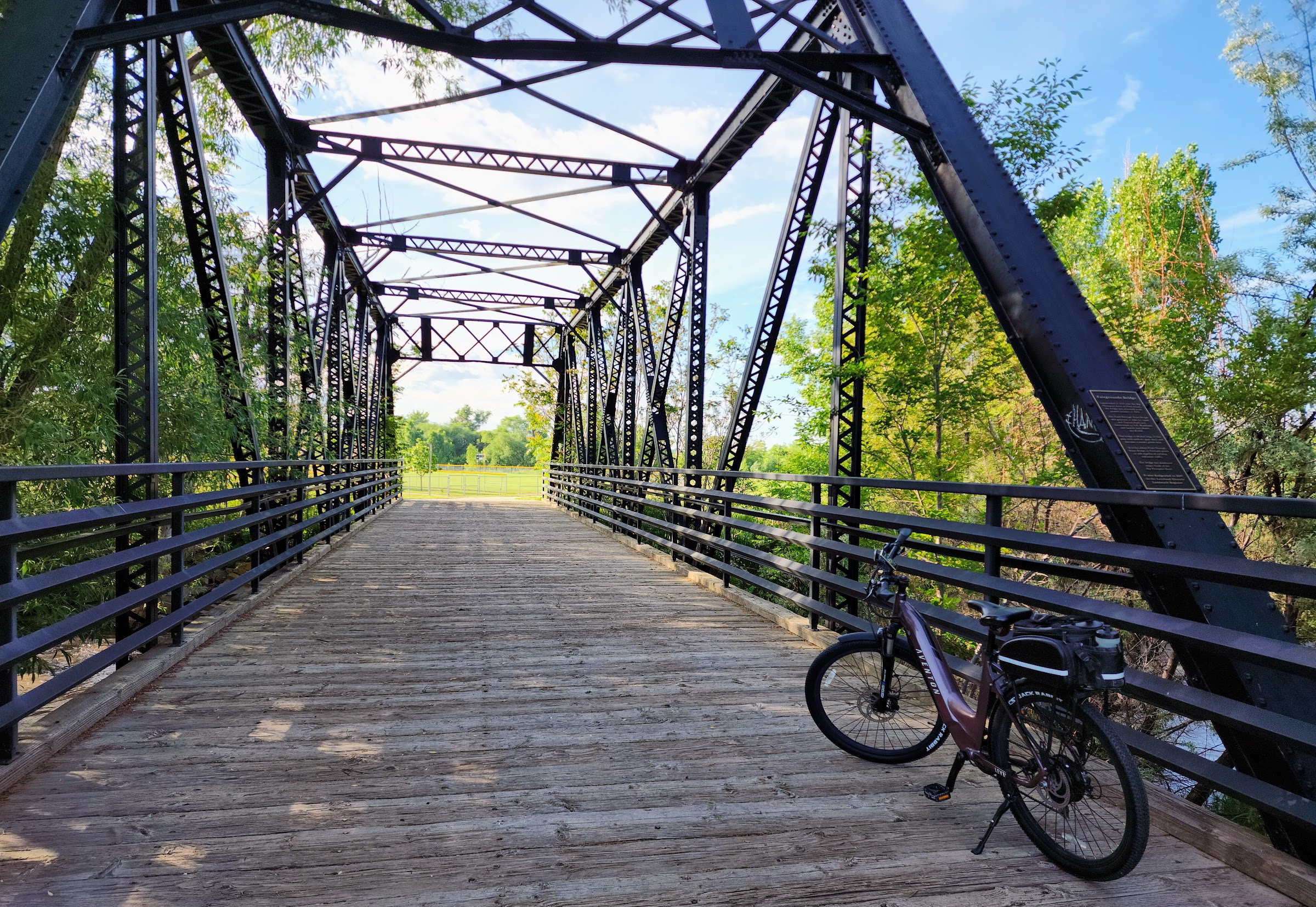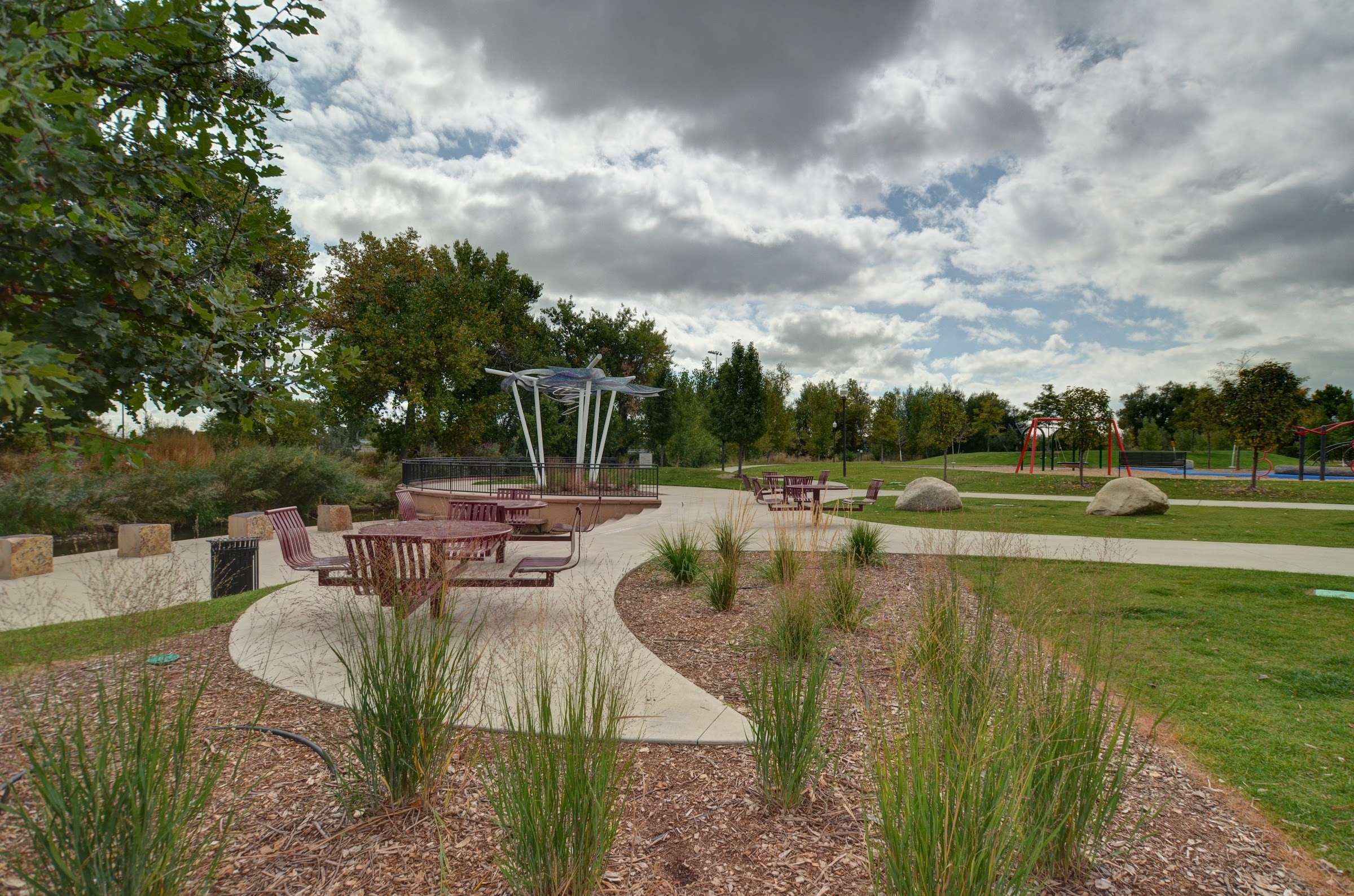 Exercise trail with workout challenge stops. Trails for walking and biking, fun playgrounds; one even for little ones under shade. Water park and a place that one can play in the river. There's so many tables and shade ; if you are doing a large party it's best to reserve your spot.