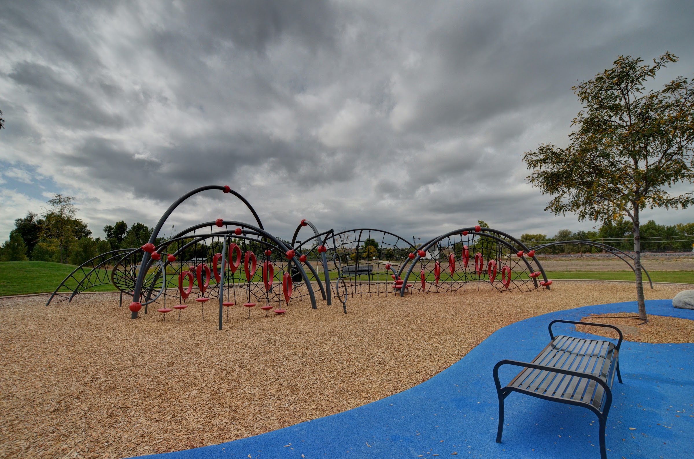 Family-friendly green space featuring a play area and a skate park, as well as a fountain and splash pad.