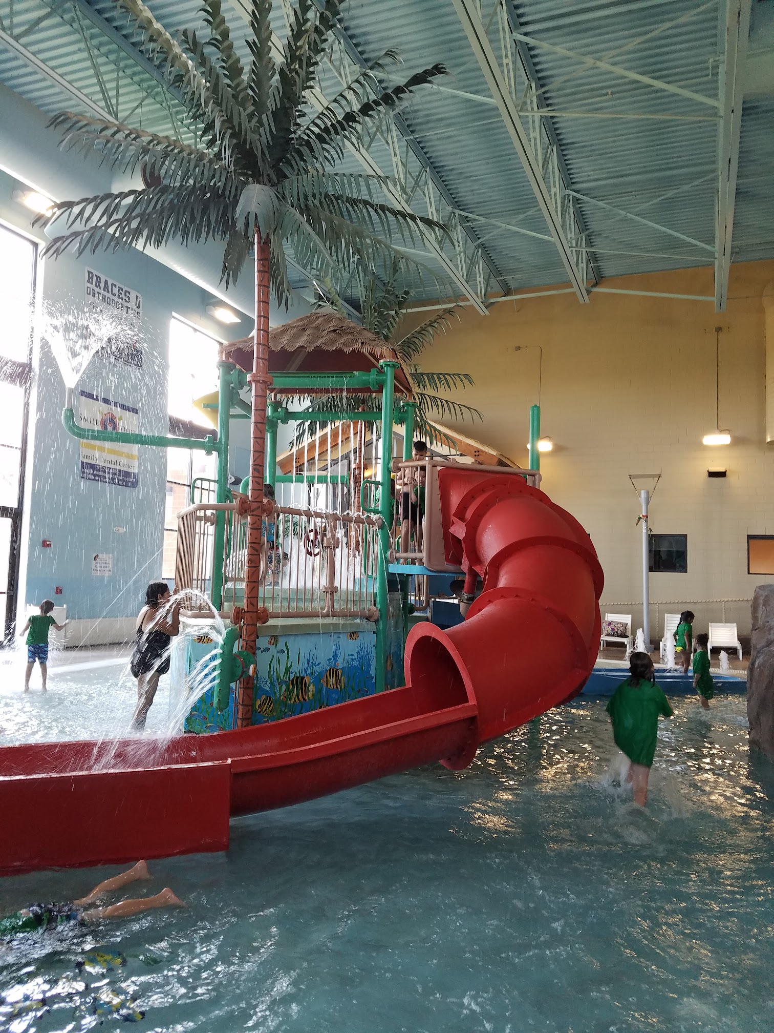 Family-friendly rec center featuring a pool and a water park, plus a gym with courts for various sports.
