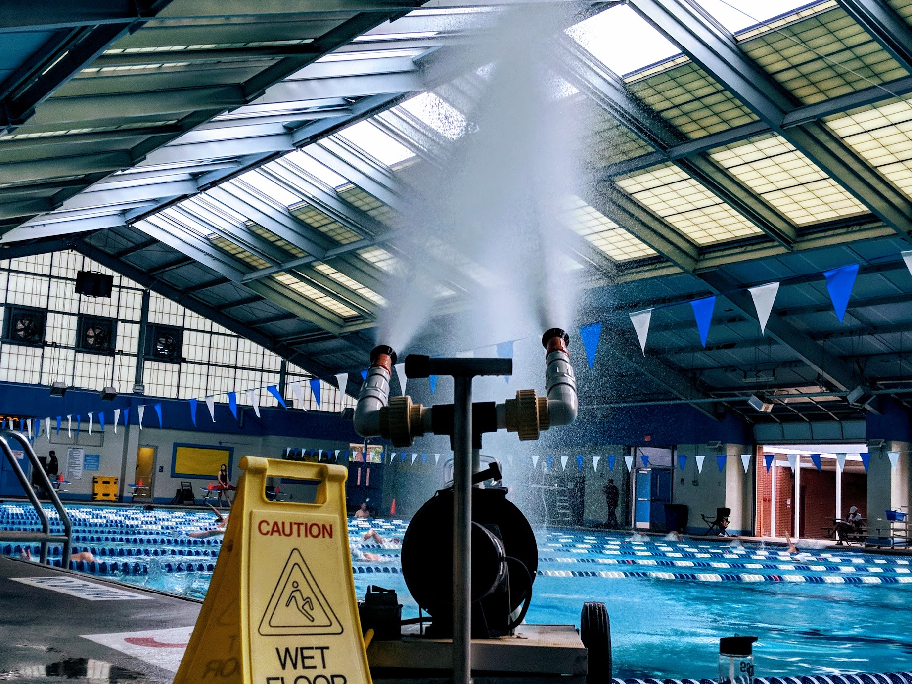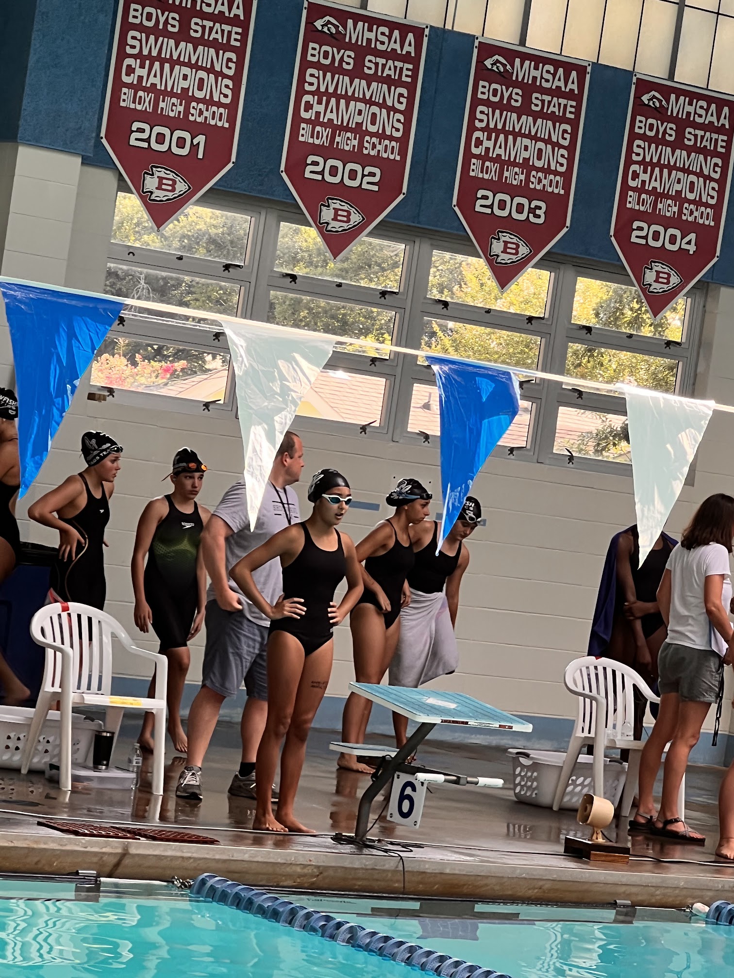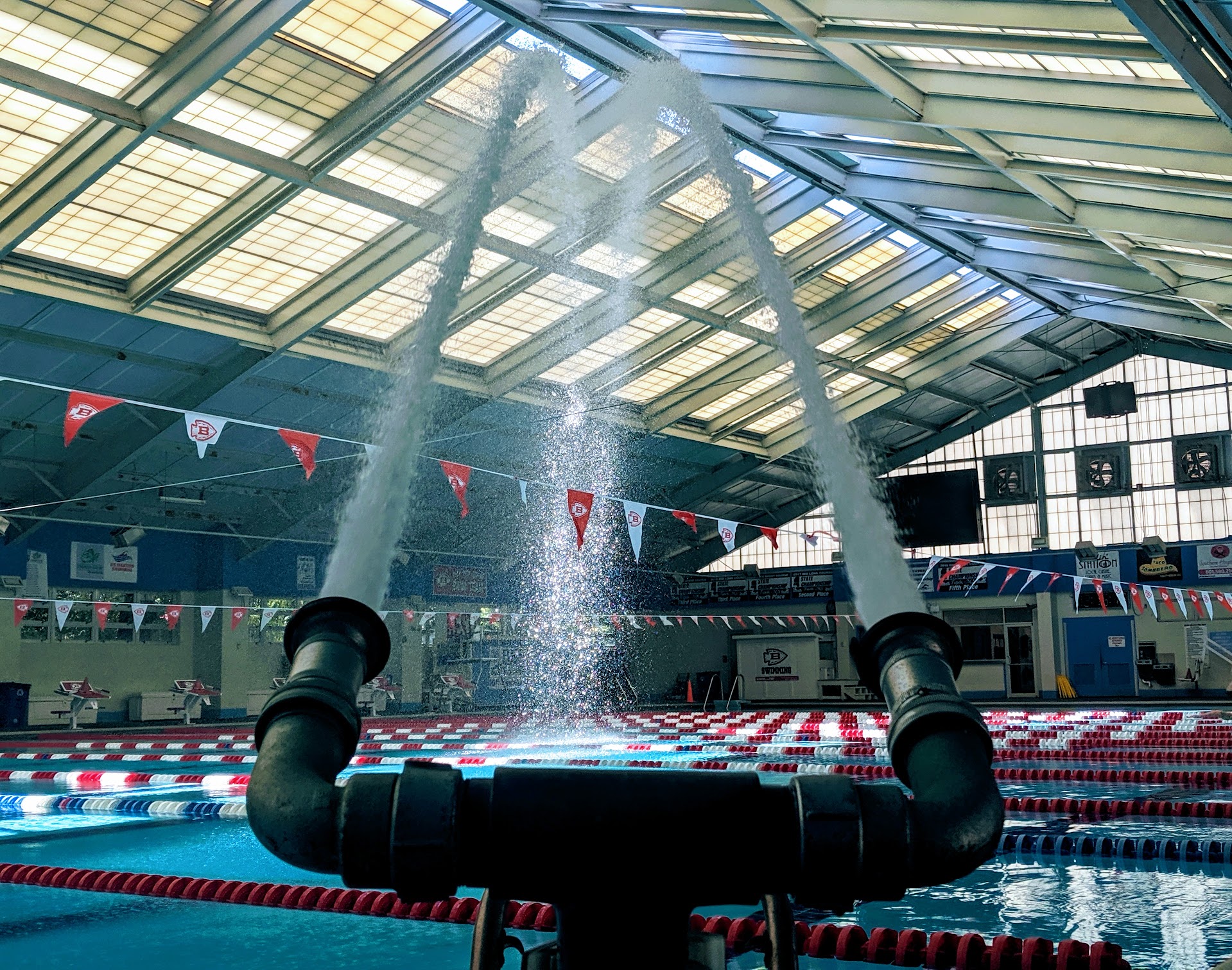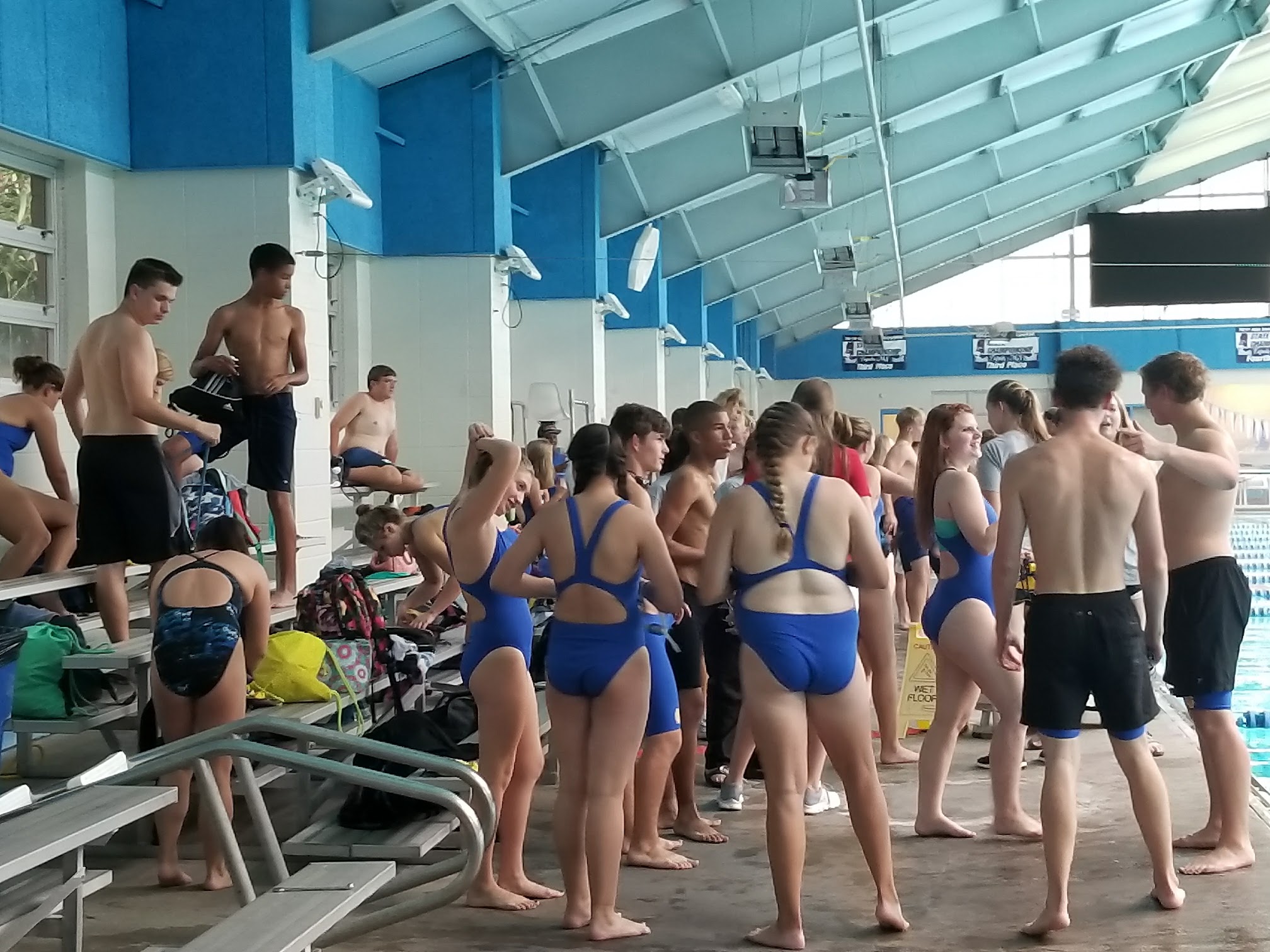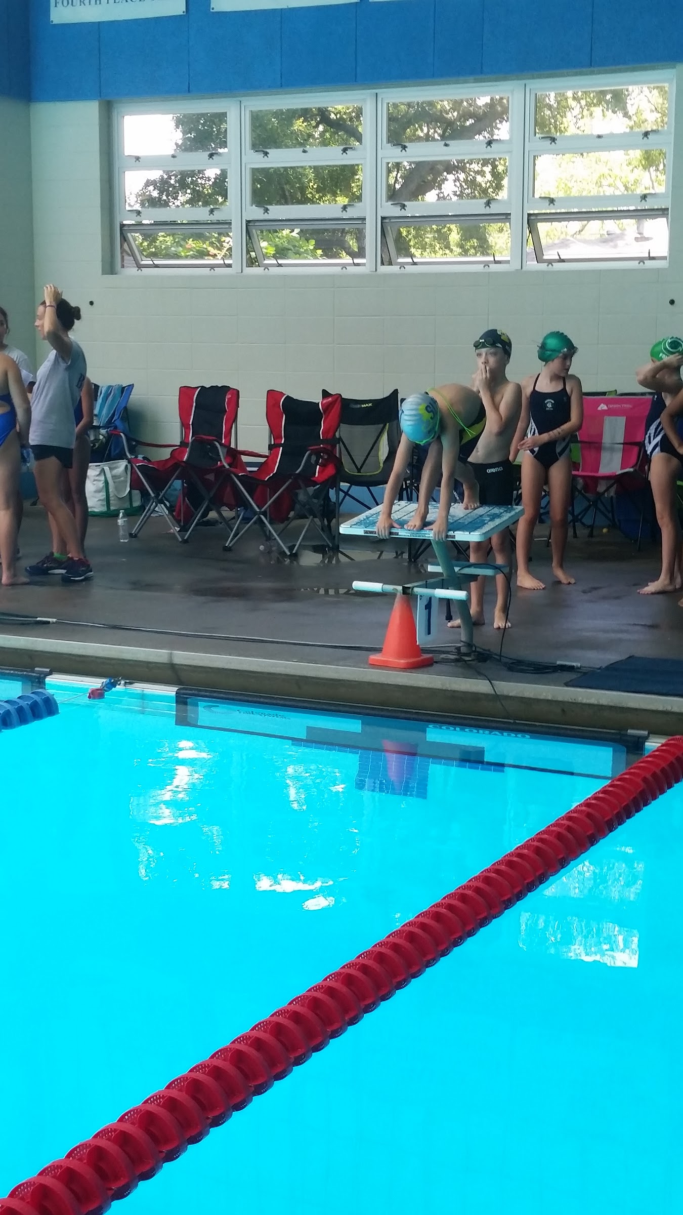 Same set up as many indoor/outdoor seating areas for big swim meets. The sun was blinding from the bleacher side mid morning… but if you sit right outside the building you can catch a breeze and dodge the sun. There were ample restrooms for visitors and swimmers as well. No complaints… except the limited parking area.