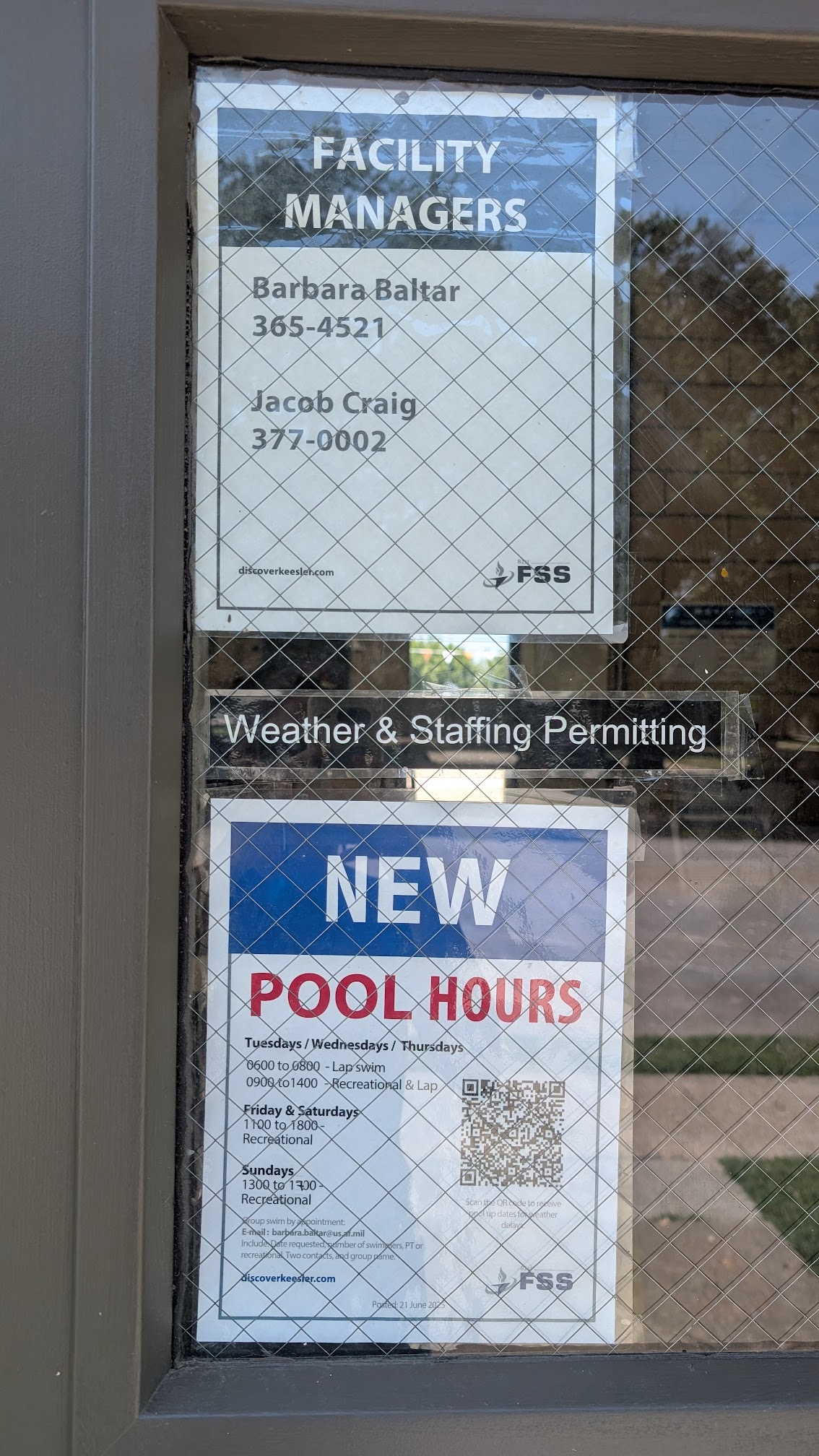 What are people saying (AI review summary)? The pool receives mixed reviews, primarily concerning its inconsistent accessibility. Many users report highly limited and unreliable operating hours, often due to staffing shortages (lack of lifeguards leading to closures or rapid capacity limits). Communication is a major point of frustration, with outdated website information, incorrect phone numbers, and staff often unsure of opening times. Despite these issues, the pool itself is generally described as decent, nice, and a good size, suitable for training (including SCUBA through local dive shop collaboration), lap swimming, and play. For those with base access, it offers free swimming. While some positive experiences mention sufficient lifeguards and extended hours (up to 6 PM), these appear to be less consistent than the widespread complaints about availability.