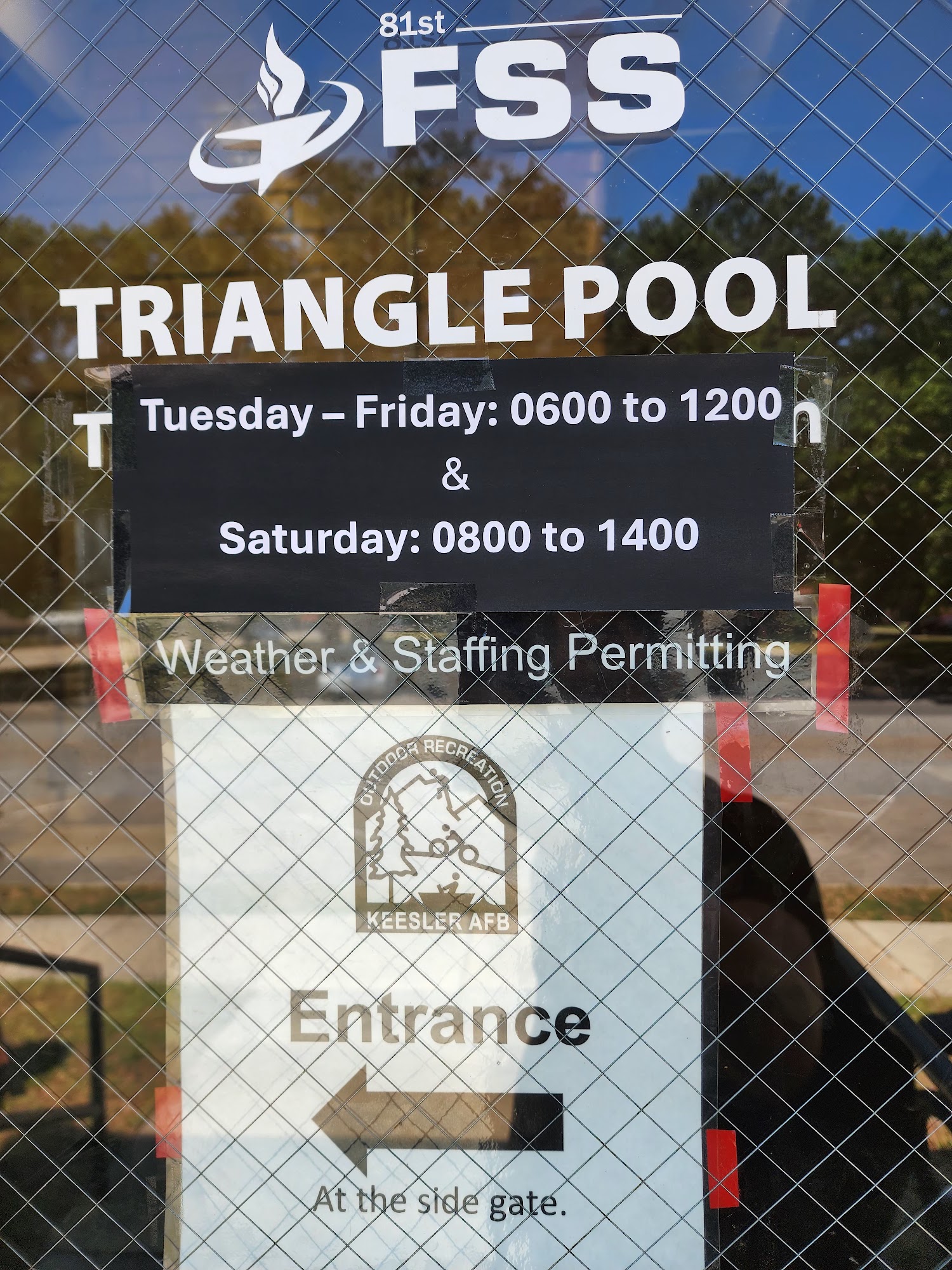 Triangle Pool, Bldg 7506, located at 7506 Galaxy St, Biloxi, MS, is an outdoor recreational swimming facility primarily serving the Keesler Air Force Base community. It typically operates during warmer months, offering a place for leisure and aquatic activities for military personnel and their families.