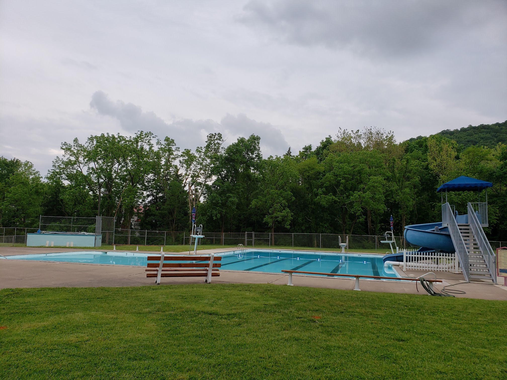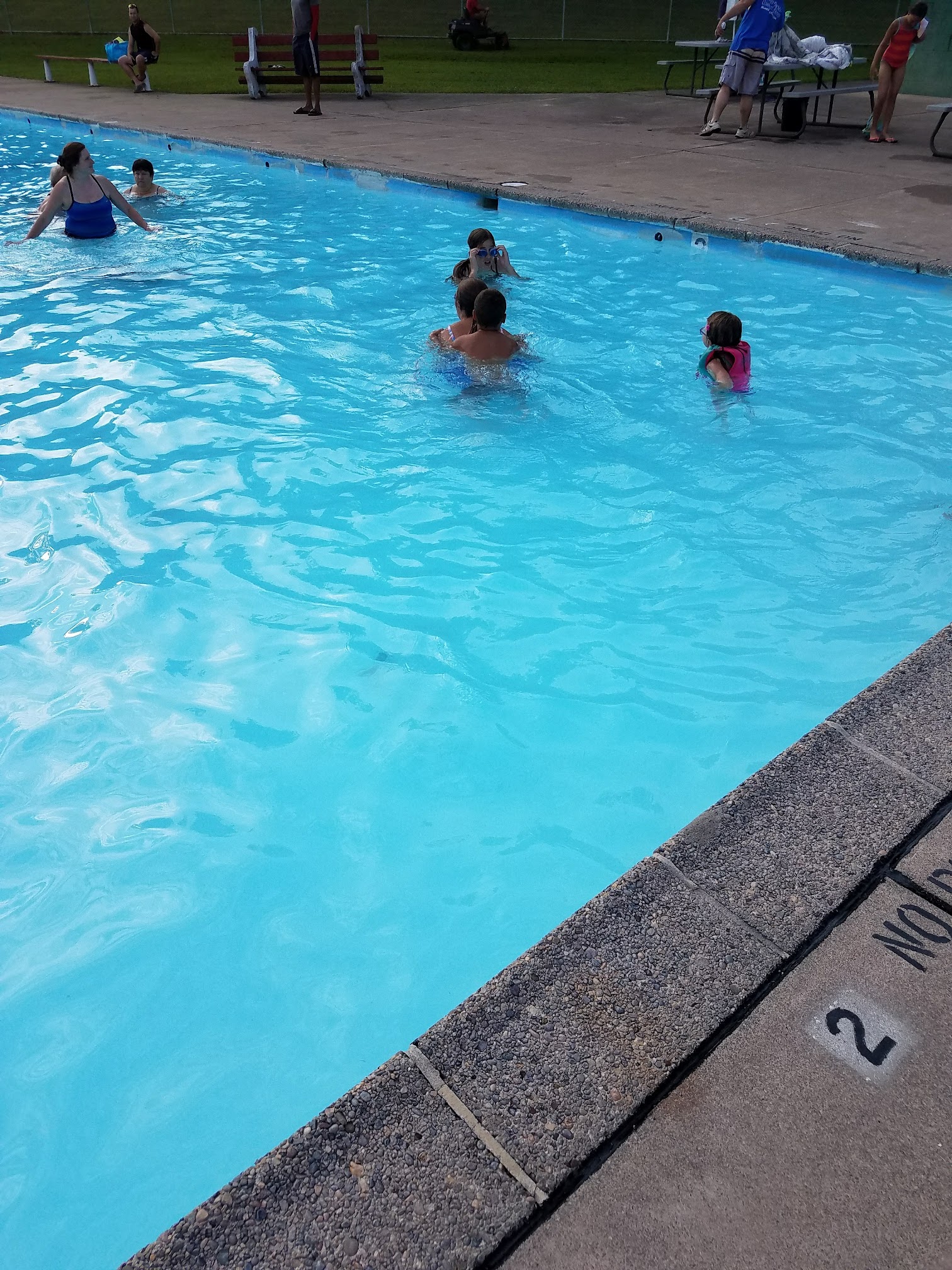 Not too crowded. Drinks, food, bathrooms avaliable. $5 for anyone under 60 years old to get in. $3 for seniors. Kiddy pool, slide, and diving board. Also a pavilion outside of the pool for events.