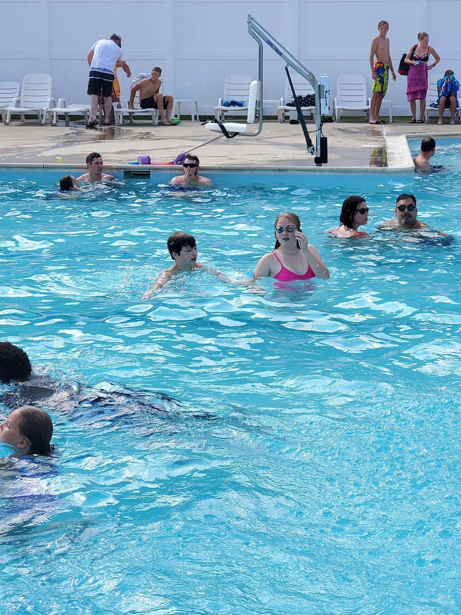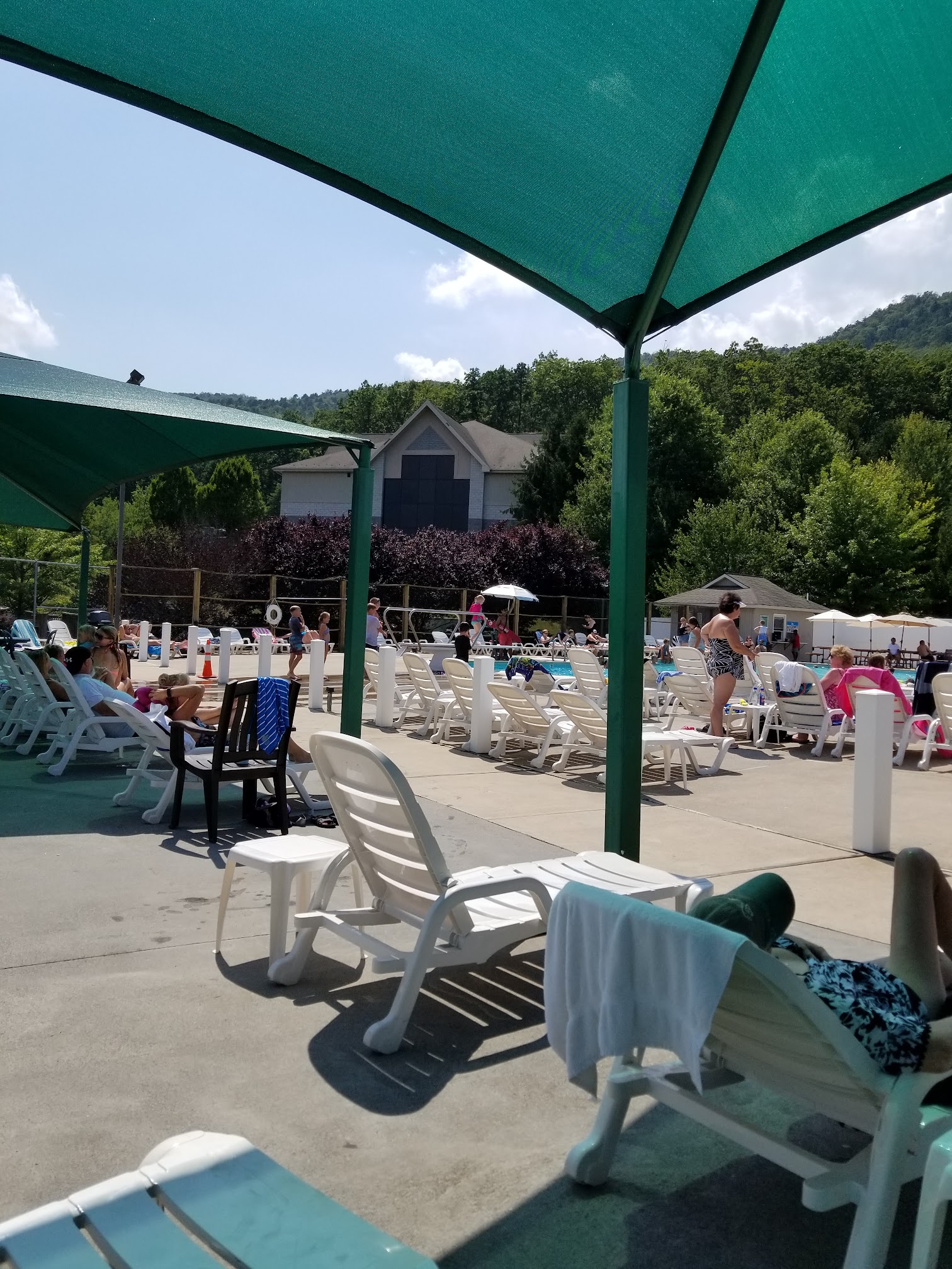 Large pool most 4½' or less. Has diving well with one board. Baby pool for 5 and under. Changing and restroom facility satisfactory. Snack bar on site. Lots of chairs and loungers. Has shaded area and a few tables.