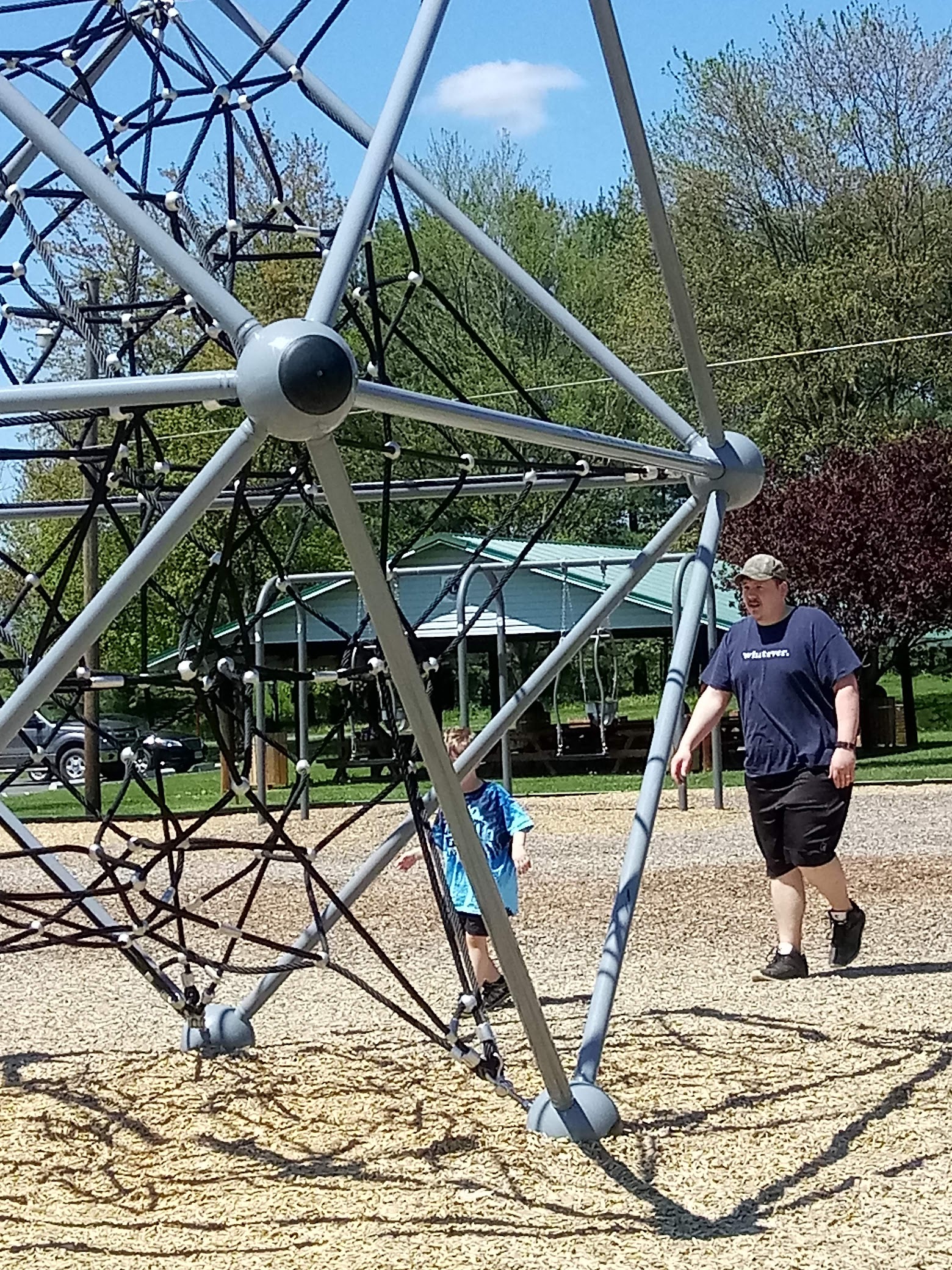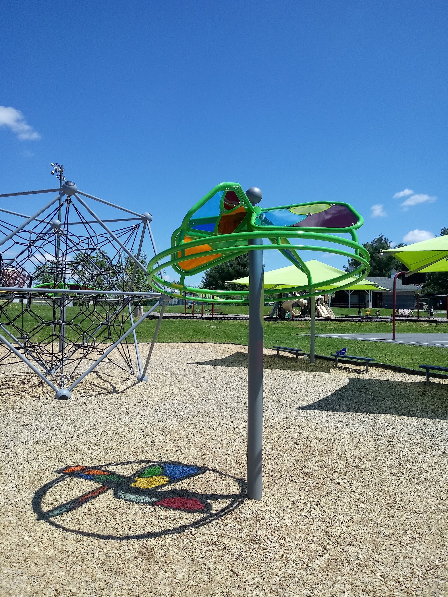 Public swimming pool offering a diving board and a playground in a kid-friendly environment.