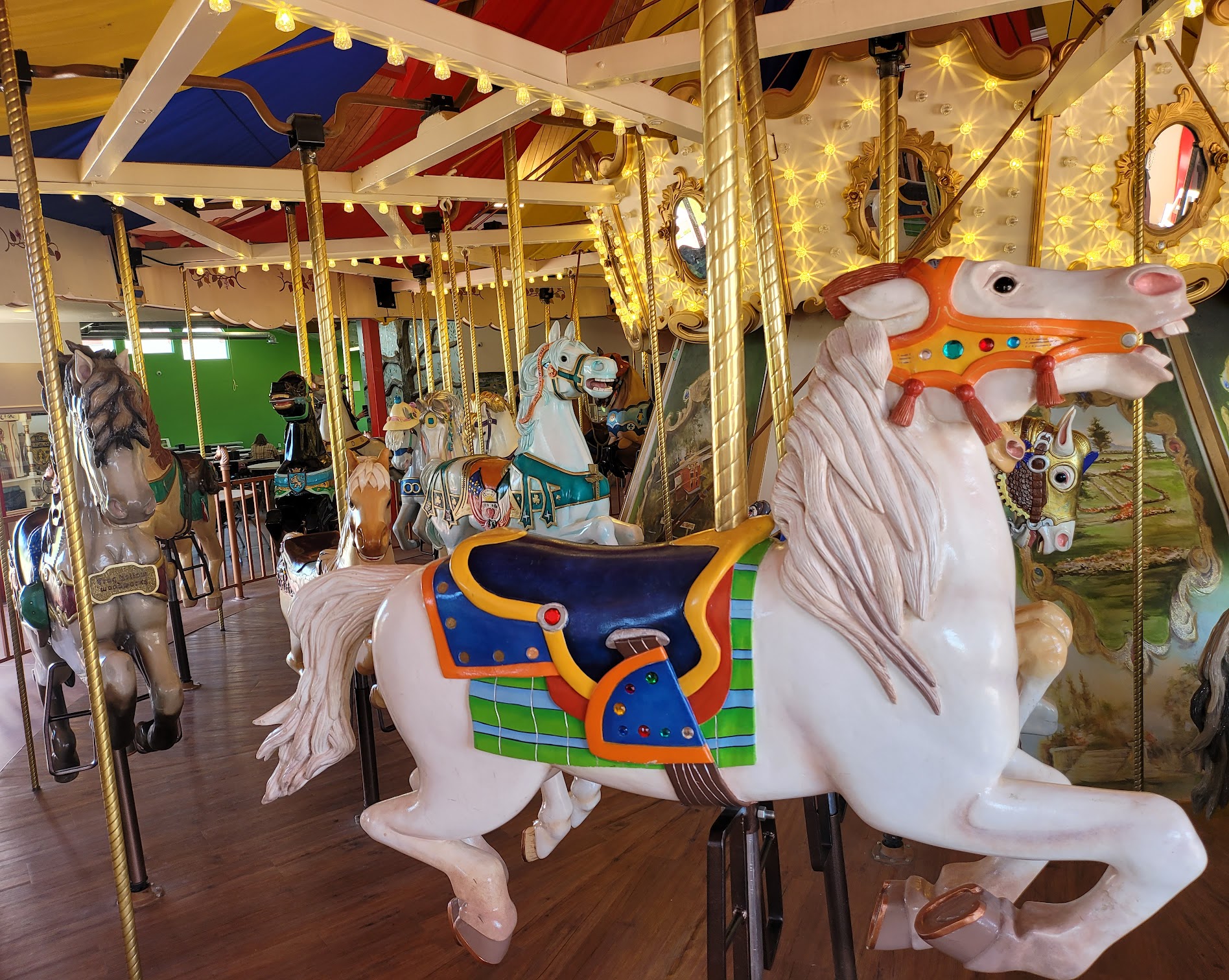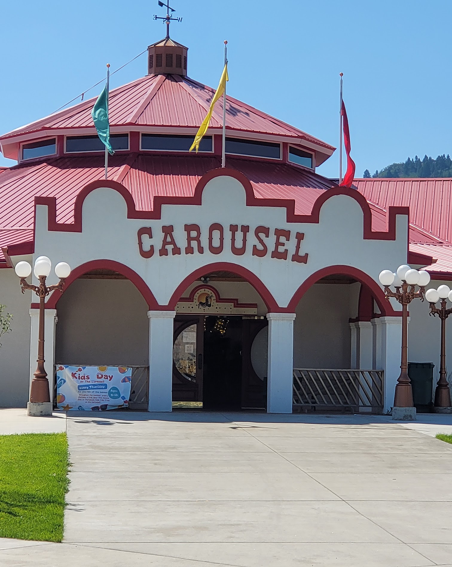 Relaxed facility featuring a heated pool, slides and a lazy river, along with a playground and a carousel.