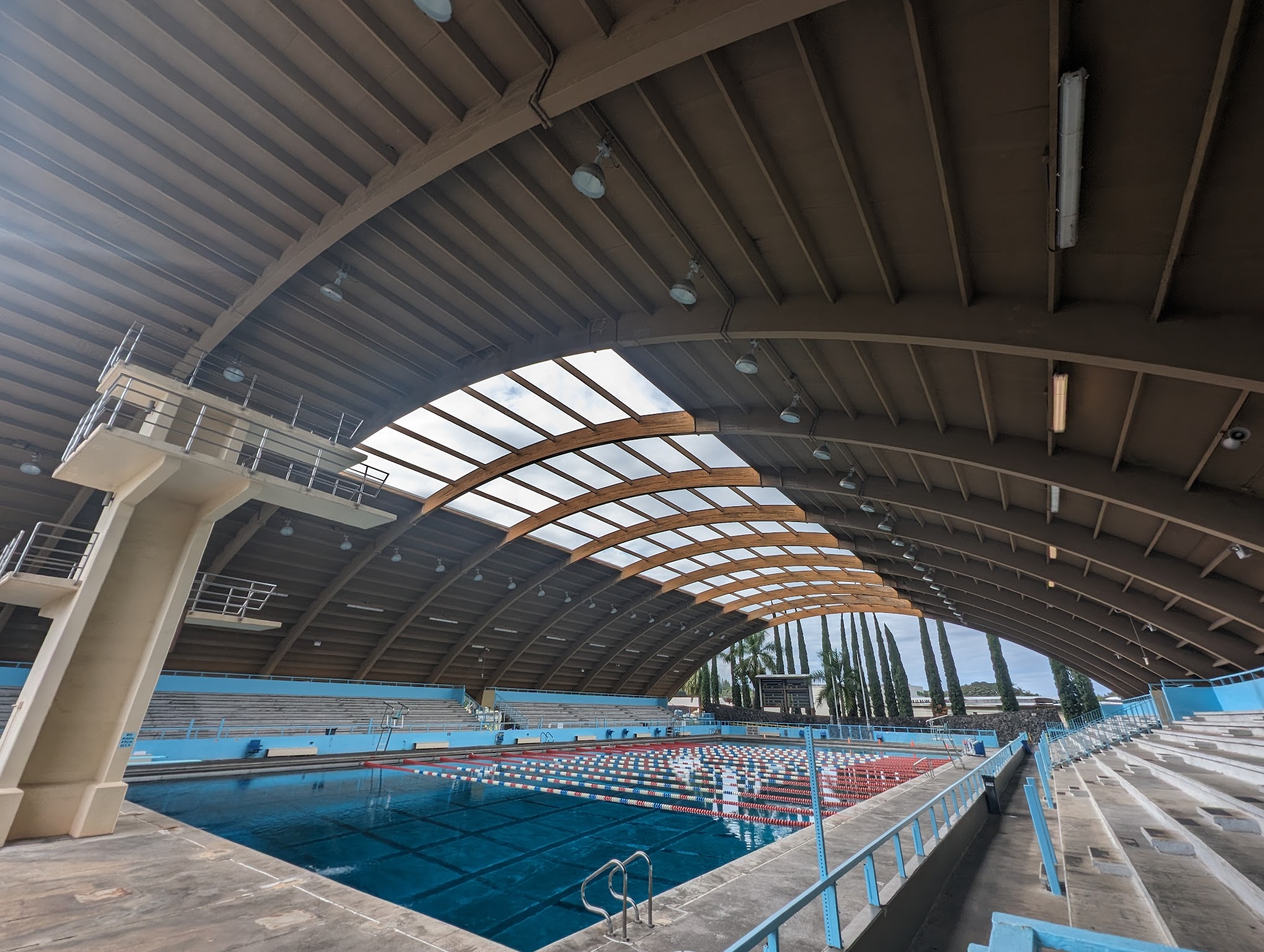 The main 50-meter lap pool at "Sparky" Kawamoto Swim Stadium is typically heated and maintained at approximately 80-82°F (27-28°C). The smaller training/therapy pool is kept warmer, generally around 88-90°F (31-32°C), suitable for therapeutic and instructional purposes.