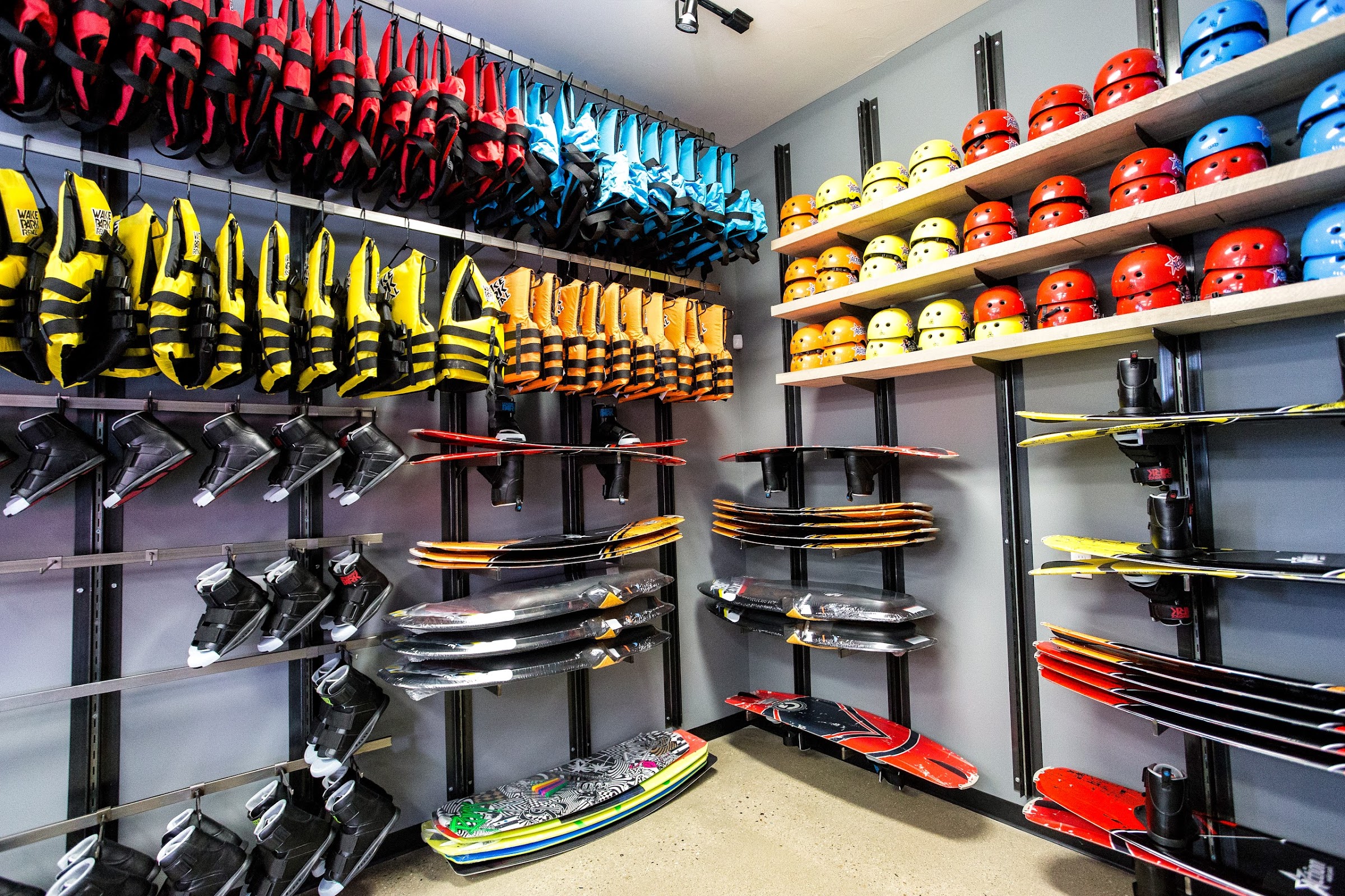 Water sports facility offering equipment rental, wakeboarding lessons, and an inflatable water park.